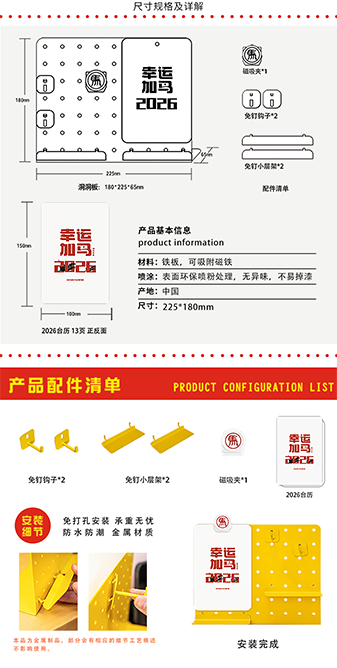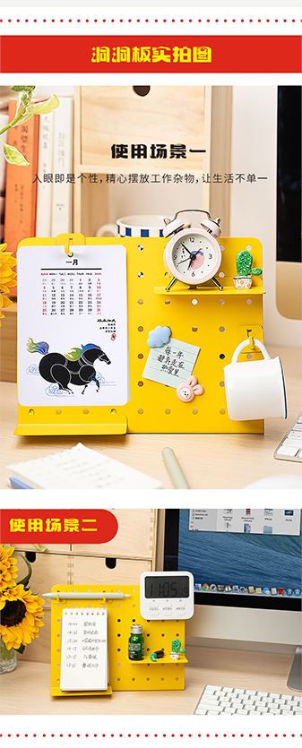 奶黄色桌面洞洞板*1 23cm*18*6.5cm 记事月历*1 10cm*15cm 13张 免钉小层架*1 7.5cm*4.5cm 包装盒尺寸: 27.5*23.3*10.5cm