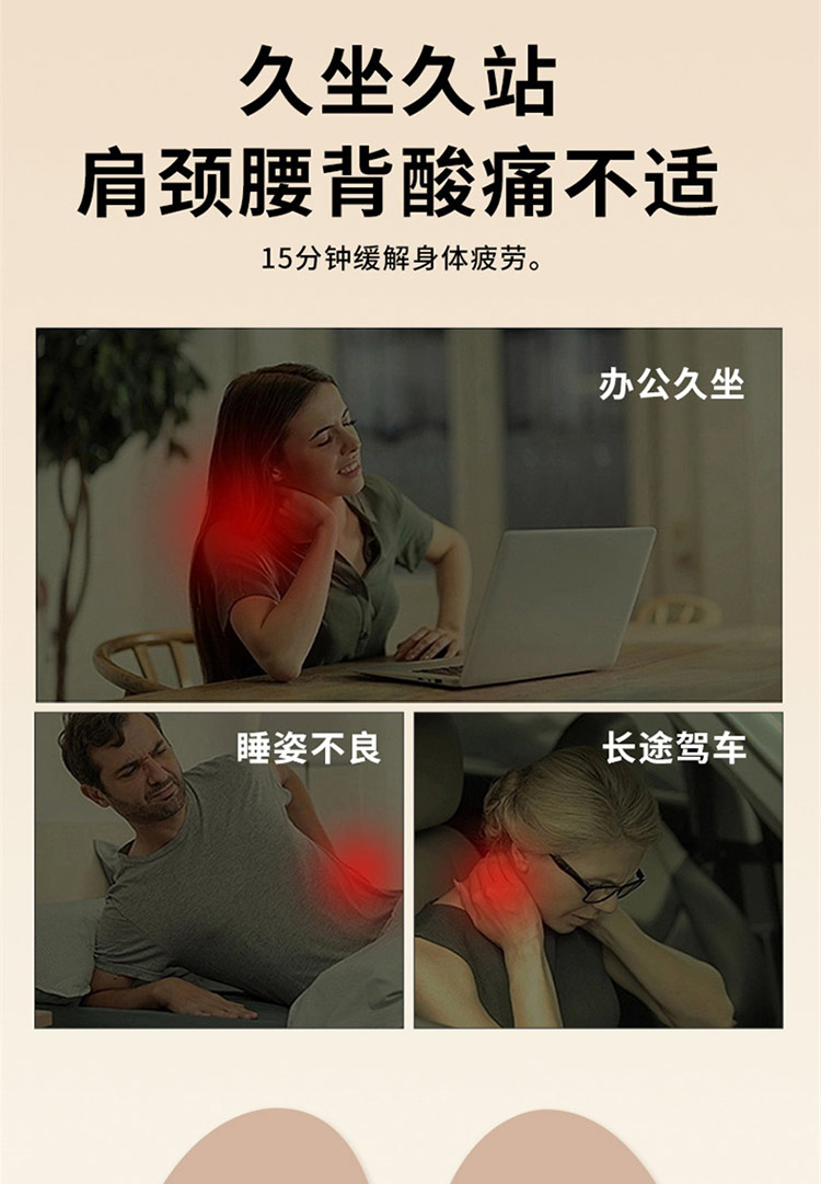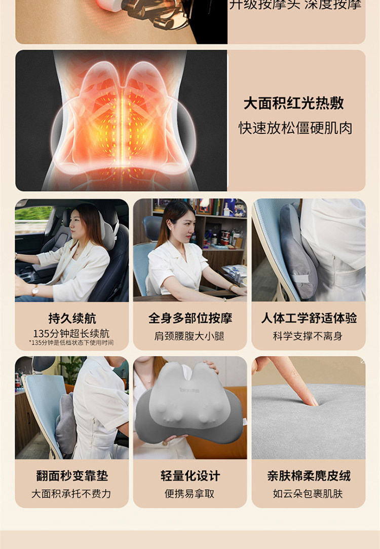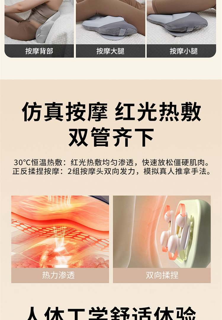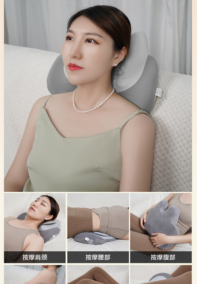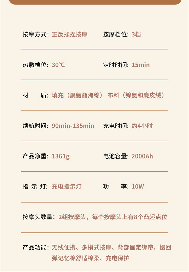 颜色:灰色 按摩档位:3档 热敷温度:30℃ 定时时间:15min 续航时间:90-135min 充电时间:4小时 正反揉捏按摩 升级按摩头,2组按摩头,16个按摩凸起点位 大面积红光热敷 人体工学慢回弹记忆棉 全身多部位按摩,颈部、腰部、腹部、背部、大腿、小腿 固定绑带设计,办公/居家/车载多场景稳固贴合