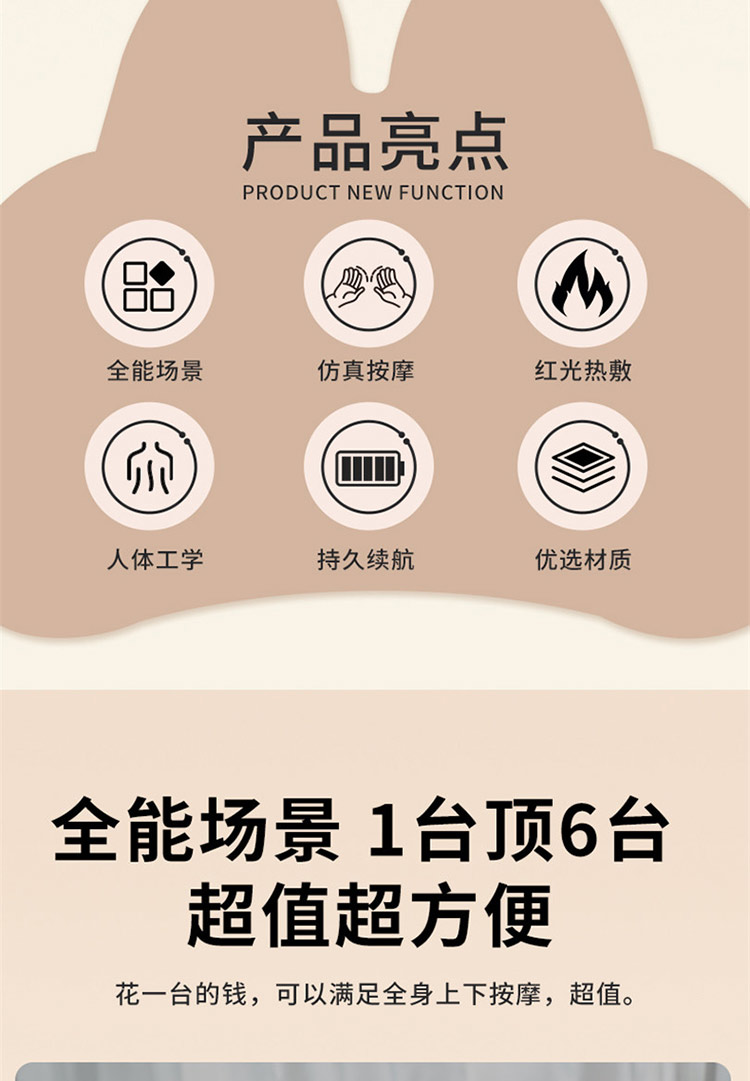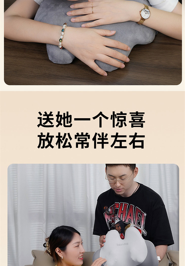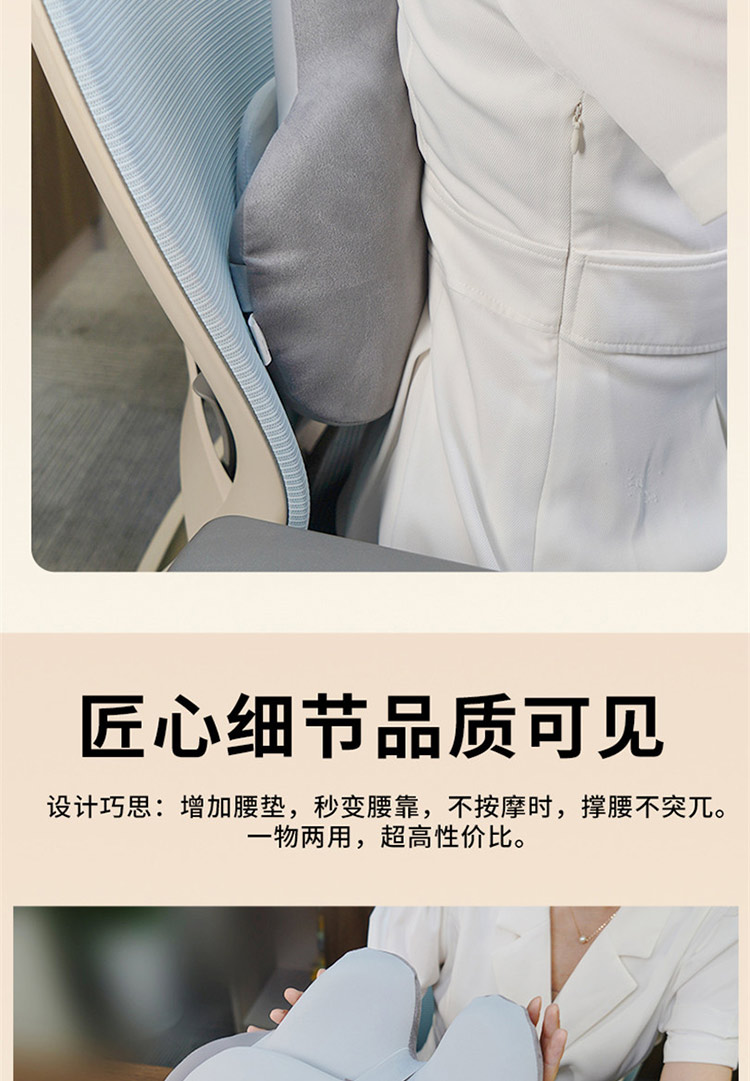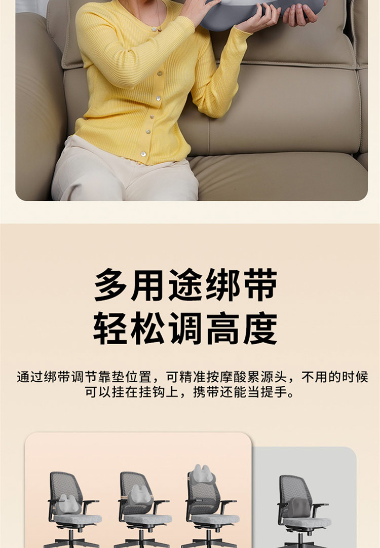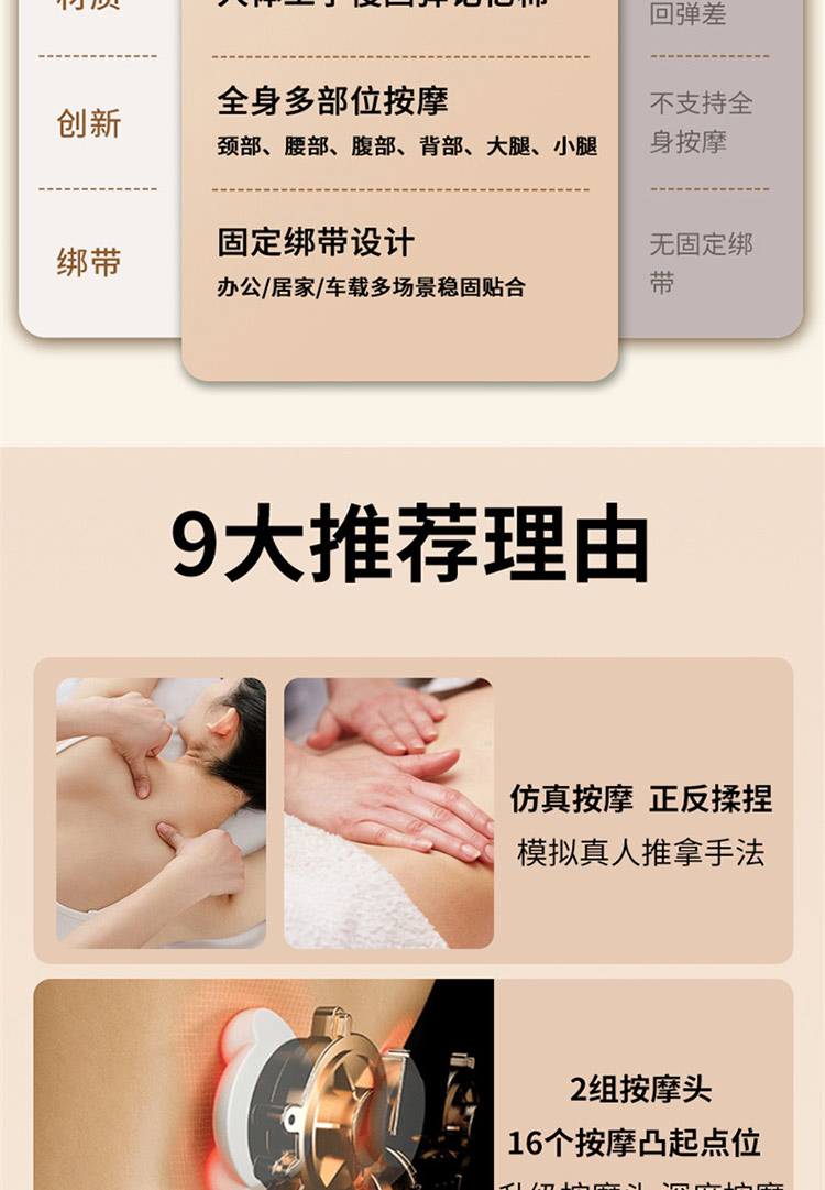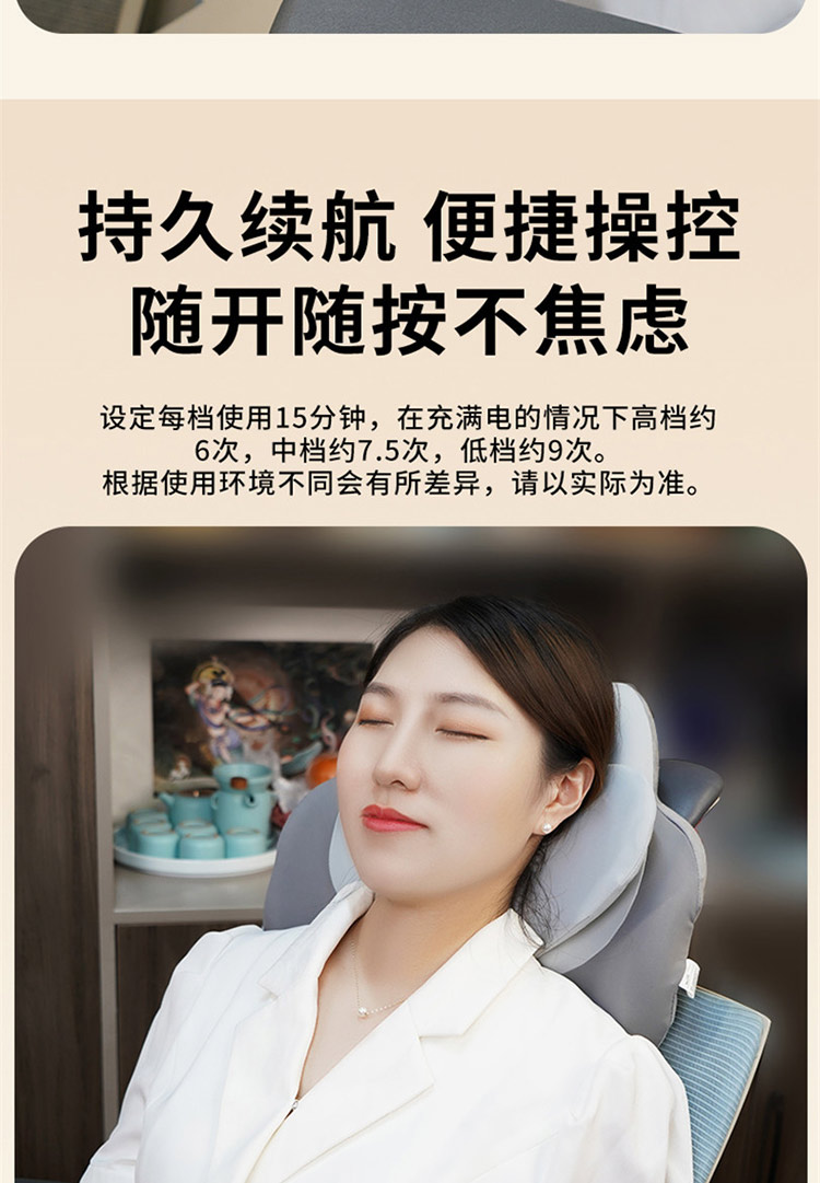 颜色:灰色 按摩档位:3档 热敷温度:30℃ 定时时间:15min 续航时间:90-135min 充电时间:4小时 正反揉捏按摩 升级按摩头,2组按摩头,16个按摩凸起点位 大面积红光热敷 人体工学慢回弹记忆棉 全身多部位按摩,颈部、腰部、腹部、背部、大腿、小腿 固定绑带设计,办公/居家/车载多场景稳固贴合