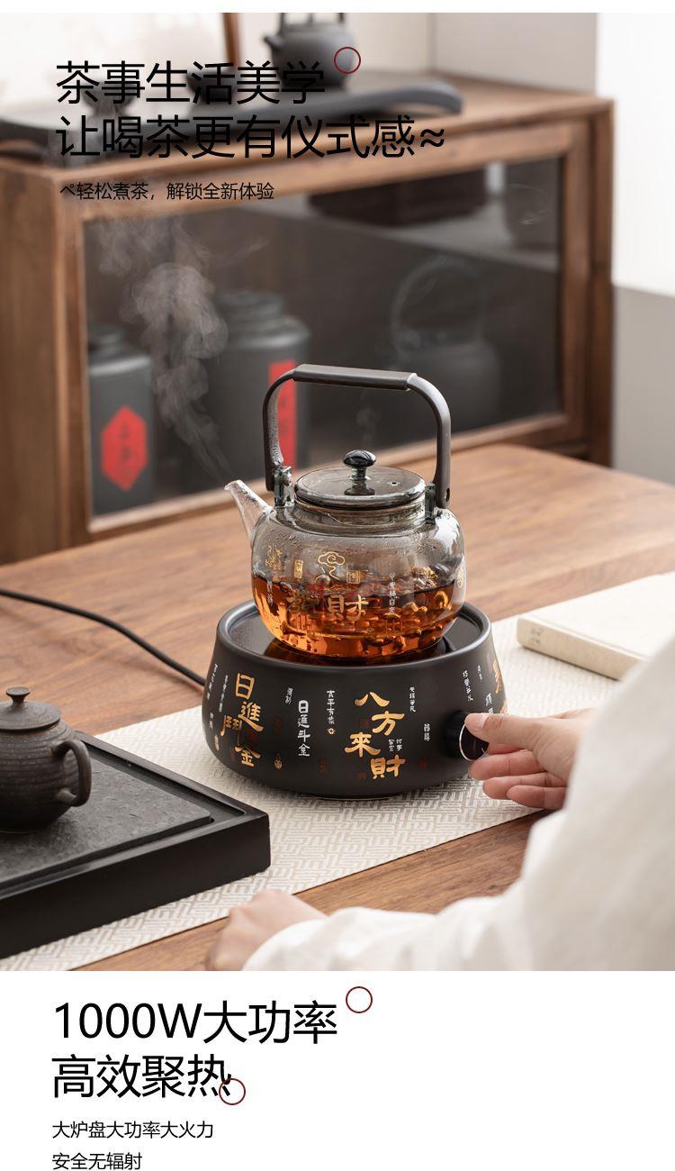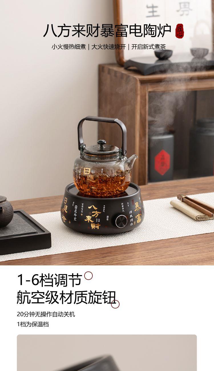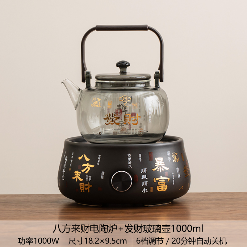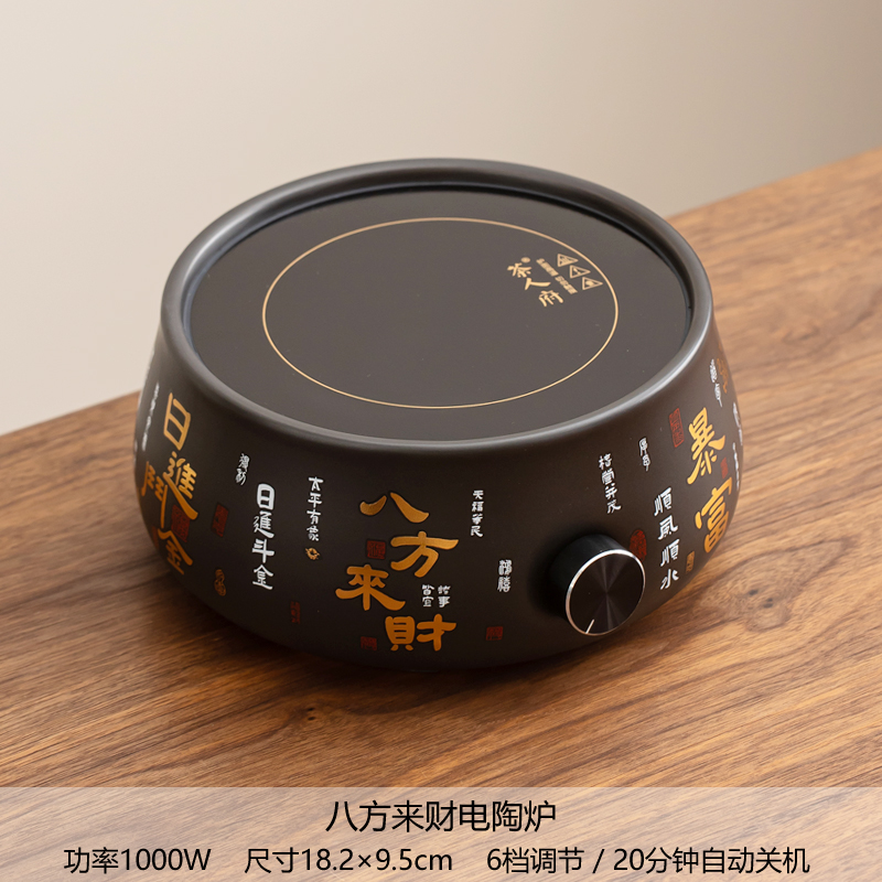额定电压:220v 额定功率:1000w 航天级材质,旋钮1-6档调节 进口黑色微晶面板,导热均匀效率高 大炉盘大功率大火力,安全无辐射 中式烫金浮雕工艺,画面立体感十足 满满的吉祥祝福“八方来财、日进斗金”