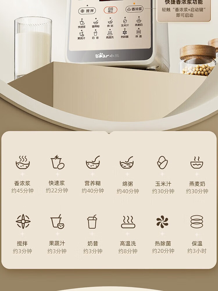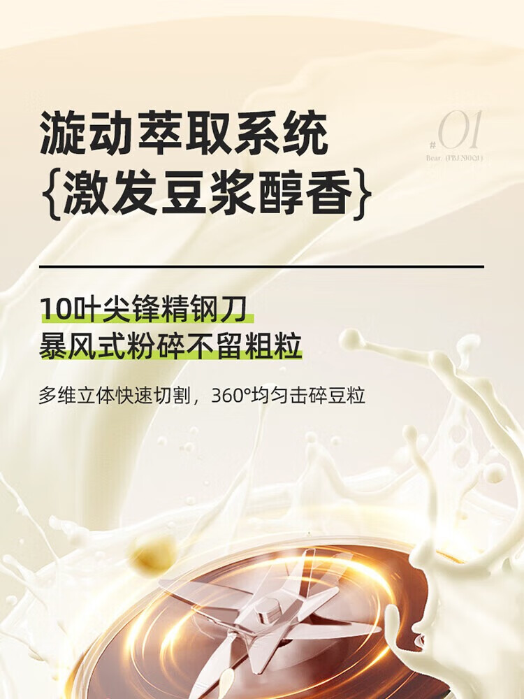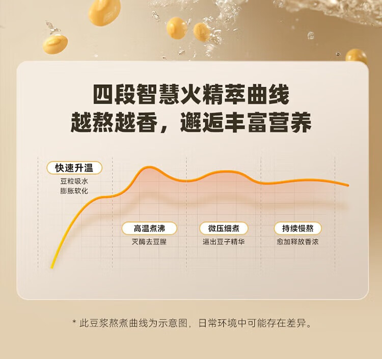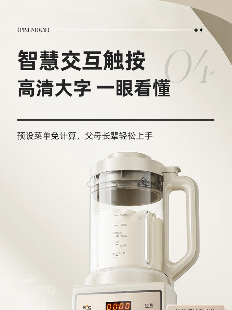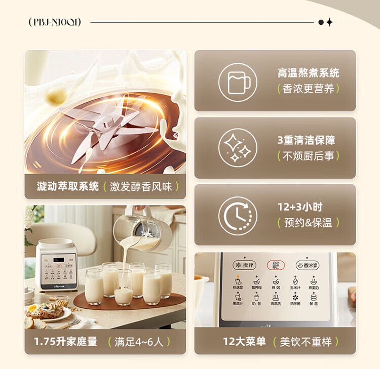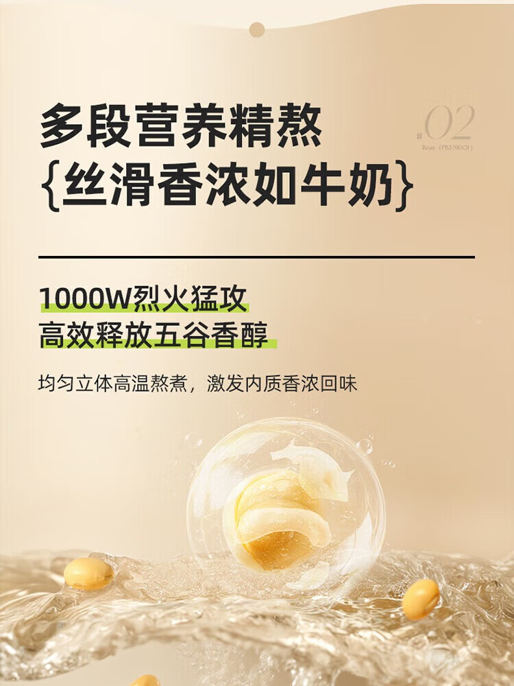 1、干豆直打免滤,丝滑营养好吸收 2、漩动萃取系统,激发豆浆醇香 3、多段营养精熬,丝滑香浓如牛奶 4、1.75升欢享量,满载全家幸福畅饮 5、智慧交互触按,高清大字一眼看懂