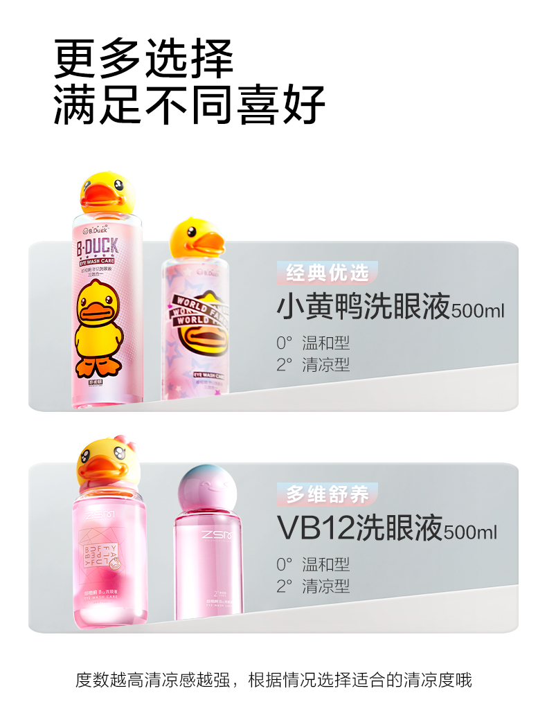 500ml 1.深层清洁眼部灰尘、眼妆残留、蛋白沉淀等异物。 2.添加维生素B12、海藻糖、牛磺酸等营养成分,水润滋养眼部 3.pH值、渗透压接近泪液,温和洗眼,不刺激眼睛。 4.两种清凉度可选,自由选择合适的清凉度。 5.小黄鸭外包装升级,解鸭加倍