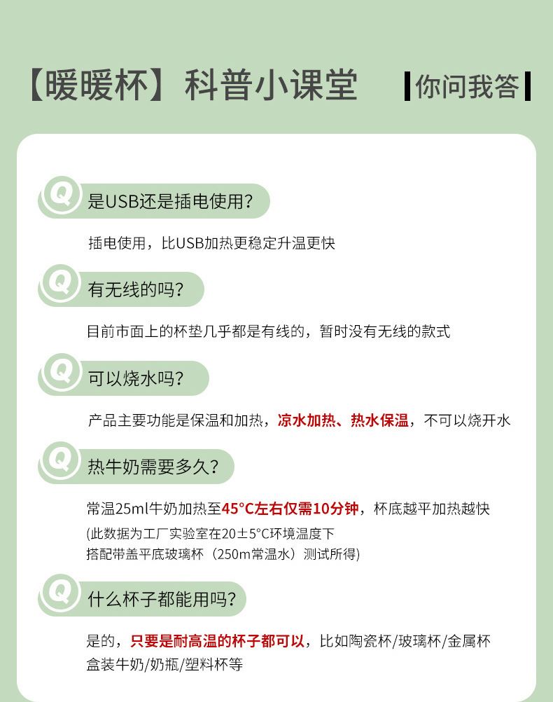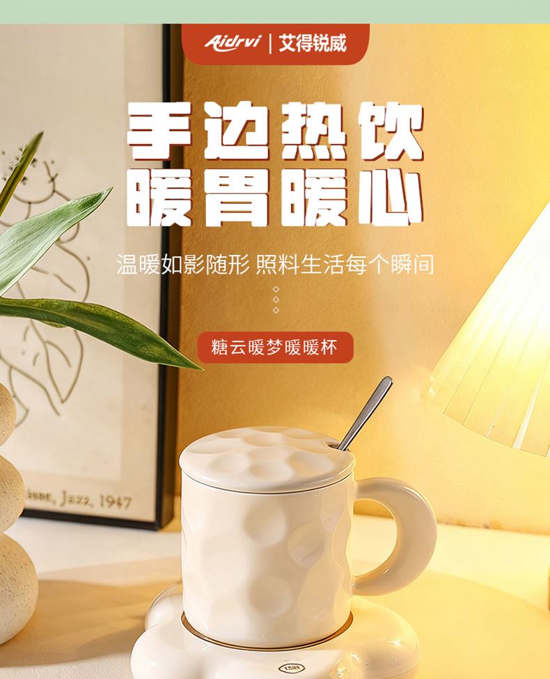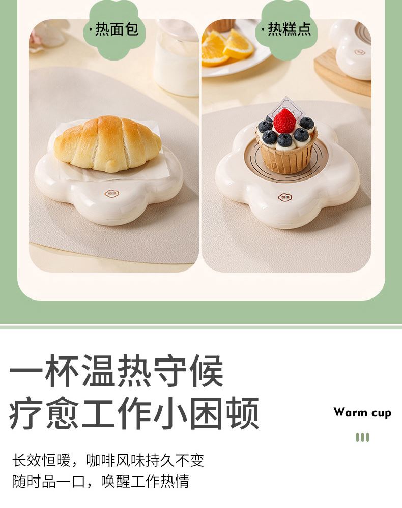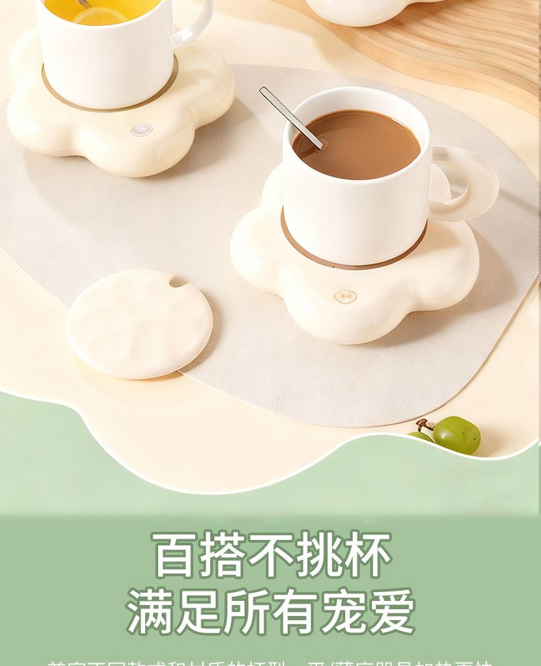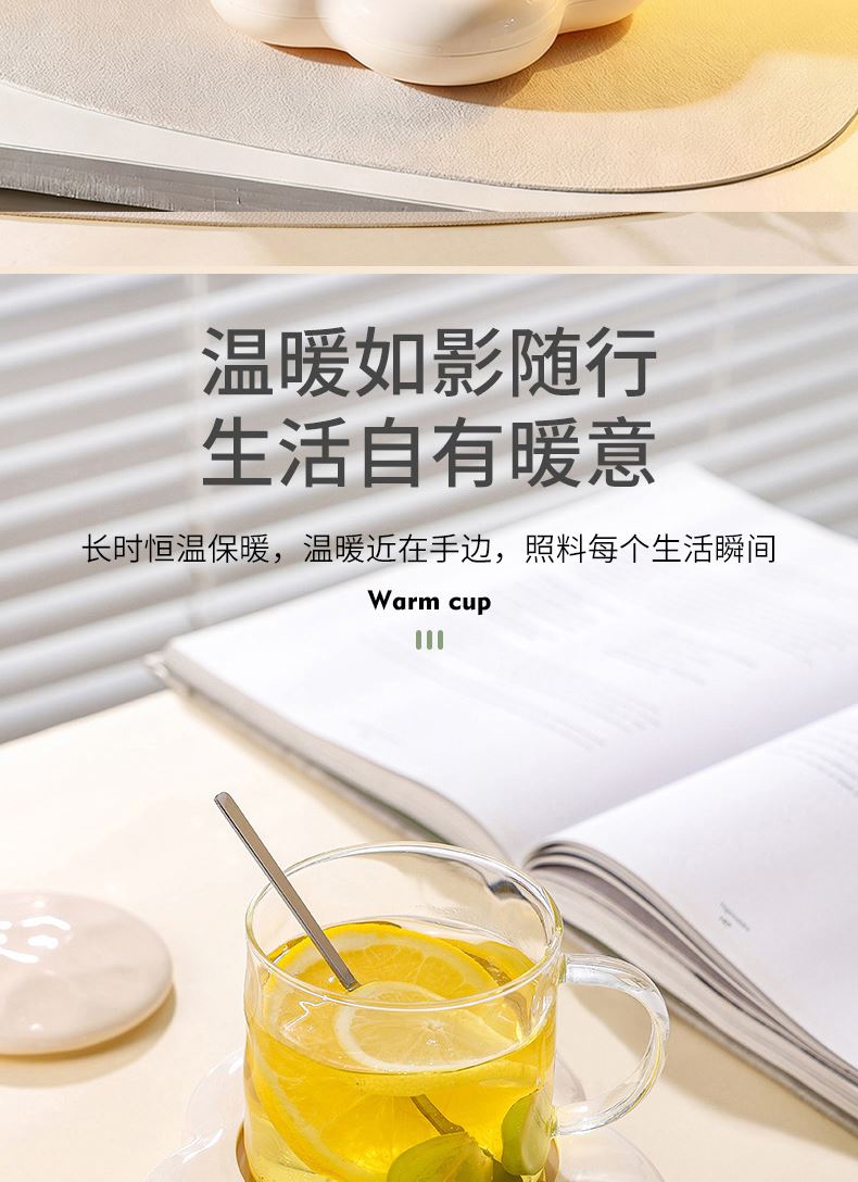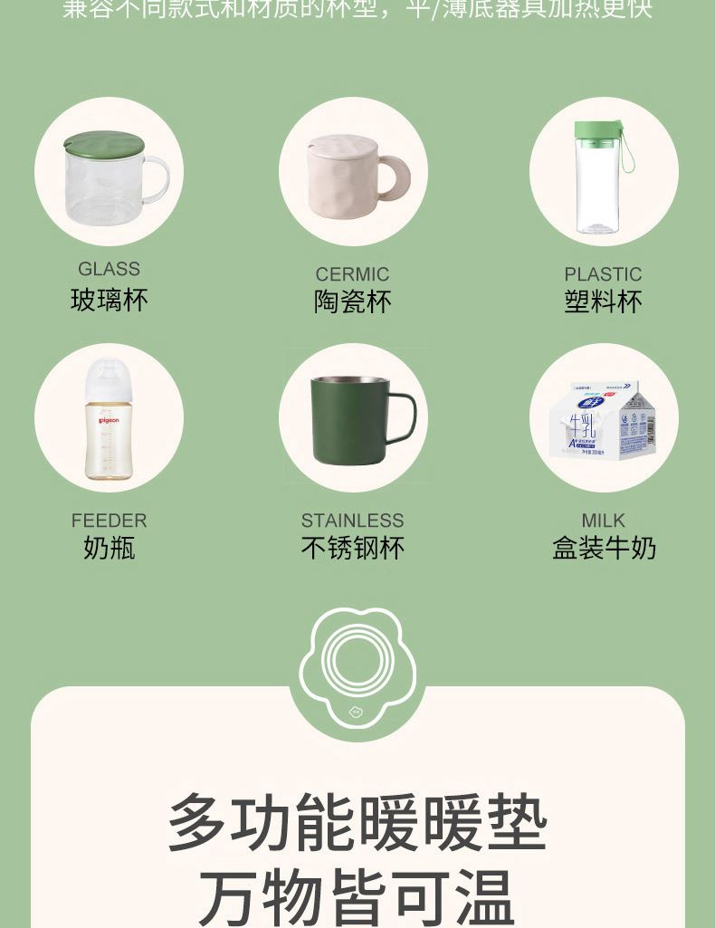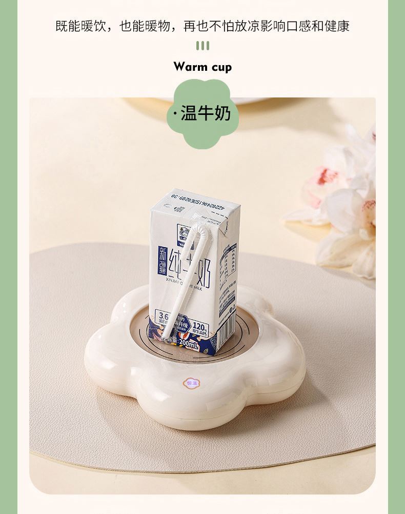 容量:400ml 功率:16W 电压:220V 频率:50HZ 产品材质:陶瓷+ABS 套装组合:陶瓷杯+小勺+发热底座 彩盒尺寸:30.6*10.5*21cm 外箱尺寸:64*45*63cm 55度保暖恒温,照料每个生活瞬间,暖暖的很贴心; 重力感应设计,物品超过250g自动开启,拿开自动关机; 百搭不挑杯,满足所有宠爱; 即能暖饮,也能暖物,万物皆可温; 硅胶体发热膜,整圈发热,恒温均匀; 小巧玲珑,不占地,温暖触手可及;