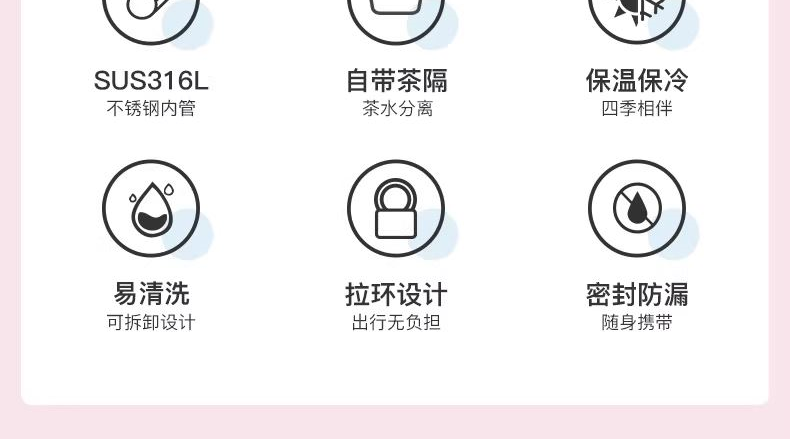 颜 色: LB托帕蓝 LP玻利维亚紫 CP莫桑比克粉 BR茶晶棕 容 量:370ml 类 型:旋盖杯带手提 定 制:可以定制 材 质:316钢 保 温:6小时大约60°C 保 冷:6小时大约10°C