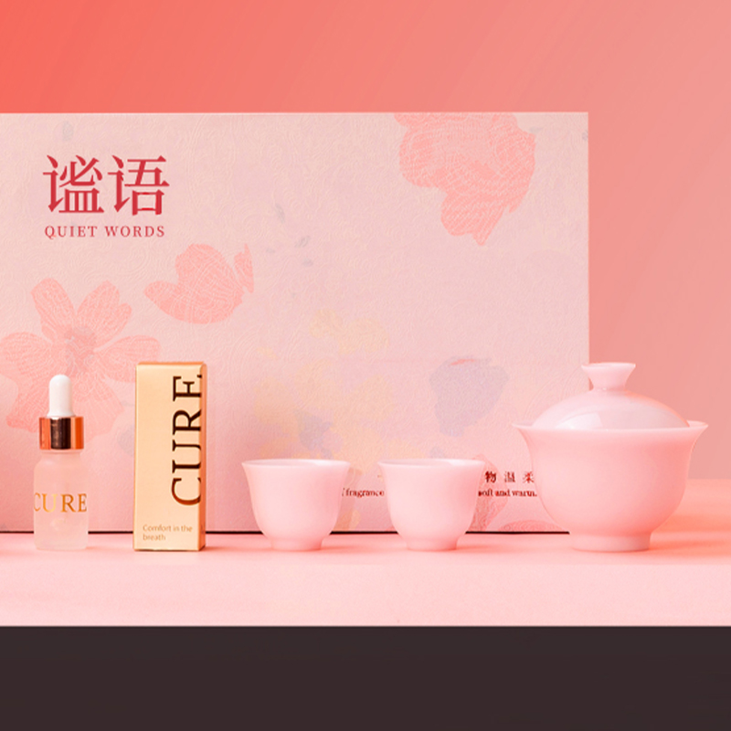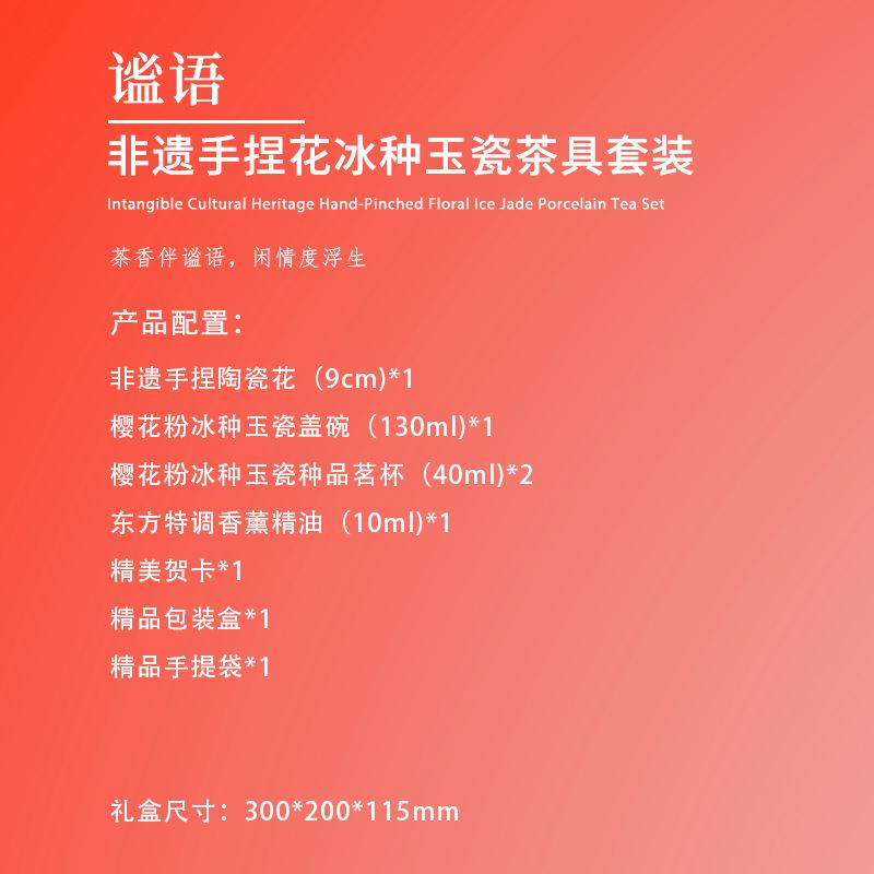 【产品配置】 非遗手捏陶瓷花(9cm)*1 樱花粉冰种玉瓷盖碗(130ml)*1 樱花粉冰种玉瓷种品茗杯(40ml)*2 东方特调香薰精油(10ml)*1 精美贺卡*1 精品包装盒*1 精品手提袋*1 【产品说明】 1、核心配置非遗手捏陶瓷花,兼具文化底蕴与艺术感; 2、樱花粉冰种玉瓷茶具,温润通透; 3、一套涵盖茶具与香薰精油,打造雅致闲逸的生活场景; 4、樱花粉主调+繁花意象,传递松弛氛围感; 5、配套精美包装与贺卡,仪式感拉满,适配女神节等场景。
