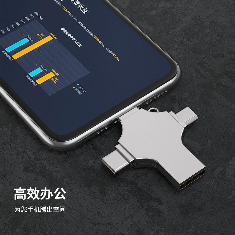 Type-C/USB3.0/Lightning/Micro 四接口 一盘四用,轻松实现多设备存储,扩容USB3.0高速传输,即插即用 高品质芯片,读写稳定 采用全金属金密打造,小巧便携 产品尺寸:44.0x40.0x5.0mm 单品重量:20g