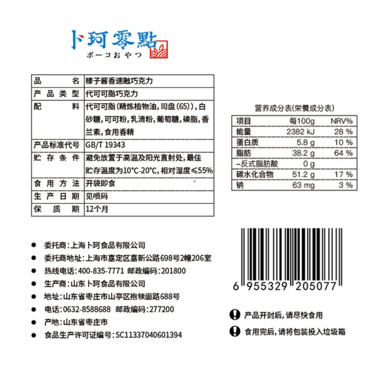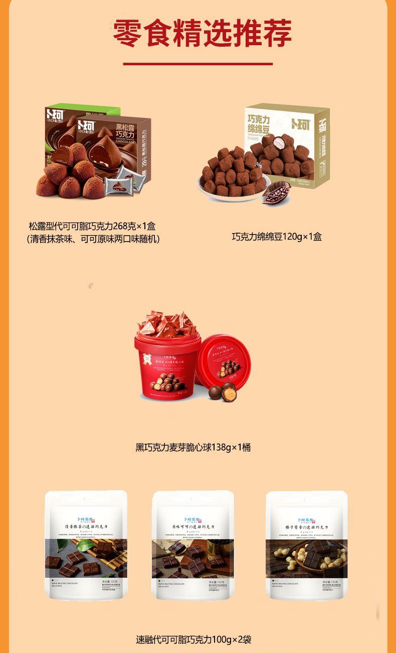 克重:726克 内配: 1、松露型代可可脂巧克力268克×1盒(清香抹茶味、可可原味两口味随机) 2、卜珂巧克力绵绵豆120g×1盒 3、卜珂黑巧克力麦芽脆心球138g×1桶 4、卜珂零點速融代可可脂巧克力100g×2袋(清香抹茶味、可可原味、酱香榛子味三口味随机) 礼盒规格:38*27*13.5cm 保质期:12月
