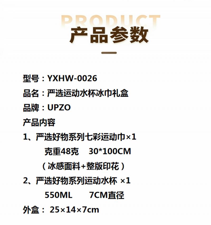 产品内容 1、严选好物系列七彩运动巾×1 克重48克 30*100CM (冰感面料+整版印花) 2、严选好物系列运动水杯 ×1 550ML 7CM直径 外盒: 25×14×7cm 设计清新时尚 产品实用性强 优质伴手礼