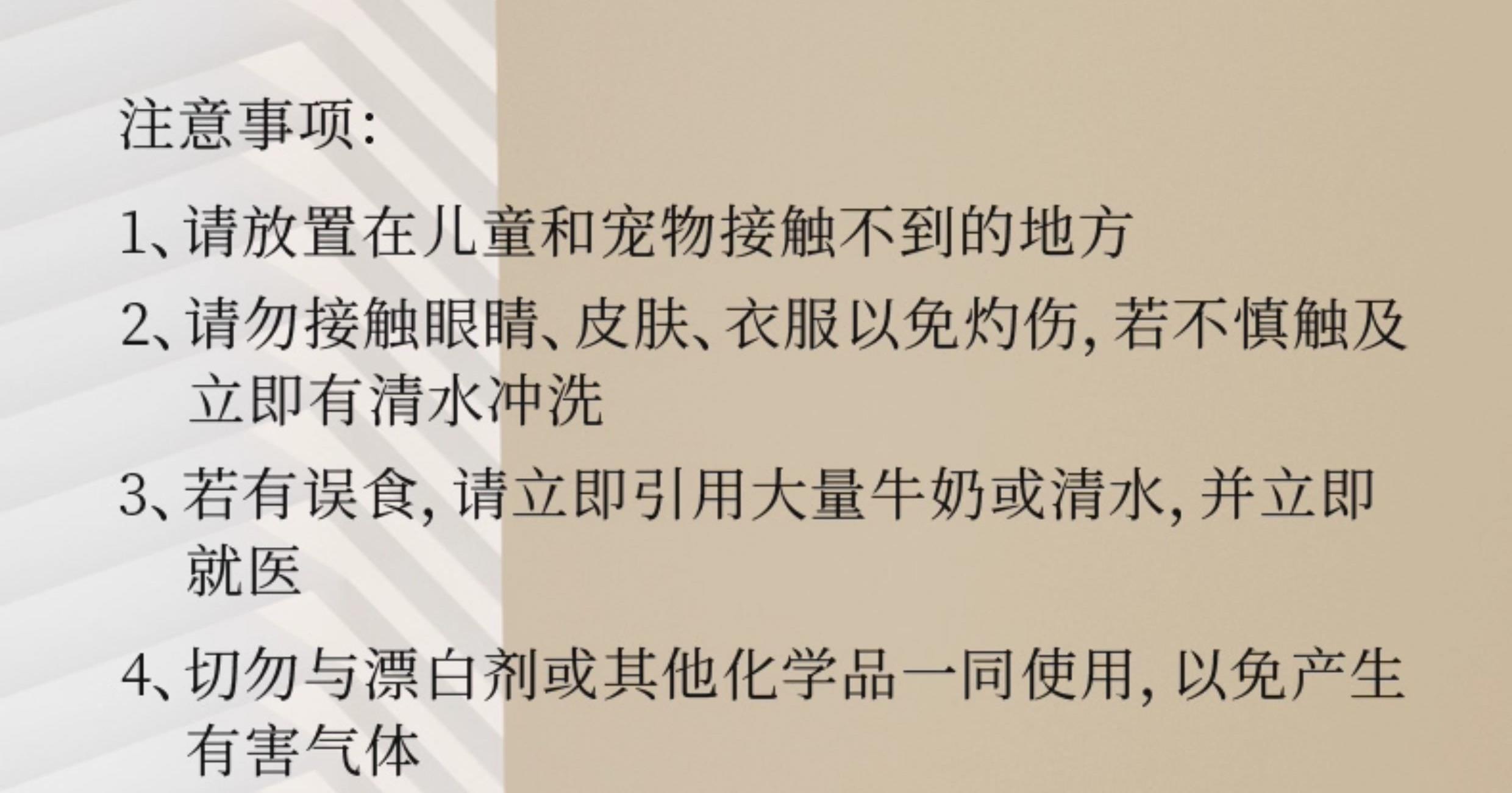 4、切勿与漂白剂或其他化学品一同使用,以免产生有害气体