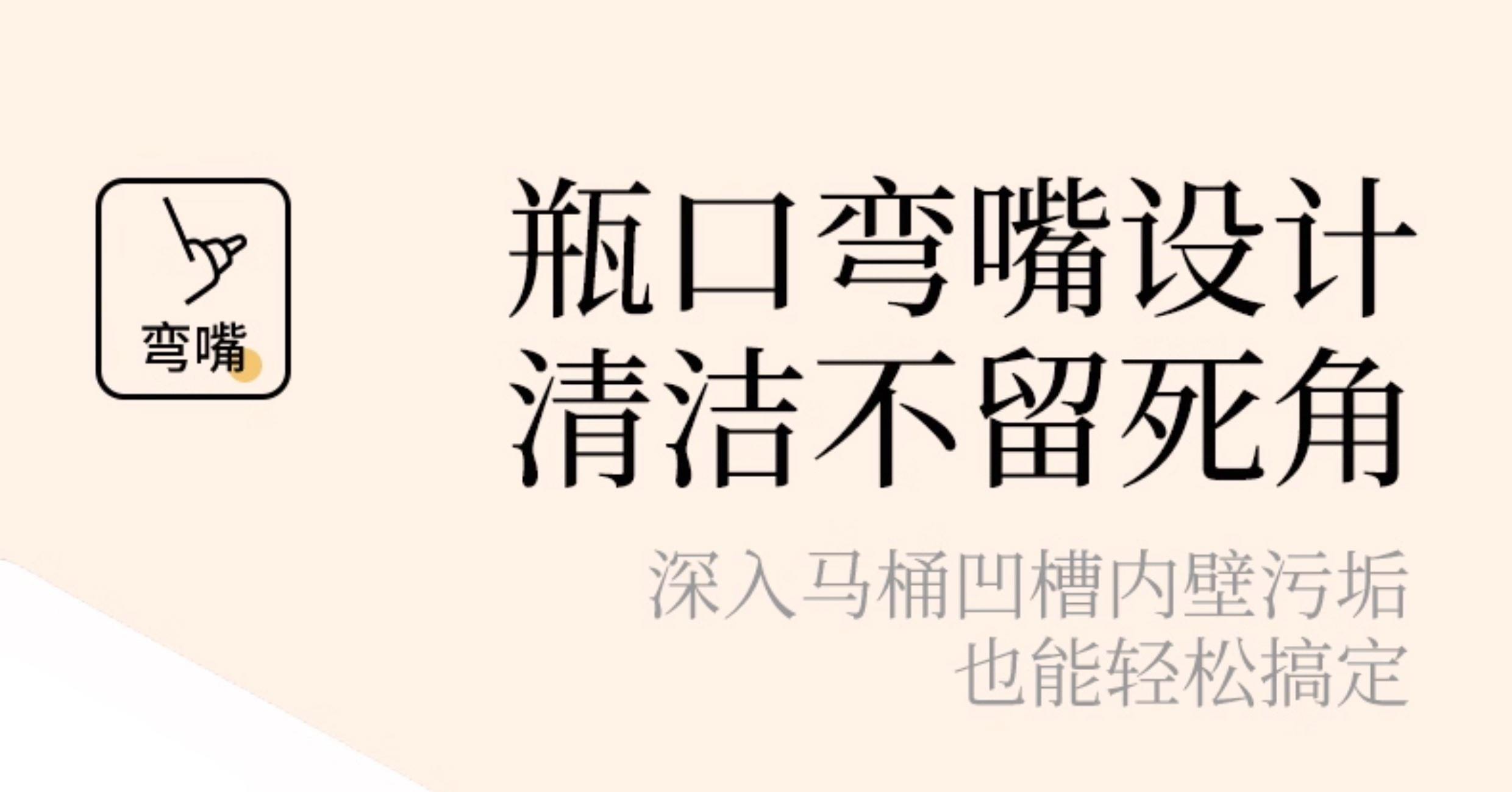 1、瓶口弯嘴设计,深入马桶凹槽内壁污垢,清洁不留死角;