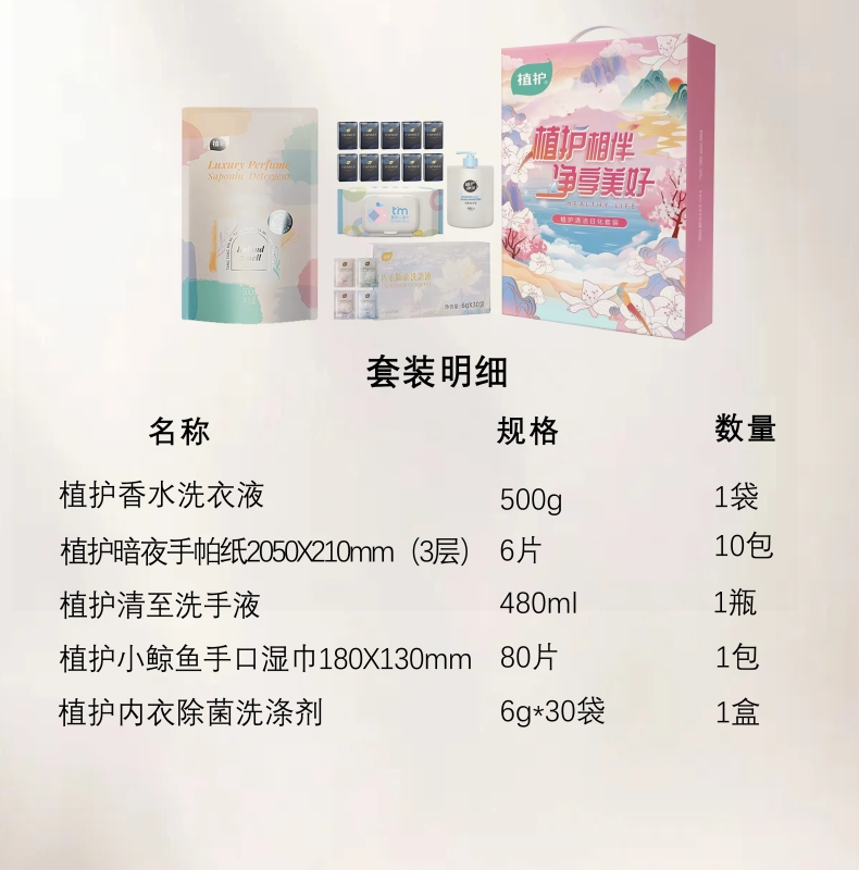 销售规格:植护香水洗衣液 500g/袋 *1袋+植护内衣洗衣液6g*30袋+植护暗夜手帕纸6片*10包+植护手口湿巾80抽*1包+植护洗手液480ml*1瓶