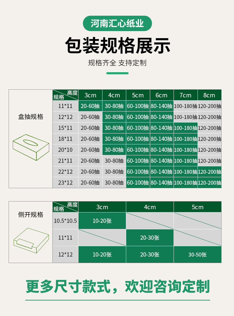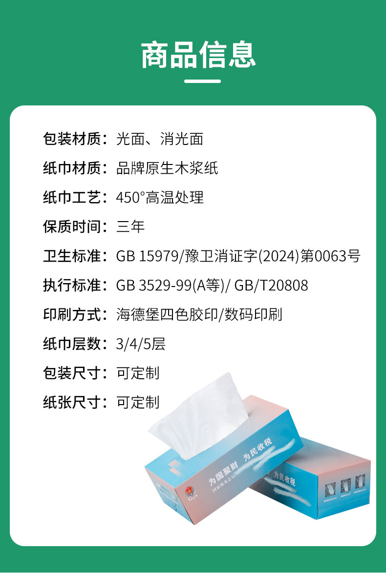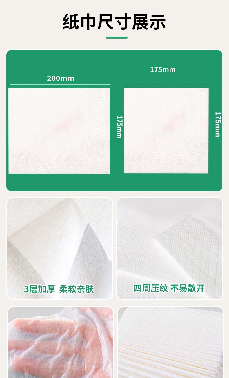 产品尺寸:210*110*80mm 内纸尺寸:175*175mm 净含量:200抽2层 外箱尺寸:64*50*65cm 主要成分:原生木浆 执行标准:GBT20808 卫生标准:GB15979 卫生许可证:(豫)卫消证字(2024)第0063号 产品等级:合格