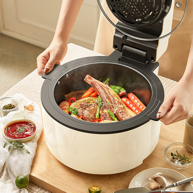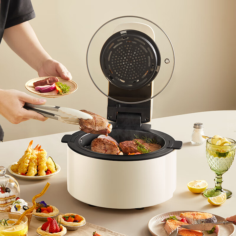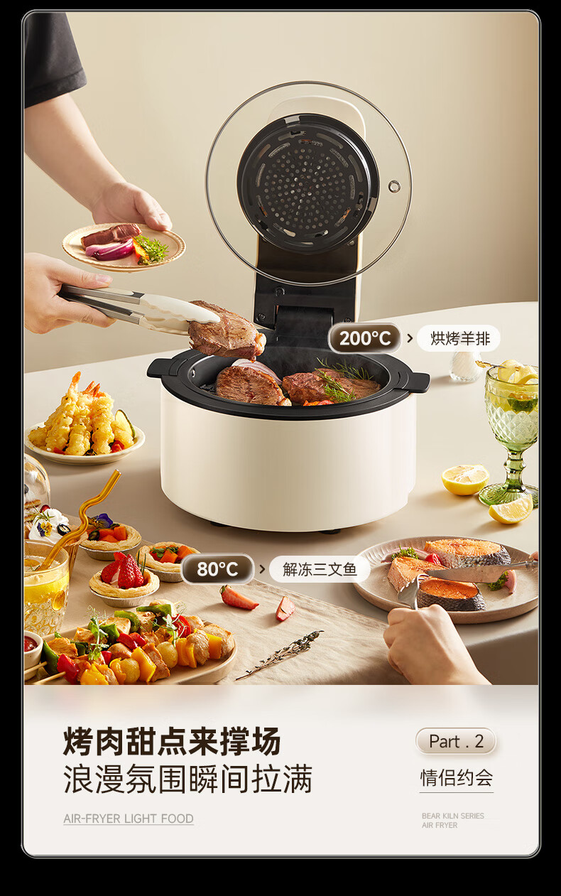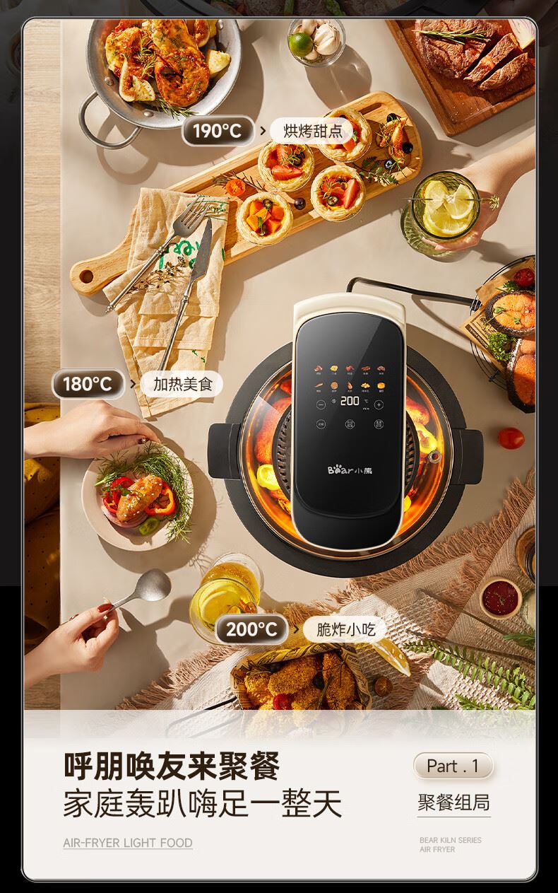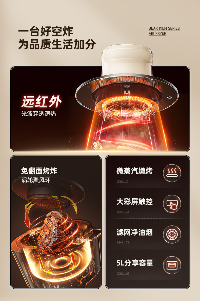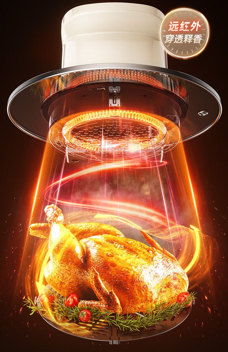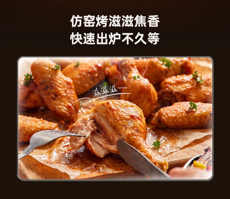 5L大容量; 可视大视窗; 大彩屏触控; 免翻面烤炸 涡轮聚风环; 升级远红外光波管热力透芯 焦香扑鼻。