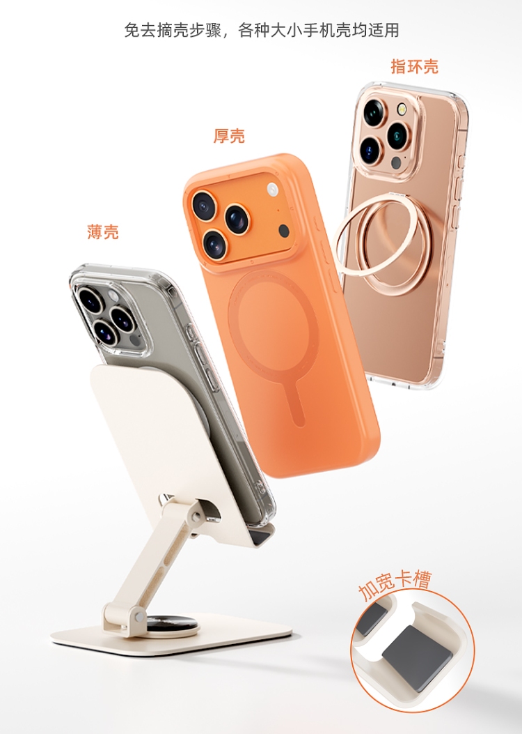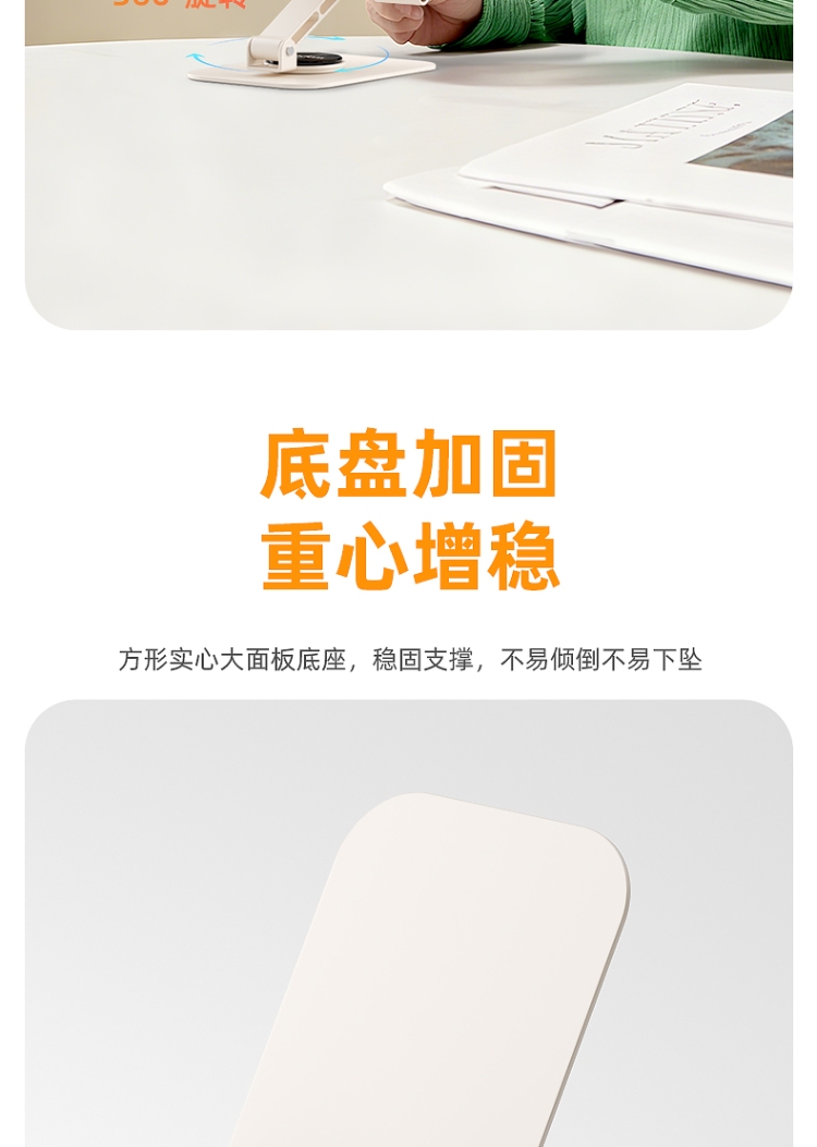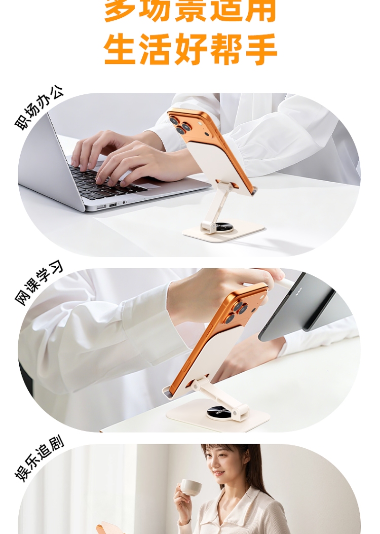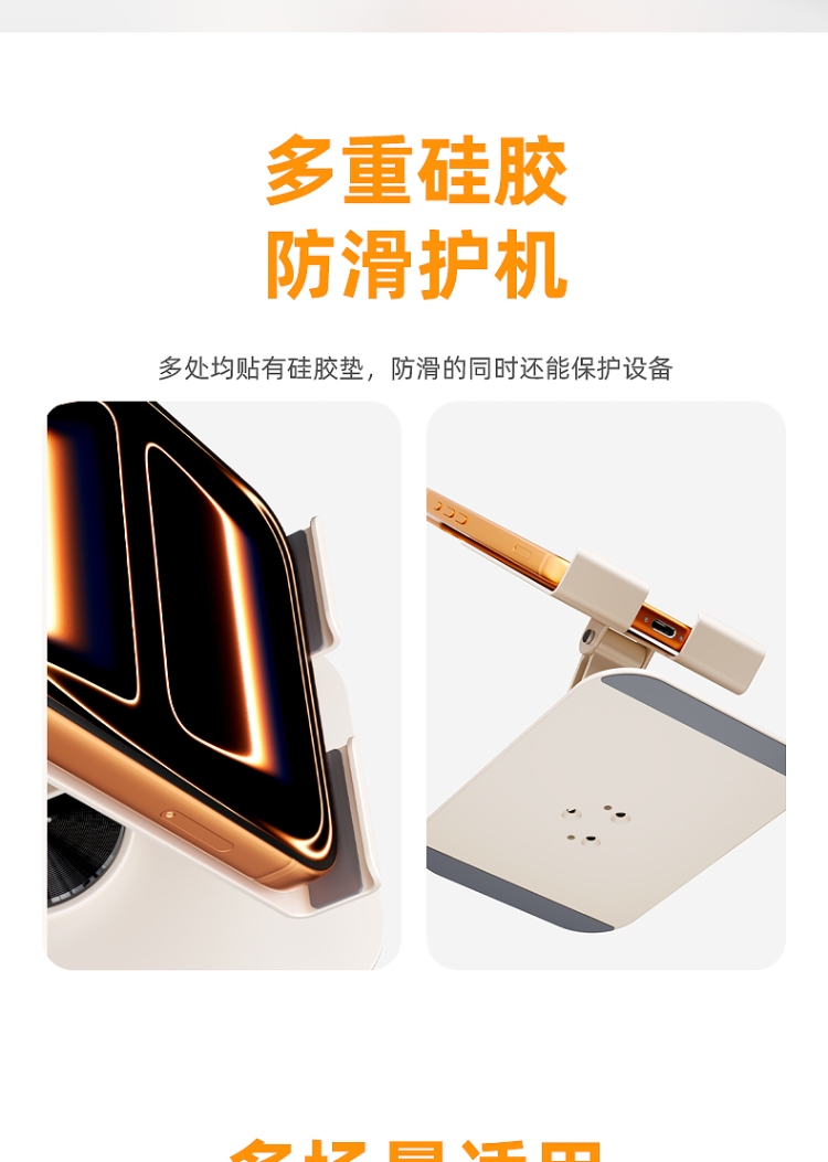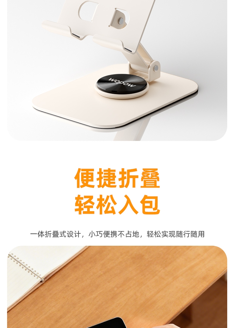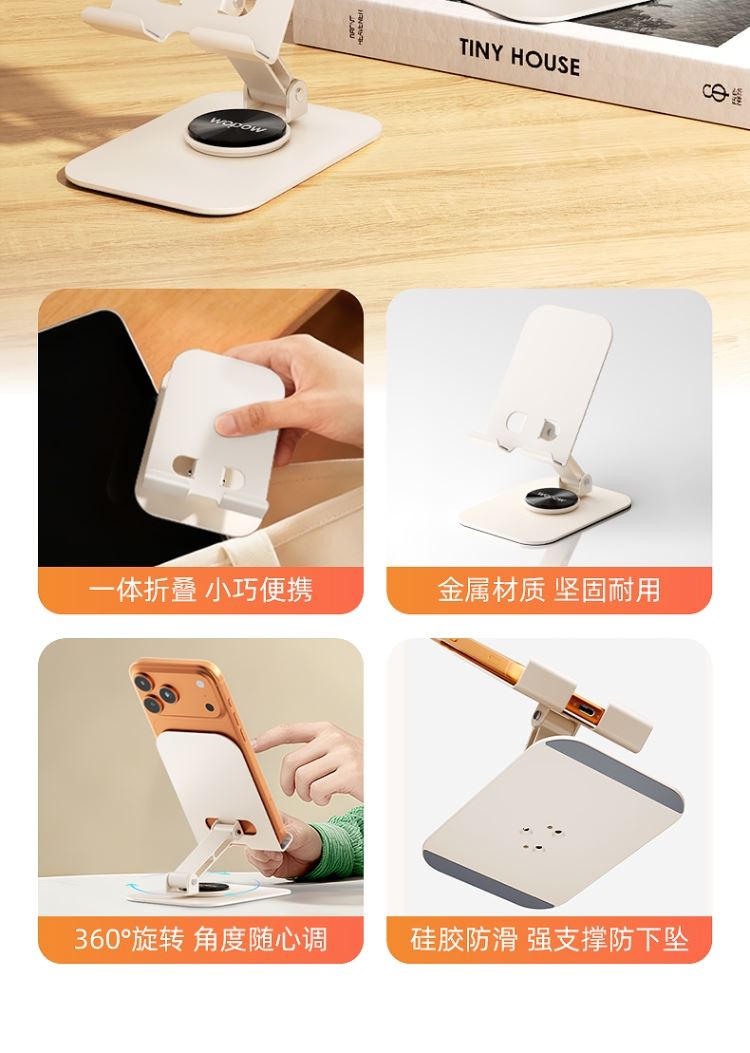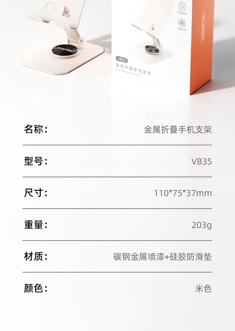产品尺寸:110*75*37mm 包装尺寸:105.5*76.5*37.5mm产品重量:203g 颜色:米色 材质:碳钢金属喷漆+硅胶防滑垫 使用场景:把支架平稳放置在桌面上,调节好舒适角度就可以放置手机,不使用的时候可以折叠起来,随身携带方便实用 360度任意变换角度 可折叠方便携带 自由升降,支撑力大 金属材质,硅胶垫防滑垫。