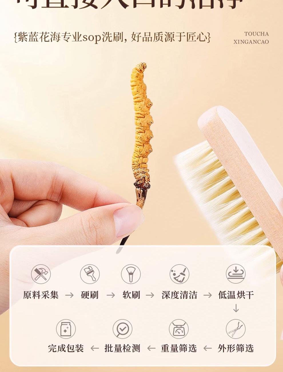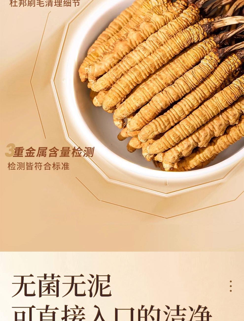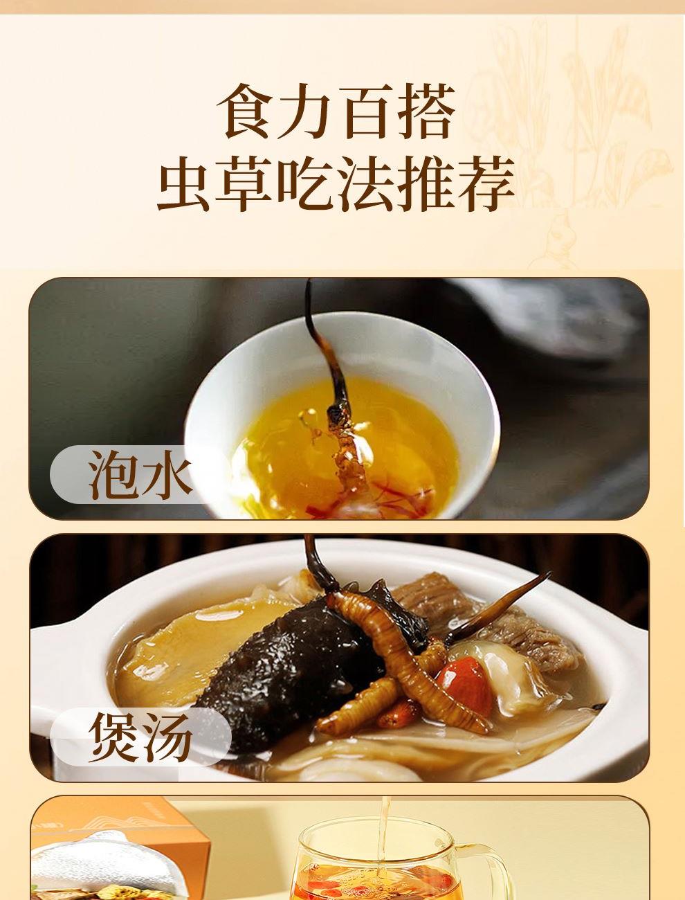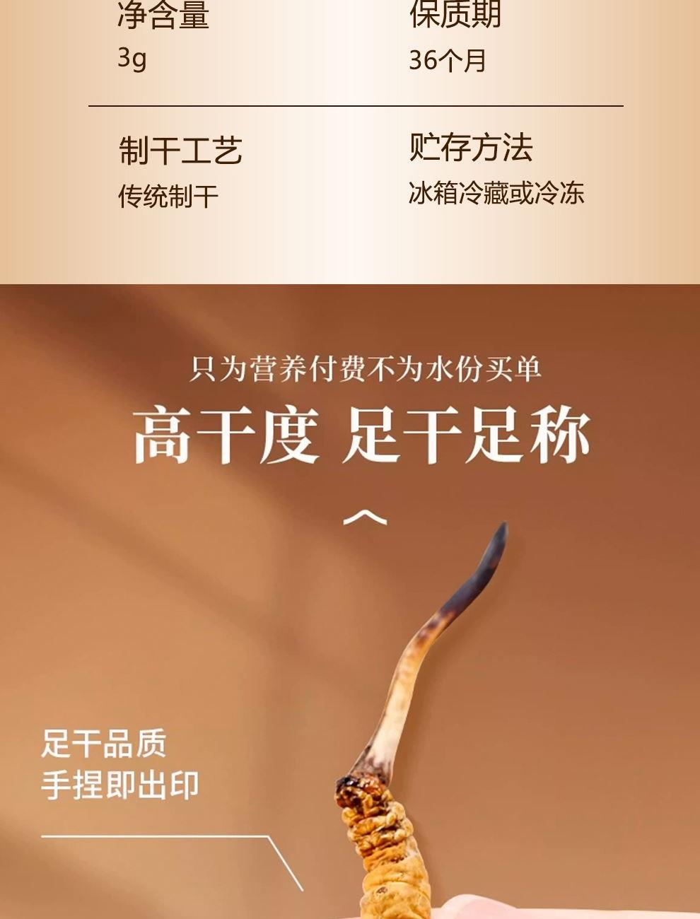 规格:3克(约12支) 卖点: 西藏是冬虫夏草的重要产区,那里的高海拔环境,如雪山、草地,昼夜温差大,紫外线强烈。这种独特的生态环境造就了冬虫夏草的高品质,它生长在这样严酷的条件下,积累了丰富的营养成分。