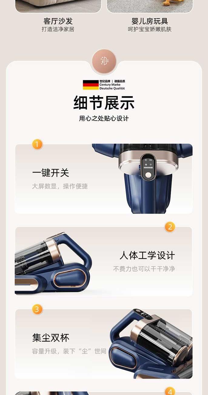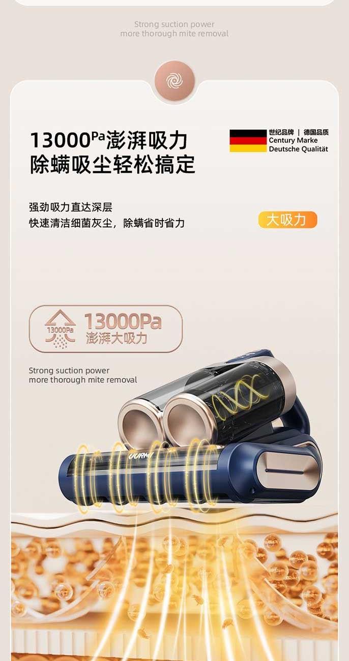 • 13000pa暴风大吸力,横扫除螨,清除过敏原;