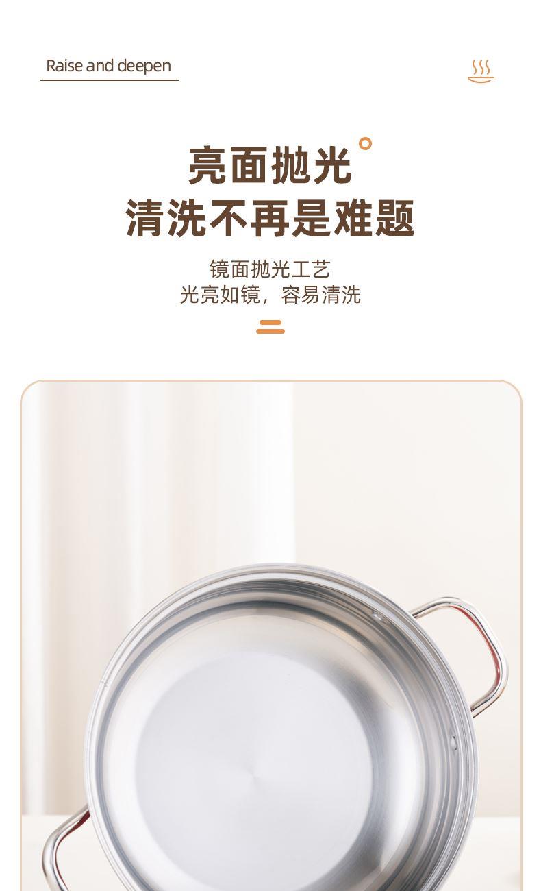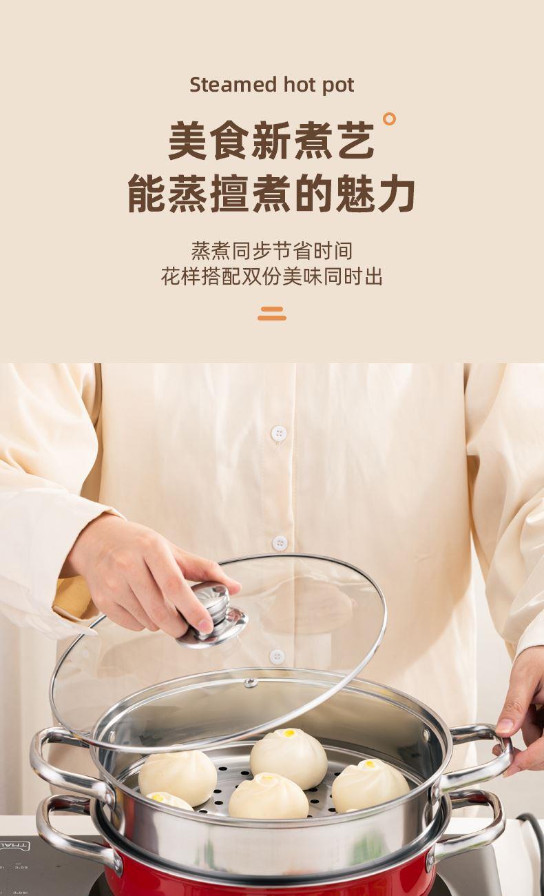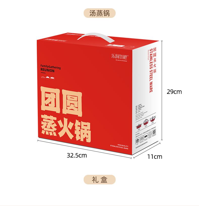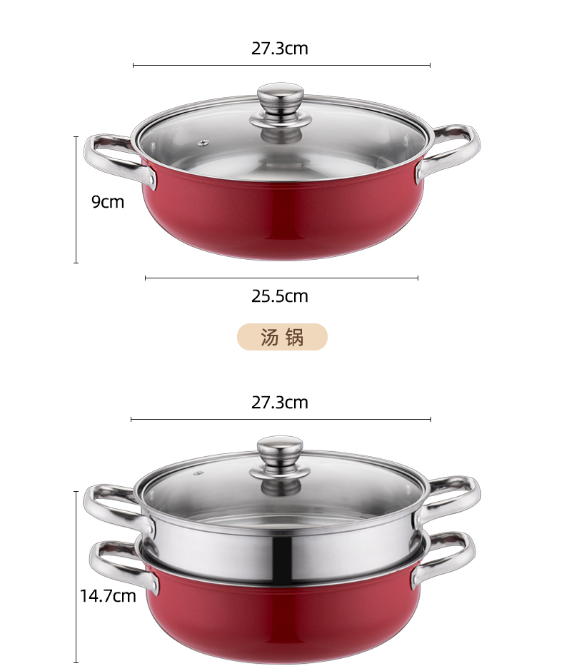 产品规格:28cm 产品材质:410不锈钢 包装方式:opp透明袋+手提彩盒 彩盒尺寸:32.5*11*29CM 外箱尺寸: 65.5*48.5*68 cm 创造高业绩,送礼心坎里,好产品,助您开门红事半功倍。 采用国际标准不锈钢板材,食品接触用钢材,搭配蒸格使用, 冬季火锅边煮边蒸,一锅两菜更实用,加高底锅,可做清汤锅使用, 可打火锅使用,多炉灶通用。 红礼盒包装,时尚大气,是您引流拓客,宣传必备礼品。