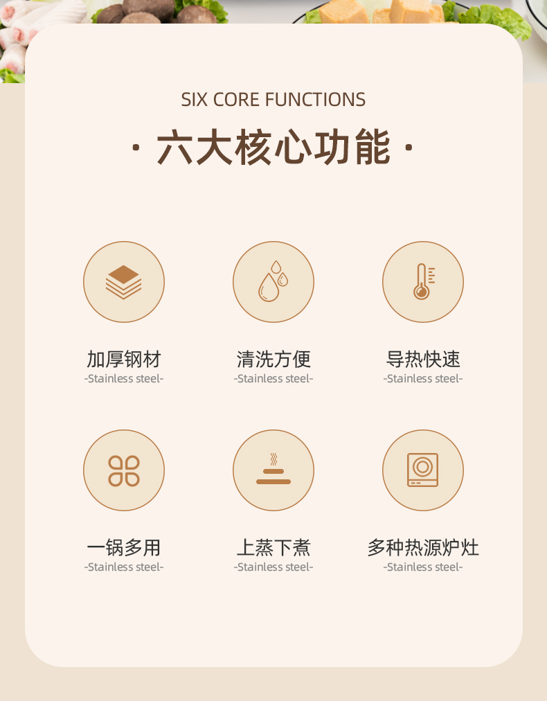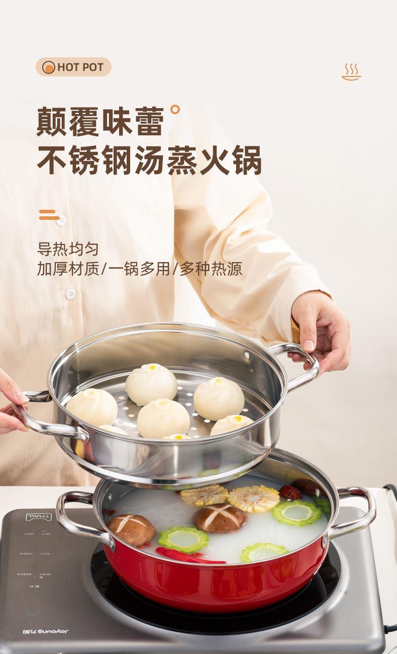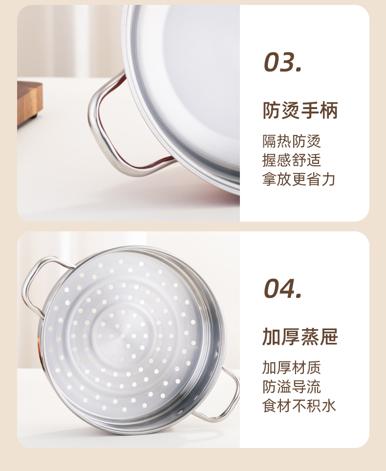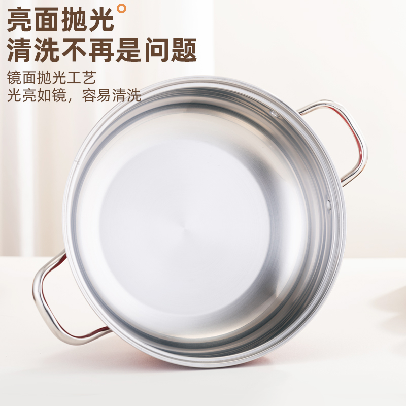 产品规格:28cm 产品材质:410不锈钢 包装方式:opp透明袋+手提彩盒 彩盒尺寸:32.5*11*29CM 外箱尺寸: 65.5*48.5*68 cm 创造高业绩,送礼心坎里,好产品,助您开门红事半功倍。 采用国际标准不锈钢板材,食品接触用钢材,搭配蒸格使用, 冬季火锅边煮边蒸,一锅两菜更实用,加高底锅,可做清汤锅使用, 可打火锅使用,多炉灶通用。 红礼盒包装,时尚大气,是您引流拓客,宣传必备礼品。