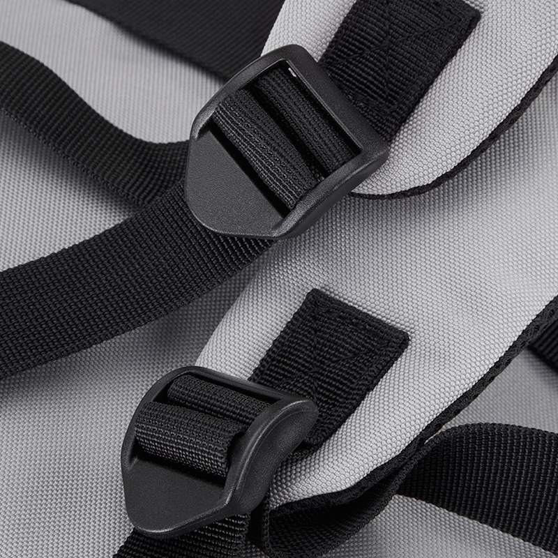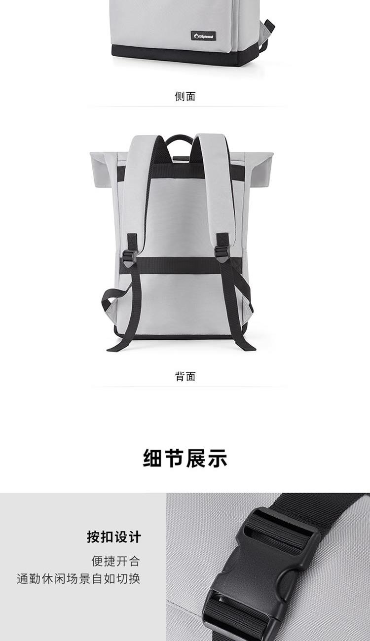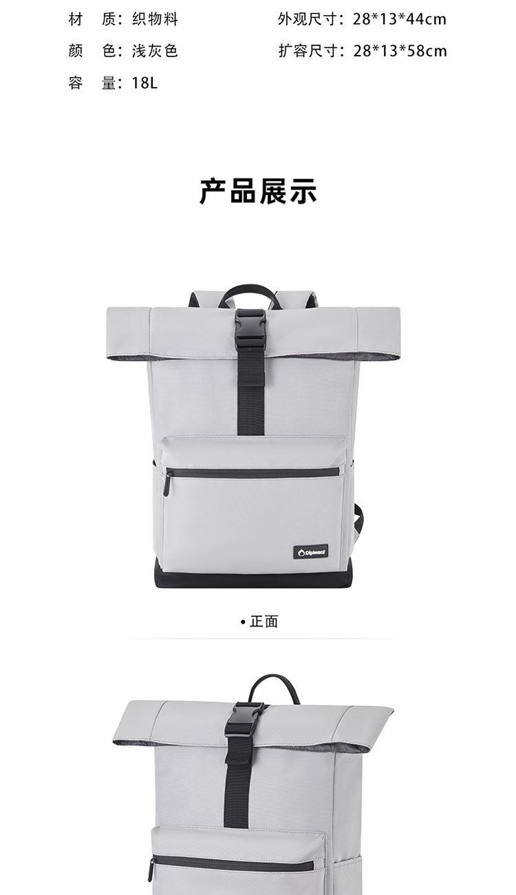 产品材质:织物料 产品颜色:浅灰色 外观尺寸:280*130*440mm (折叠前:280*130*580mm ) 产品容量:18L 卷口设计,灵活扩容,大容量轻松置物 顶部大开口,直通主仓,秒速存取 前幅拉链袋,多功能收纳隔层,装载有序 双侧口袋,可挂靠拉杆箱设计,方便出行