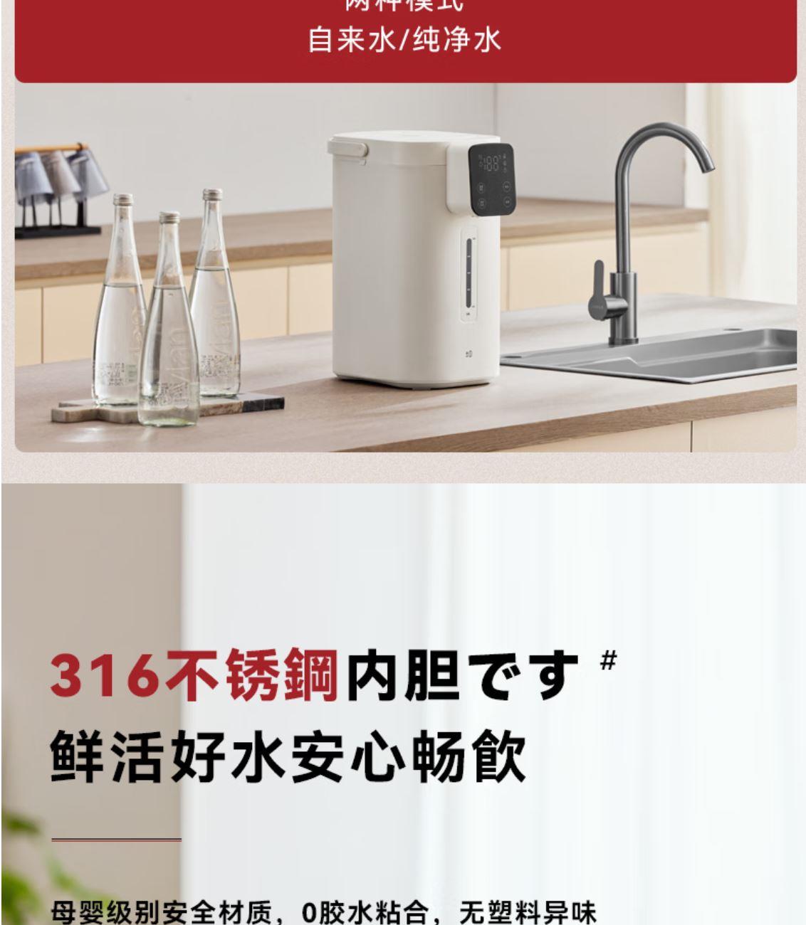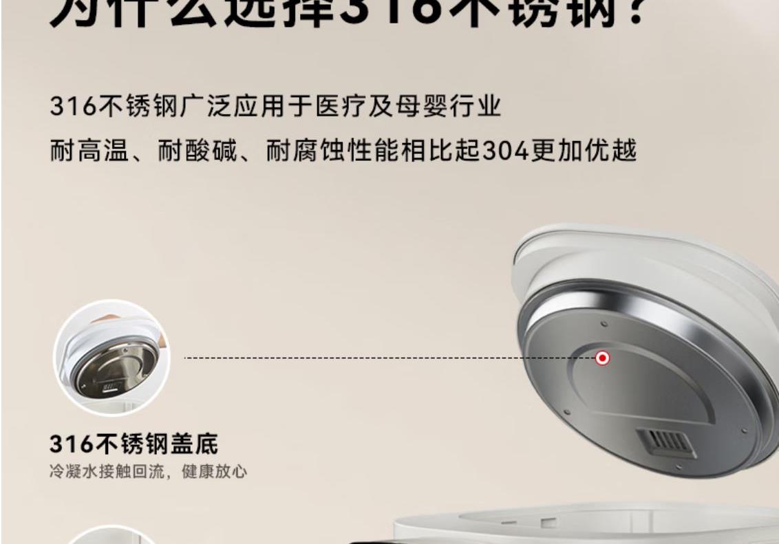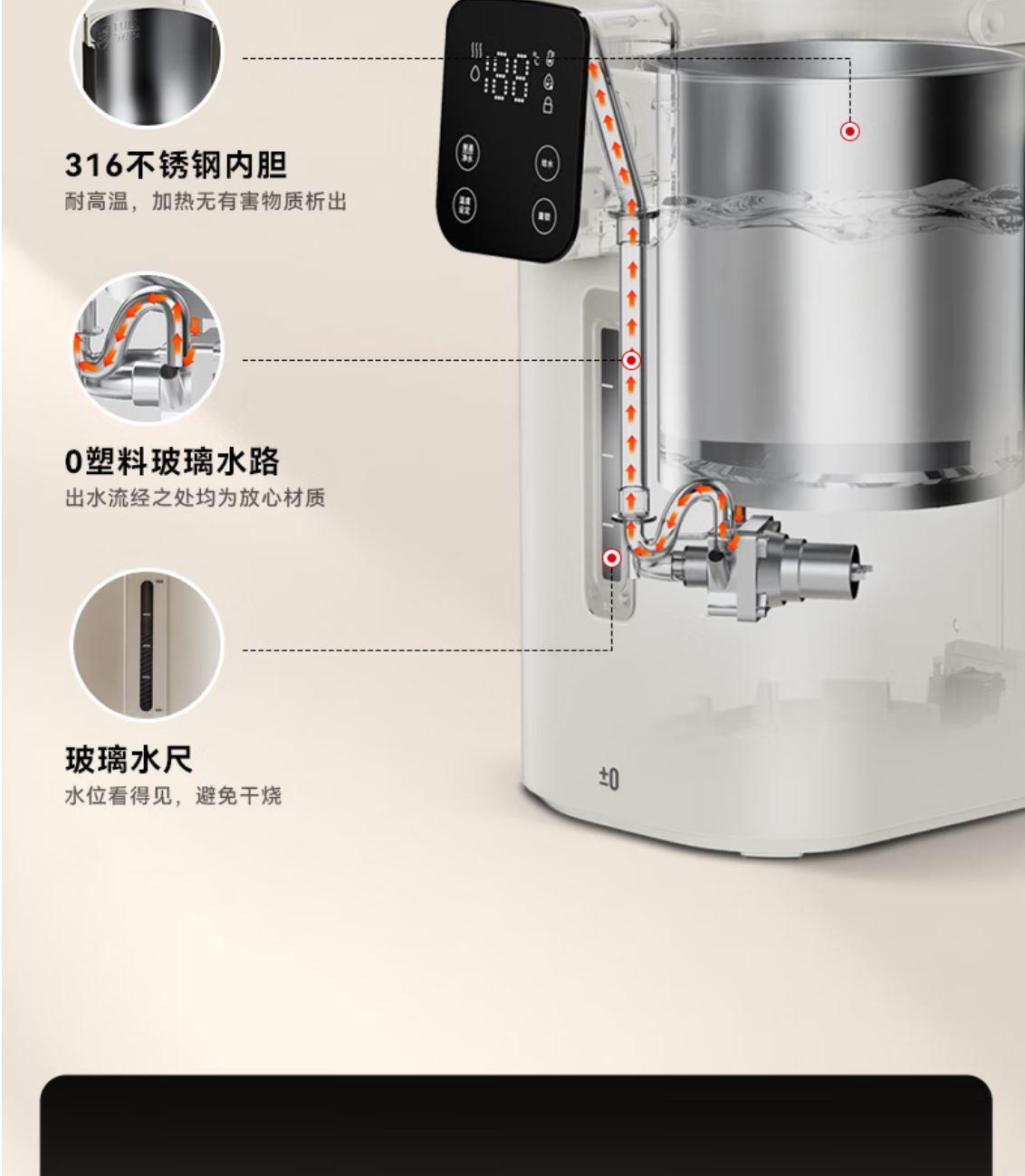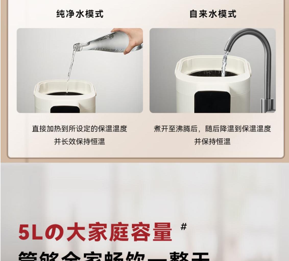 316 不锈钢内胆0,涂层 0 塑料 无异味 1600W 大功率真沸腾 两种模式,自来水 / 纯净水 11 段定温,满足全家冲饮需求 多重安全保护,童锁设计防烫伤 额定功率:1600W 温度设定:11 档 出水方式:电动 / 碰杯 水箱容量:5L 产品尺寸:199*305*312mm