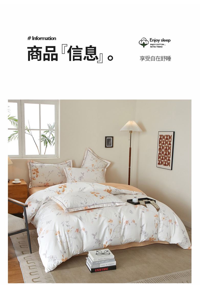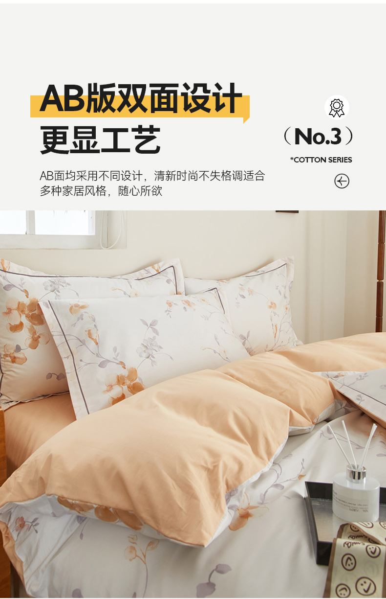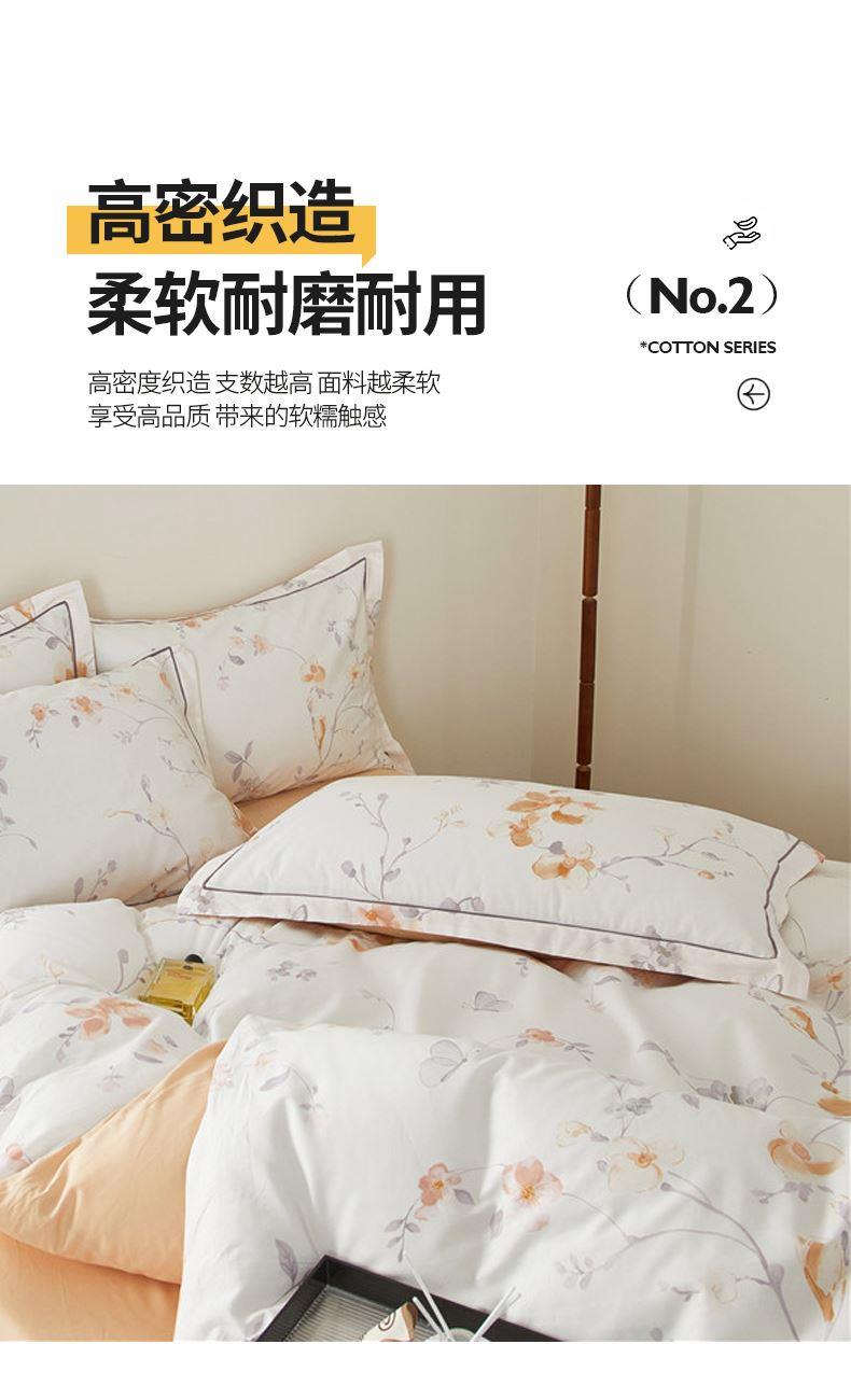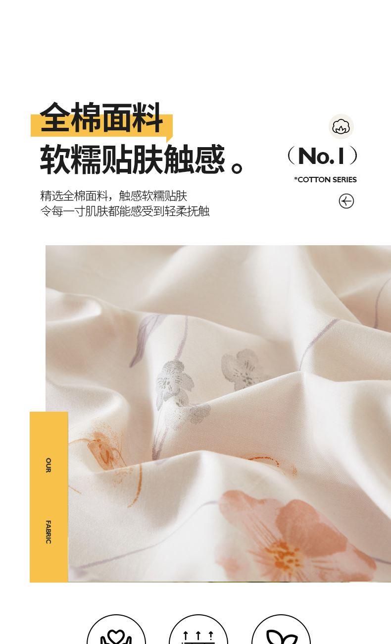 被套:200×230cm 床单:245×250cm 枕套:48×74cm 面料:棉(133×76精梳棉) 适用:1.5m-1.8m床 印染工艺:活性印花 风格:轻奢田园风 优选全棉高密度织造面料,AB版双面设计,活性印染工艺,清新时尚不失格调适合多种家居风格,随心所欲。