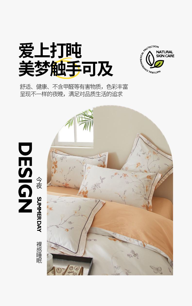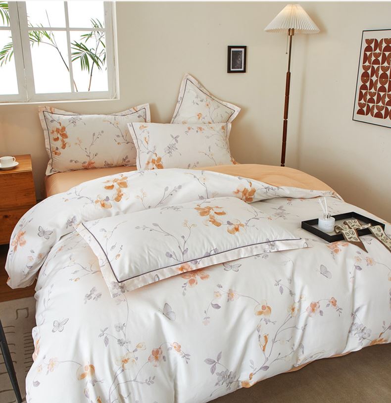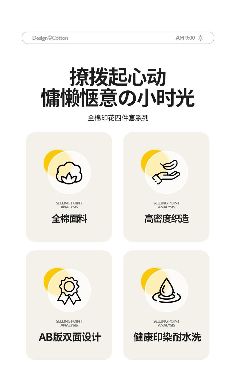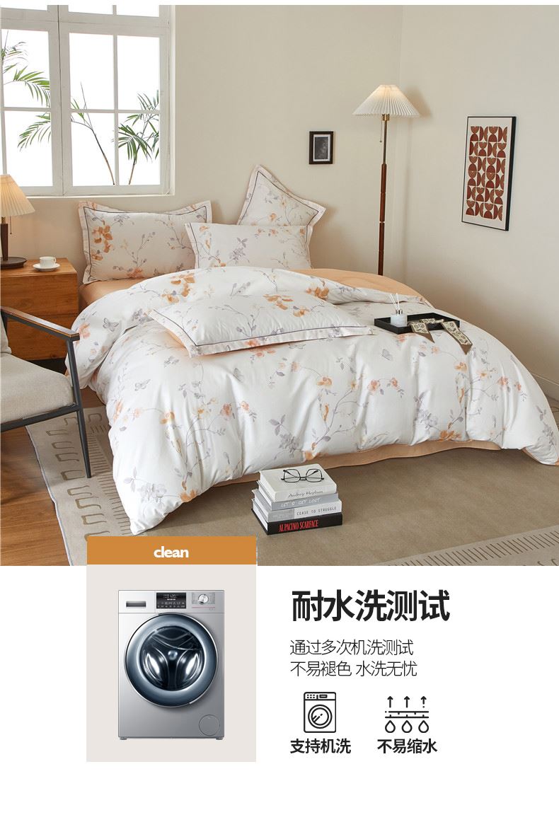 被套:200×230cm 床单:245×250cm 枕套:48×74cm 面料:棉(133×76精梳棉) 适用:1.5m-1.8m床 印染工艺:活性印花 风格:轻奢田园风 优选全棉高密度织造面料,AB版双面设计,活性印染工艺,清新时尚不失格调适合多种家居风格,随心所欲。