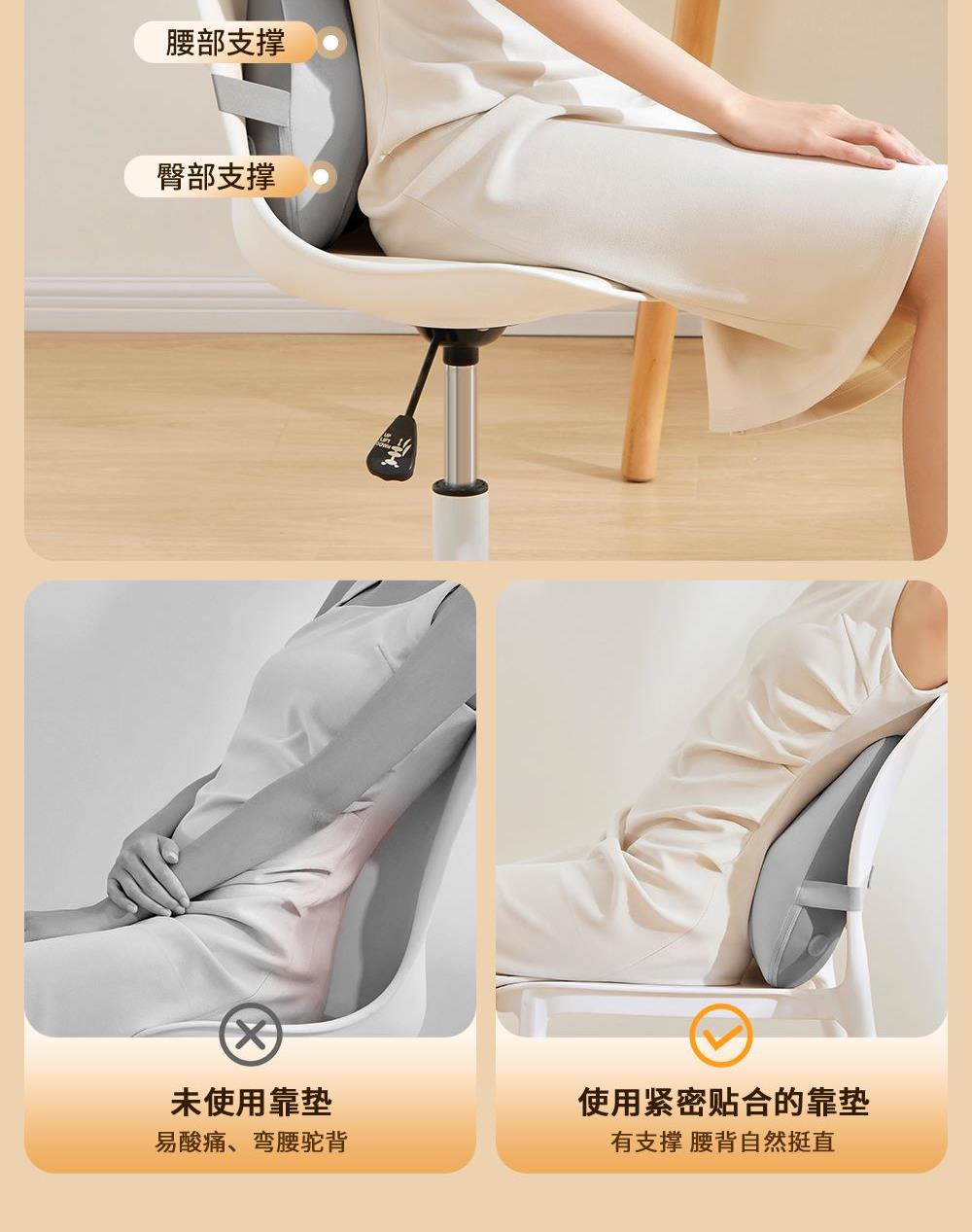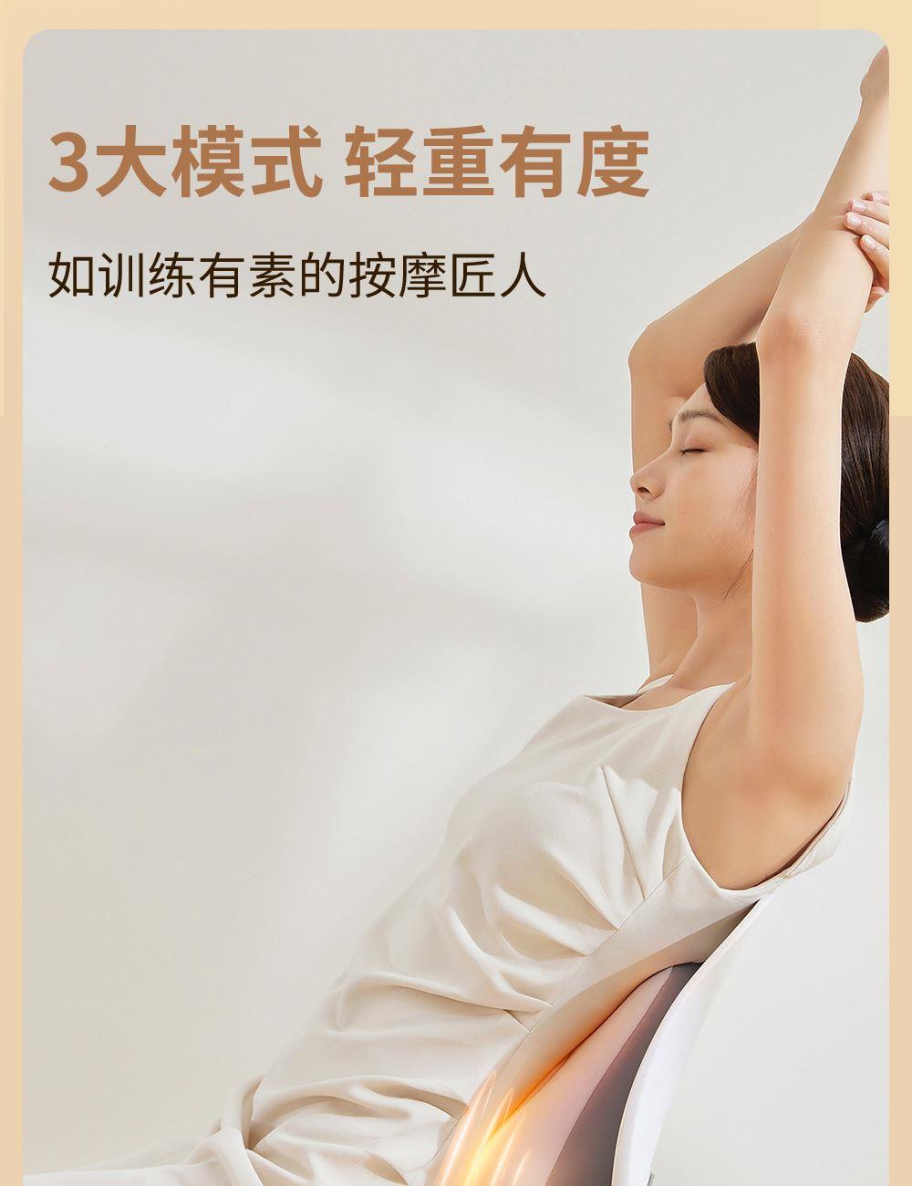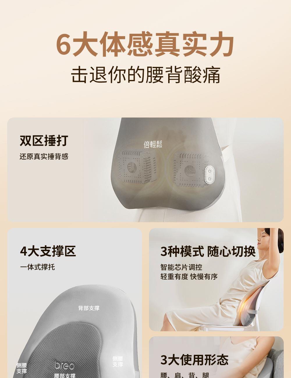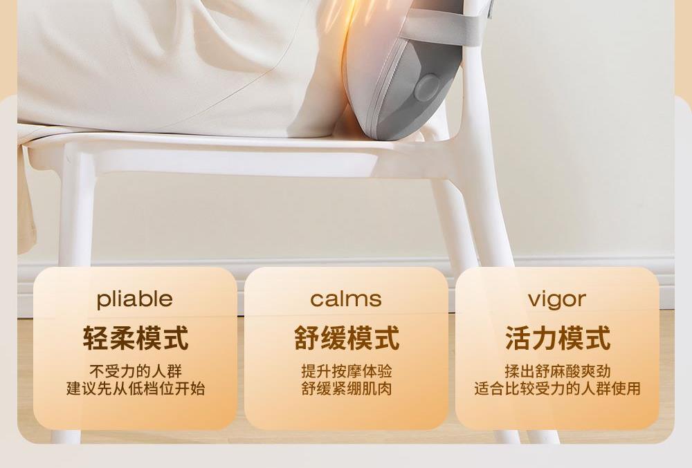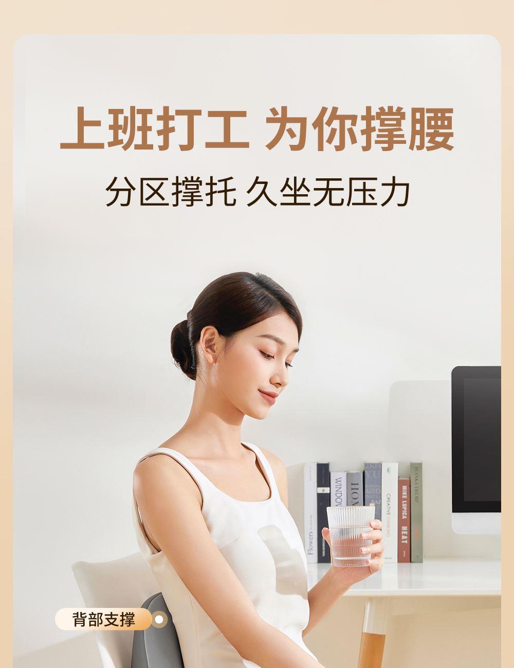 双区捶打,还原捶背真实感_x000b_ 2个电动按摩头有力敲击腰部,如同双拳攥劲发力,一捶舒爽赶走腰间不适 3个模式,快慢有序 智能芯片调控,提供3个模式,低、中、高挡力度选择 如训练有素的按摩匠人,手法讲究不乱打 分区承托腰背,缓解久坐压力 根据久坐时腰背的受力分布,设计支撑 紧密包裹身体充分承接腰背部压力,久坐不怕累