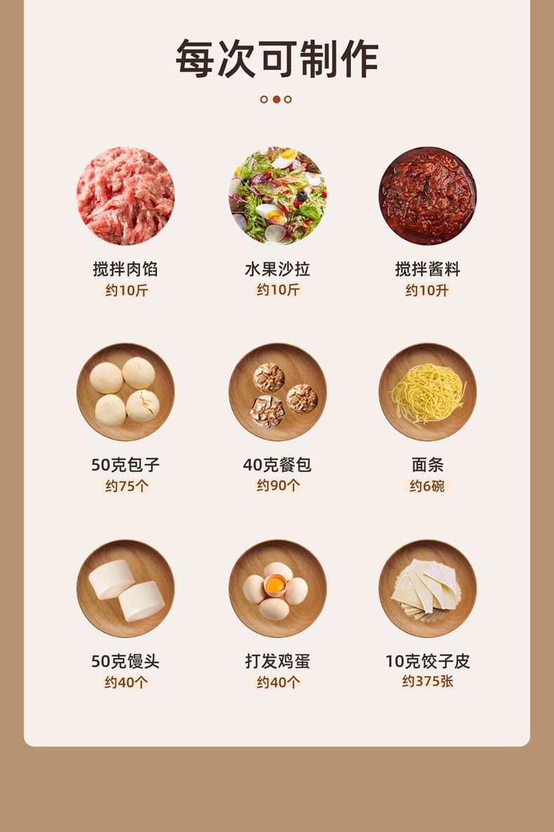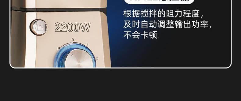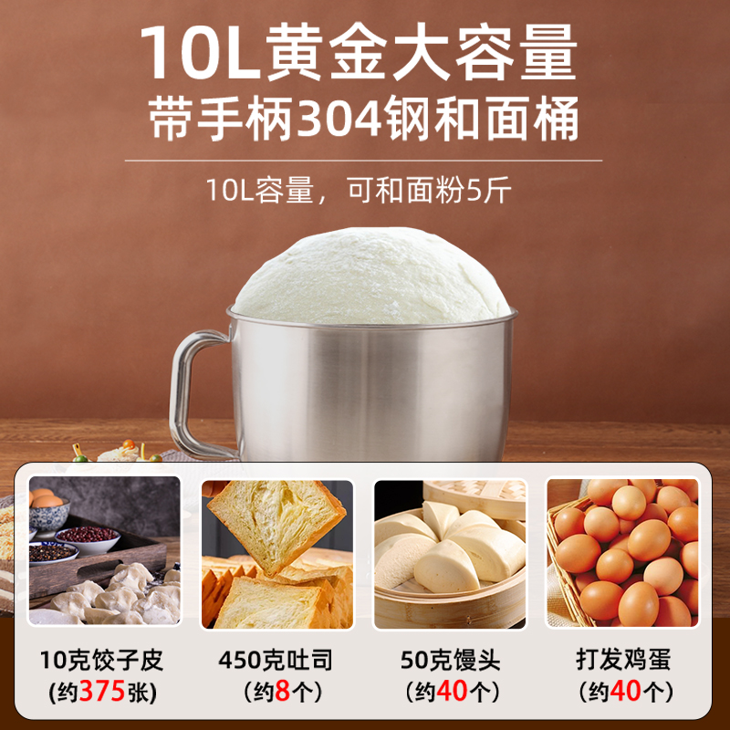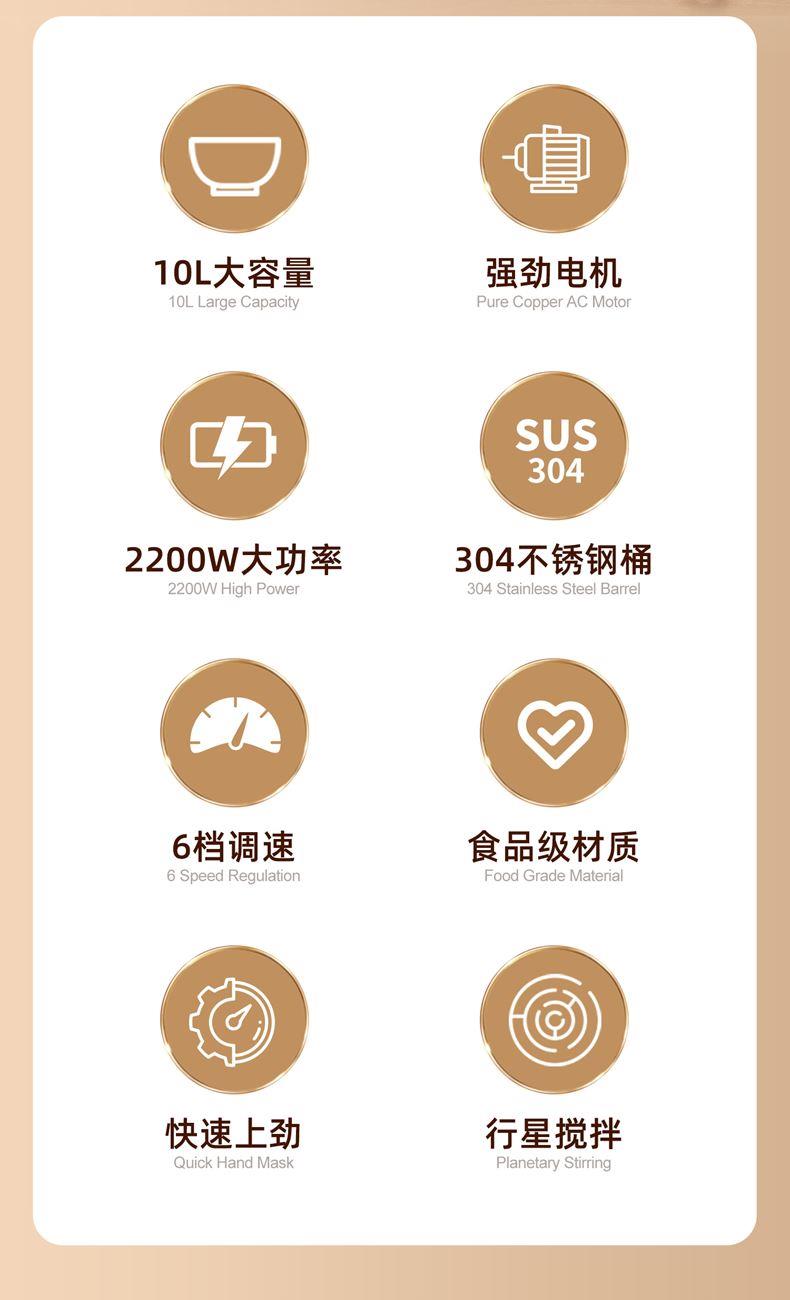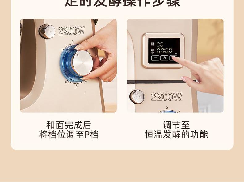 2200w大功率电机,大功率和面打发快; 304不锈钢和面桶10L,可和7.5斤面团,打发3500ml奶油,40个鸡蛋; 3大配件,6档位随心操作,可视化防溅盖中途加料不费劲; 一键抬头设计,抬头即断电,加固吸盘底座,防滑防晃动; 定时发酵功能,面温控制25-38度发酵实现和面醒面一体;