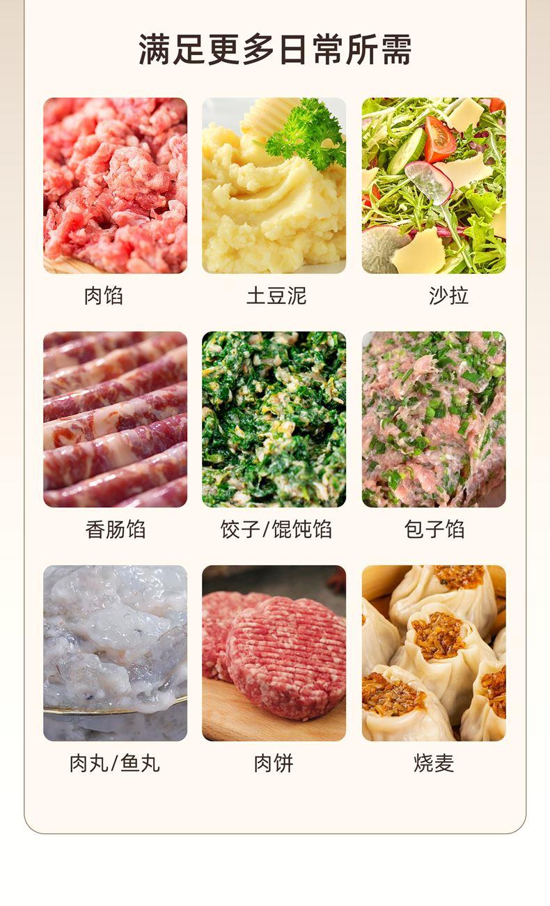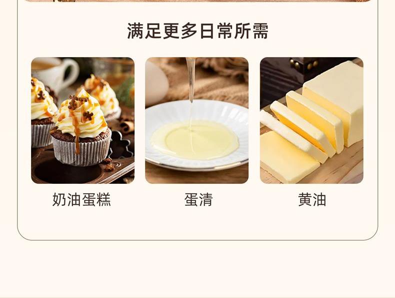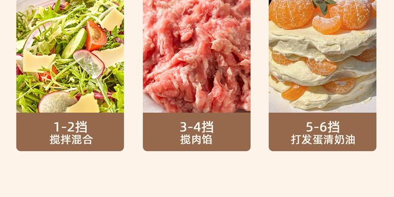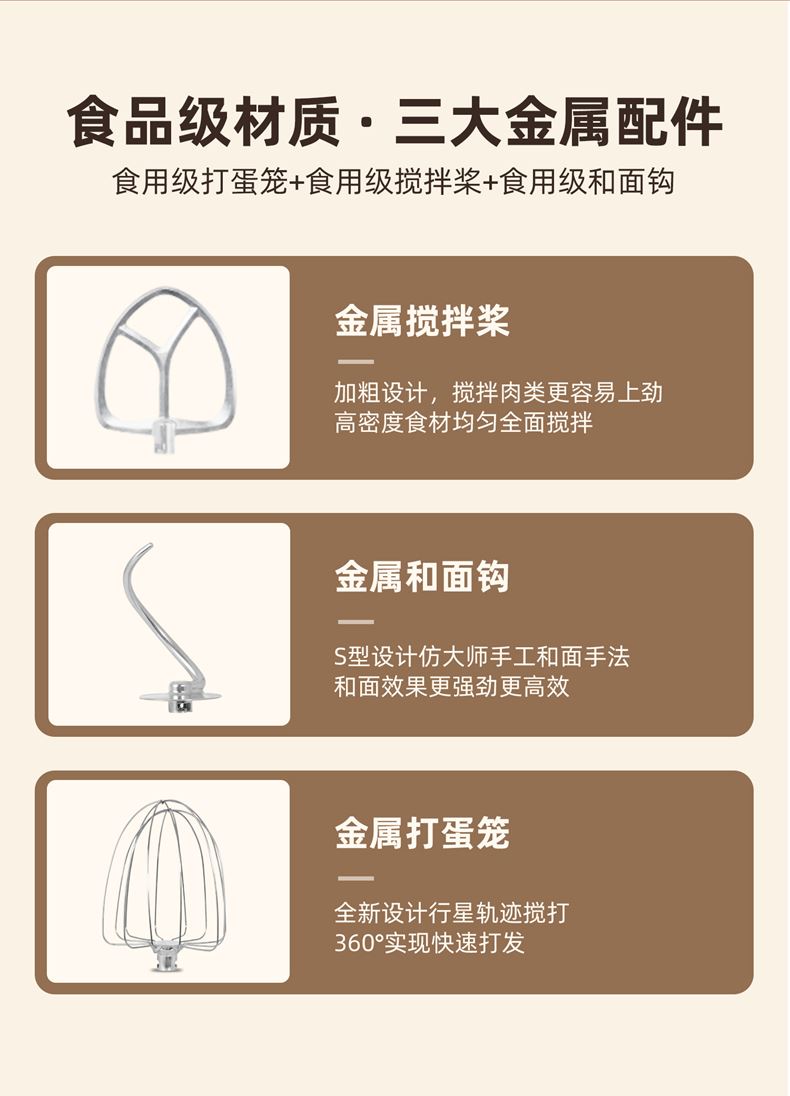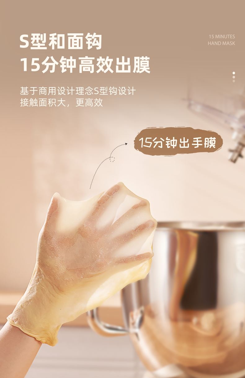 2200w大功率电机,大功率和面打发快; 304不锈钢和面桶10L,可和7.5斤面团,打发3500ml奶油,40个鸡蛋; 3大配件,6档位随心操作,可视化防溅盖中途加料不费劲; 一键抬头设计,抬头即断电,加固吸盘底座,防滑防晃动; 定时发酵功能,面温控制25-38度发酵实现和面醒面一体;