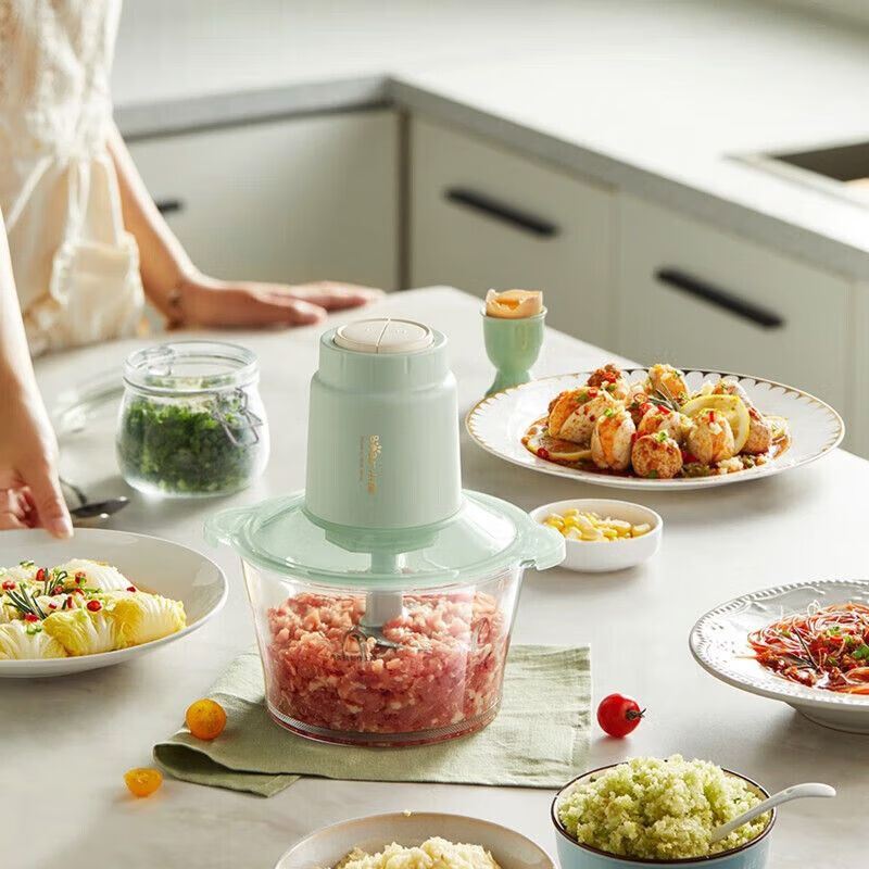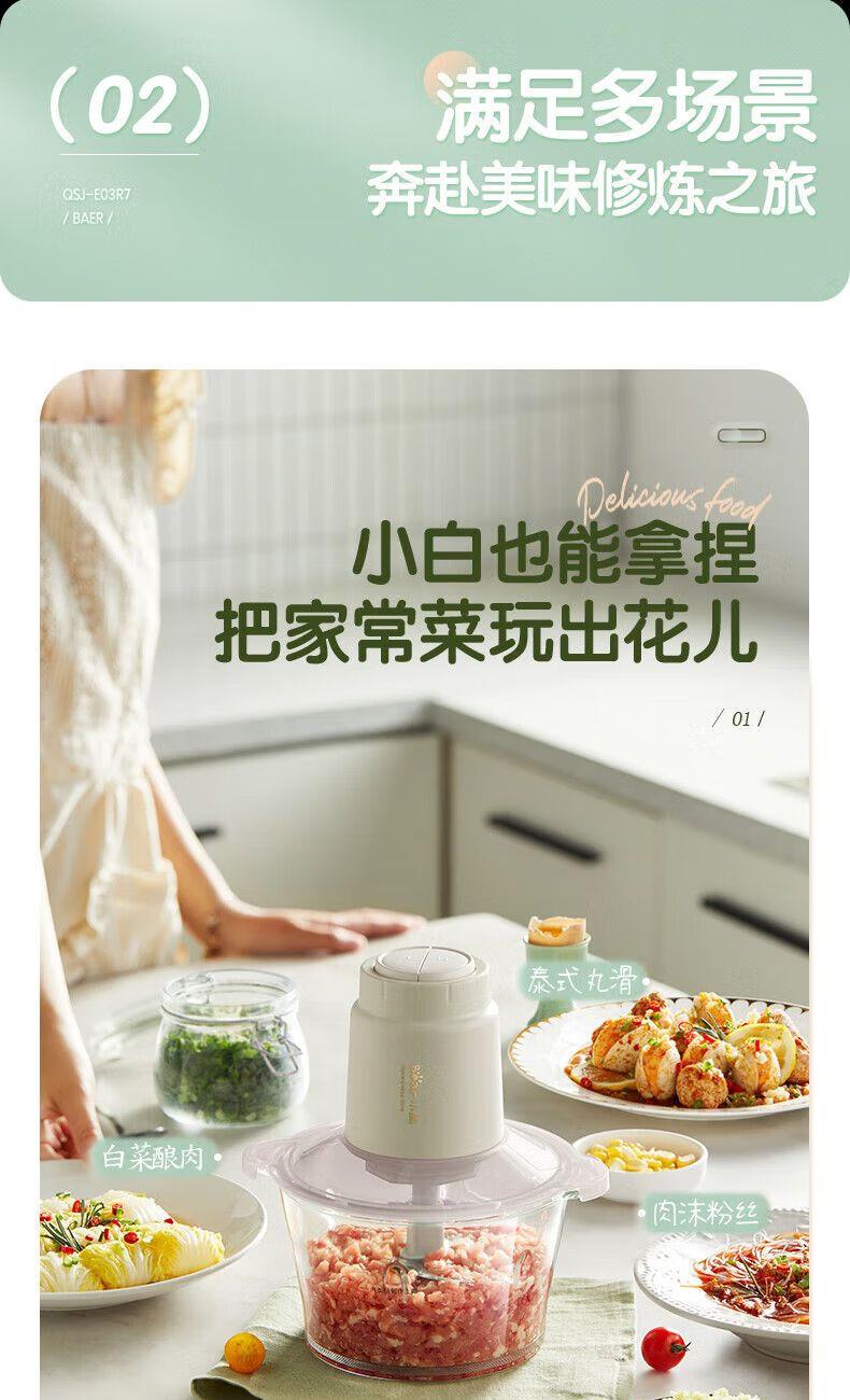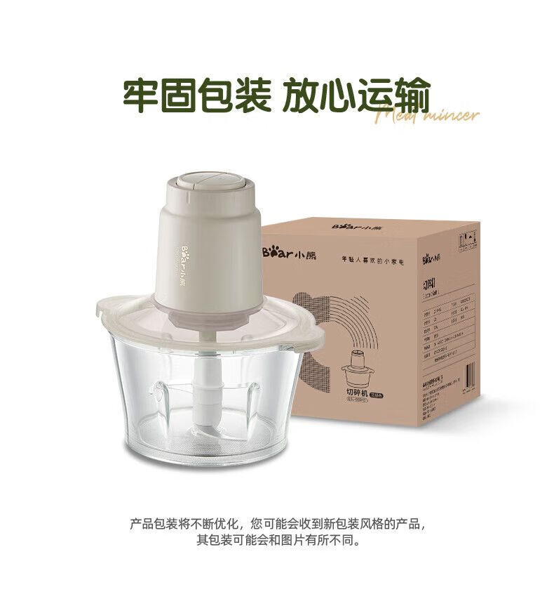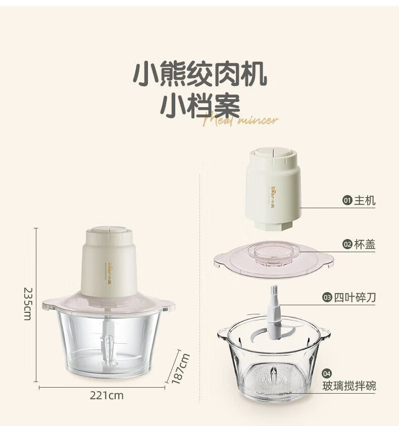 参数: 额定容量 1.8L 额定功率 300W 产品重量 1.8kg 包装尺寸 206x206x213mm 箱数 12台/箱 卖点: 1、短轴四叶刀,易清洗不塞肉 2、300W整机大功率,耐用不易损 3、约2升大容量,全家饺子宴 4、双档可选,软硬食材都兼顾
