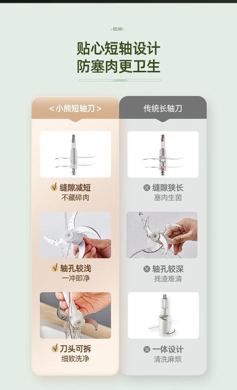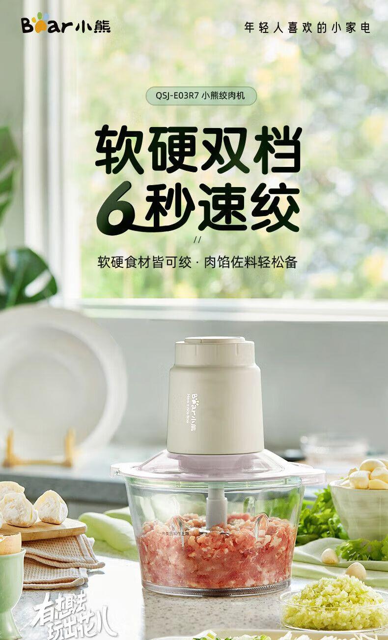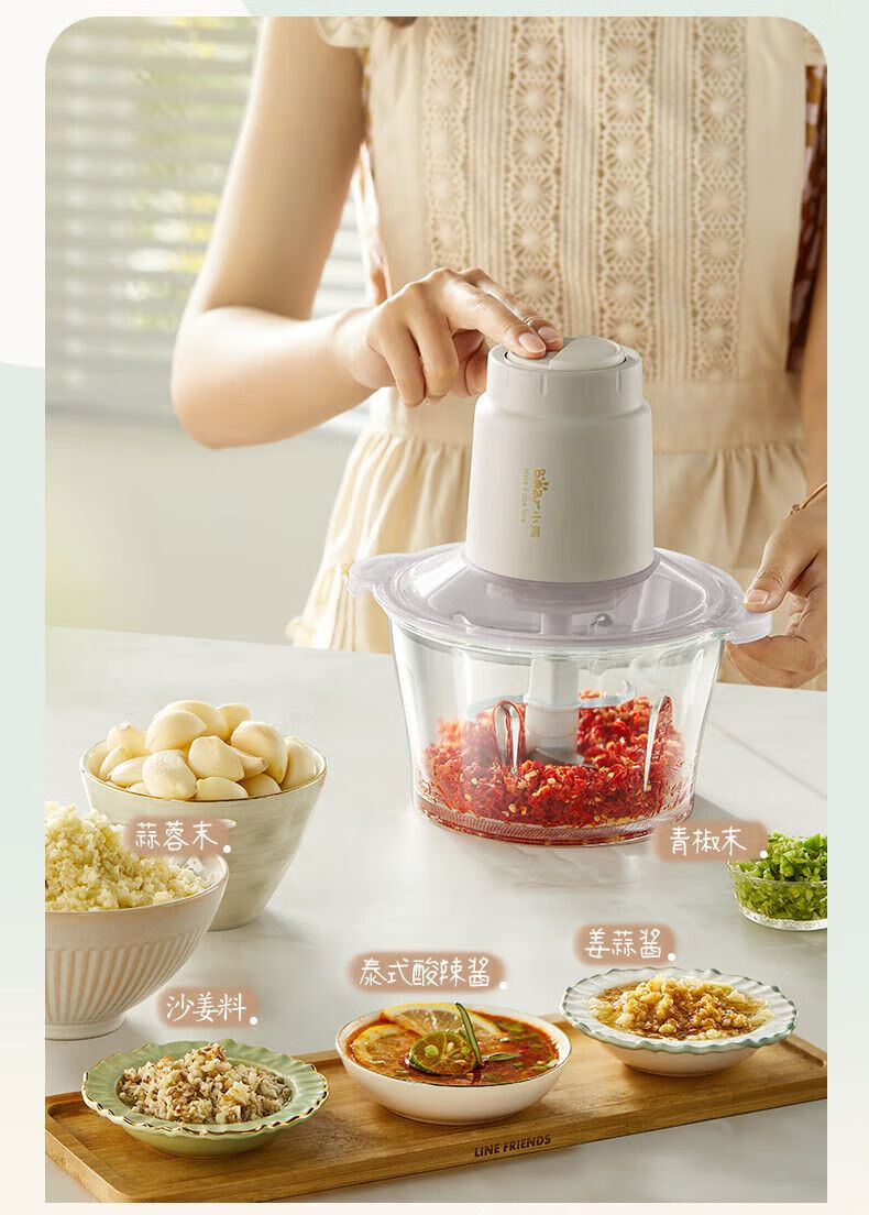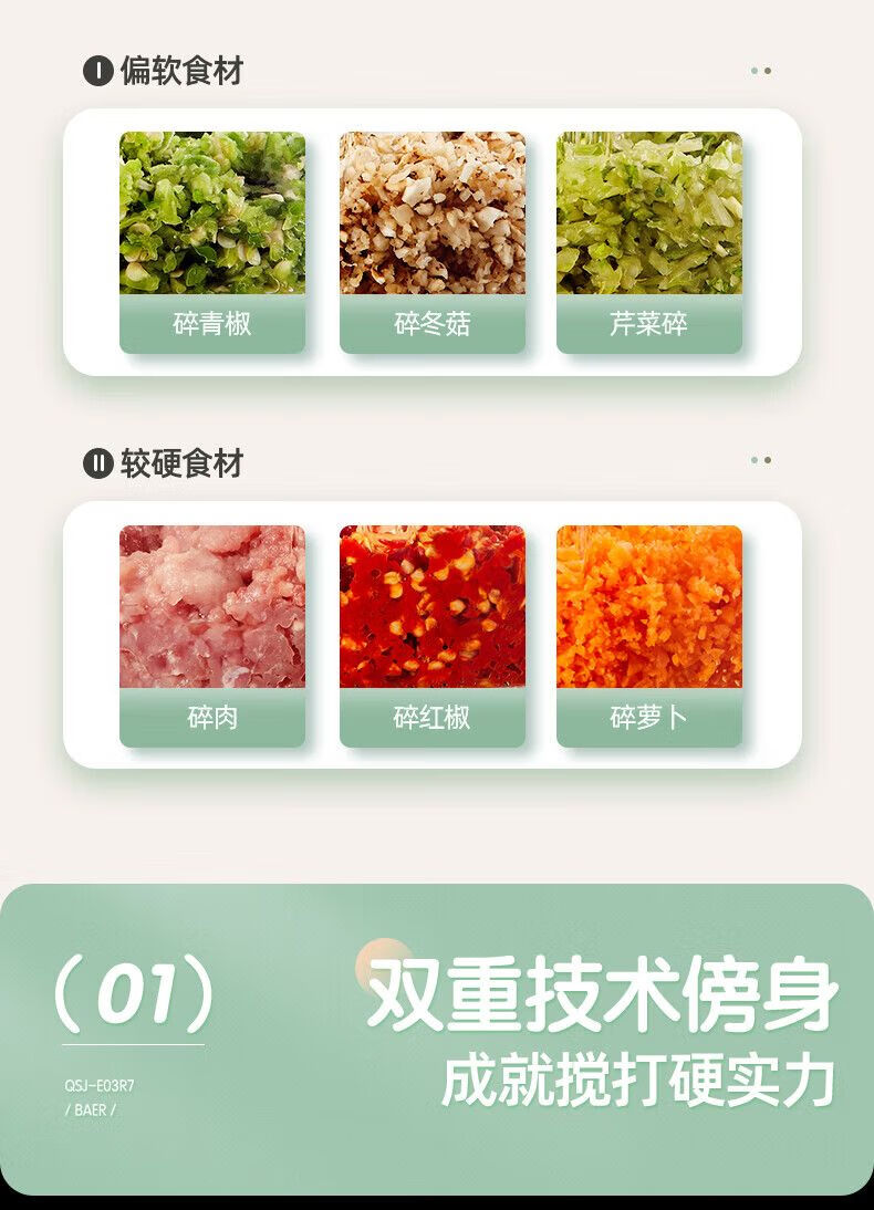 参数: 额定容量 1.8L 额定功率 300W 产品重量 1.8kg 包装尺寸 206x206x213mm 箱数 12台/箱 卖点: 1、短轴四叶刀,易清洗不塞肉 2、300W整机大功率,耐用不易损 3、约2升大容量,全家饺子宴 4、双档可选,软硬食材都兼顾