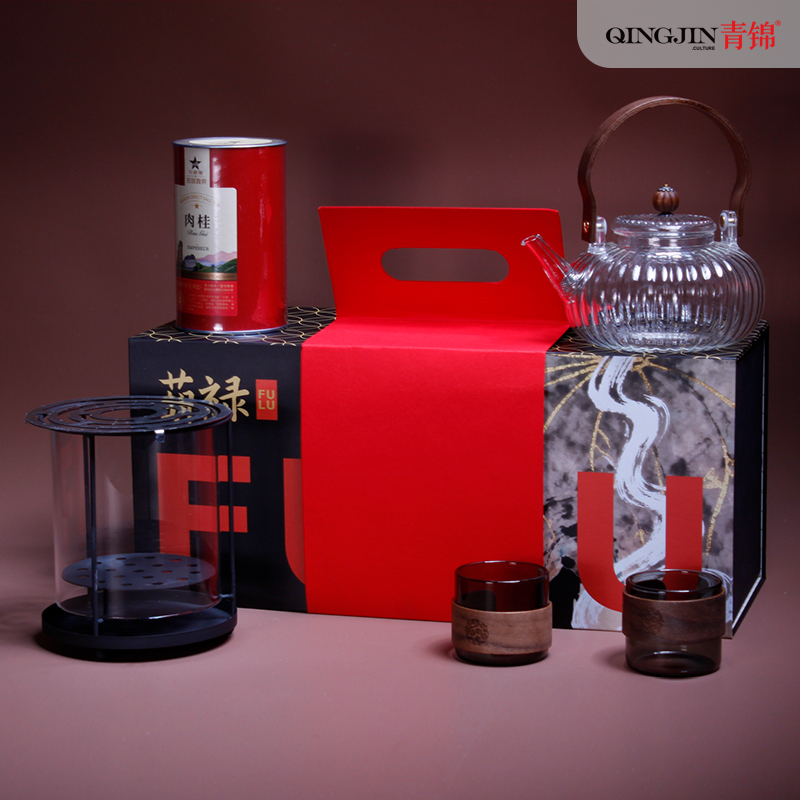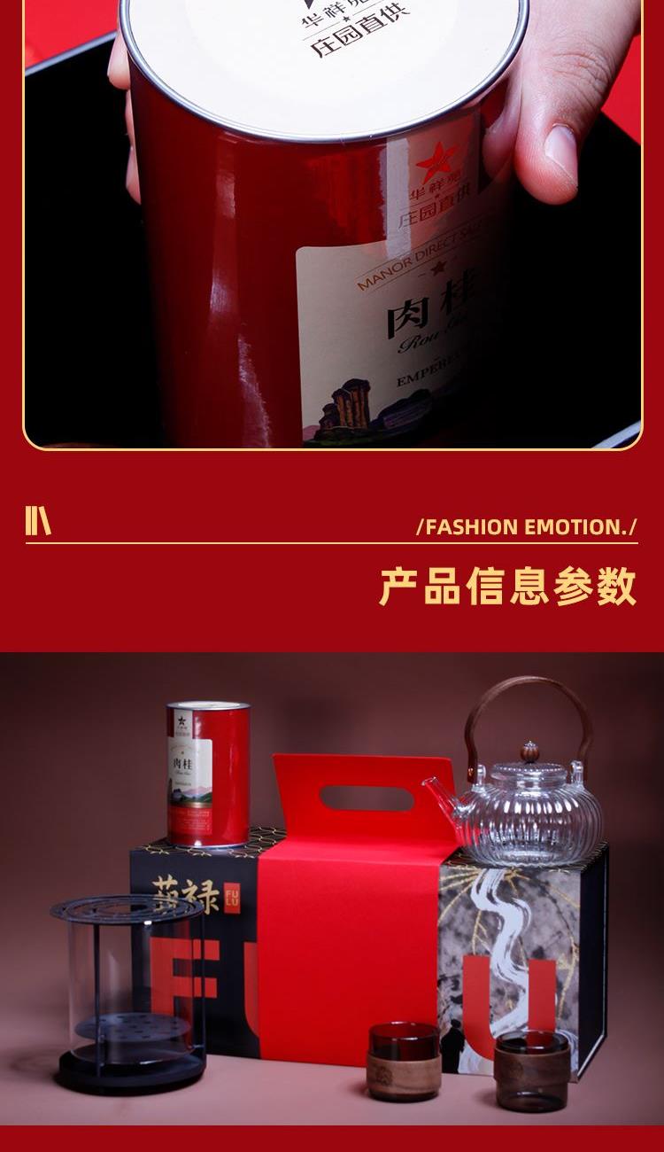 1-南瓜提梁壶*1 900ml 尺寸约 15*11.5*7.5cm 胡桃木提梁/加厚高硼玻璃/茶水分离/耐冷耐热 2-观火围炉*1 99.99%石英玻璃材质 耐1200°高温 尺寸:16.2*14.5cm 3-枪灰色玻璃茶盏*2 150ml 6*6.5cm 高硼玻璃材质胡桃木环扣 4-华祥苑武夷山肉桂*1罐 67克8包 5-精装实用性礼盒*1 包装可做挂历
