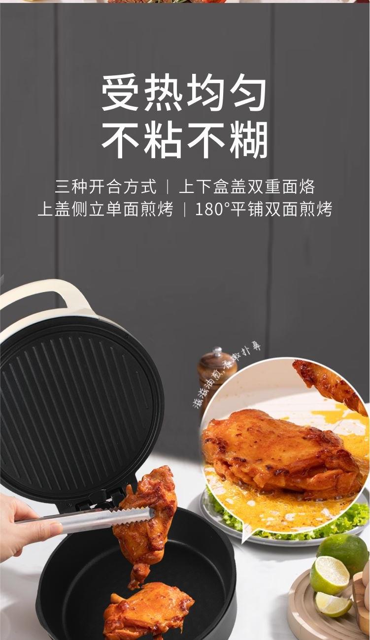 产品参数 额定功率:1800W 烤盘尺寸:28cm 产品特点 1、6.5cm加深下盘大容量,涮烤一体式更好用 2、上下盘双面独立控温,可单独开关上盘或者下盘 3、1800W大火力内嵌式高碳钢防爆发热管 4、合金盘体一体压铸成型,受热均匀不粘不糊 5、三种开合方式,上下盒盖双重面烙、上盖侧立单面煎烤、180°平铺双面煎烤