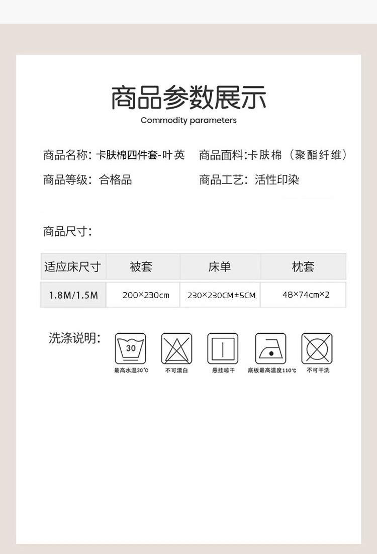 规格: 床单:230*230cm±5cm 被罩:200*230cm 枕套:48*74cmx2 面料:卡肤棉(聚酯纤维) 1、卡肤棉面料,采用新一代活性印染工艺,健康环保 2、棉质透气,吸湿亲肤舒适,轻薄透气,缩水率低