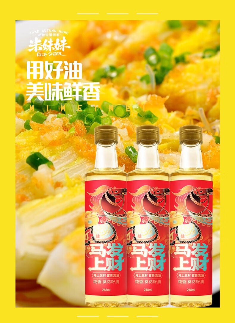 1.葵花籽油属于低脂油类,表面看色泽金黄、清明透亮、口感纯正。 2.葵花籽油中亚油酸含量高,其中不含芥酸、黄曲霉素等有害物质,食用安全健康。 3.精美手提盒包装 吉食送福,福到中国年。