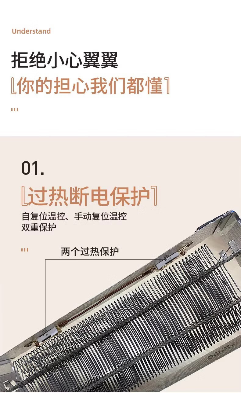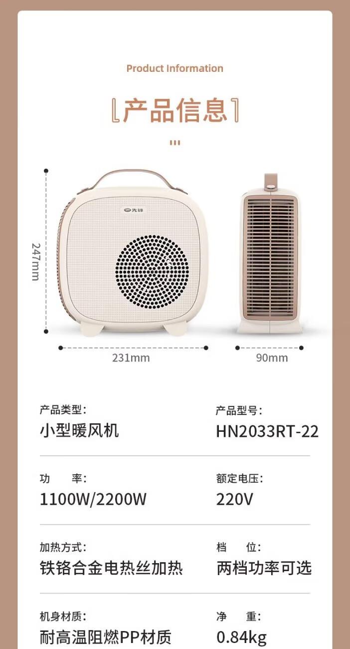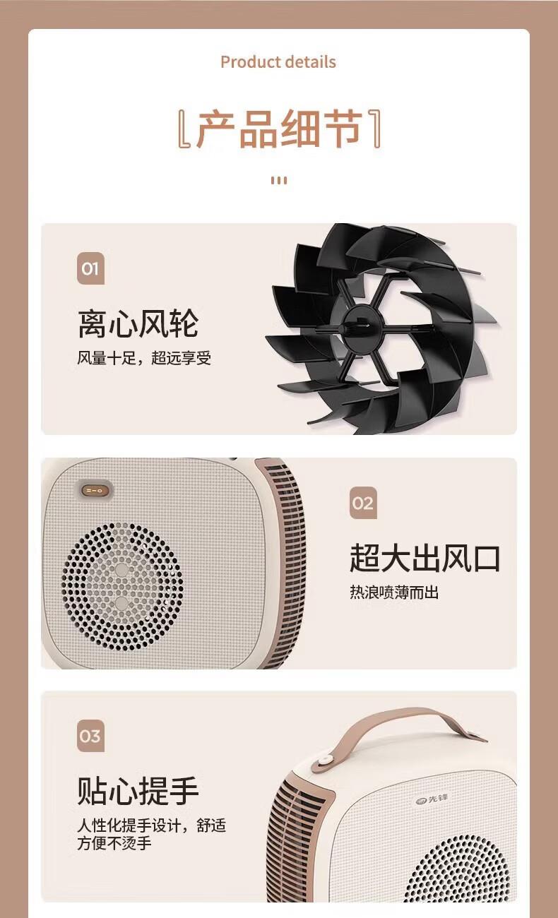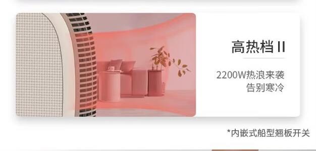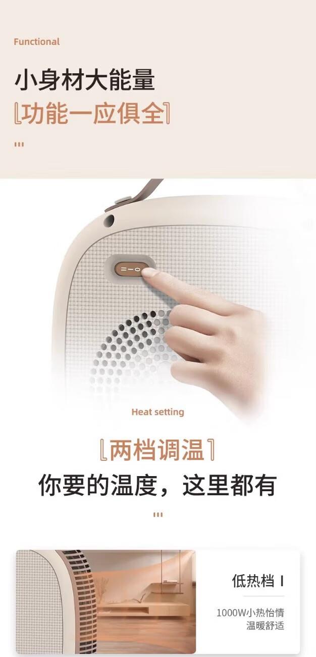 极简外观设计 2200W高功率,取暖效果更佳 超大出风口 贴心提手,拎起就走 内嵌式船型翘板开关,操作简单 专业风道设计,声音低、热效高 离心风轮、风量大,距离远 耐高温阻燃材料 安全 放心 手动复位温控 采用 PTC 陶瓷加热,有 2 档功率可选,机械式控制,具备恒温功能和倾倒断电保护,适用于 10㎡以下空间。