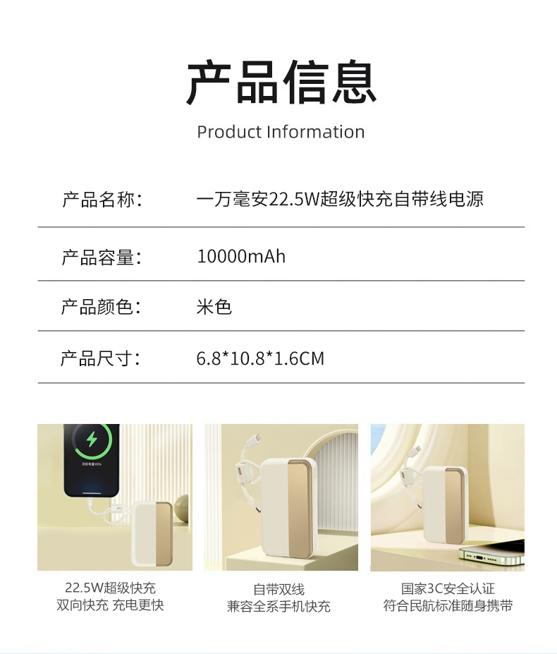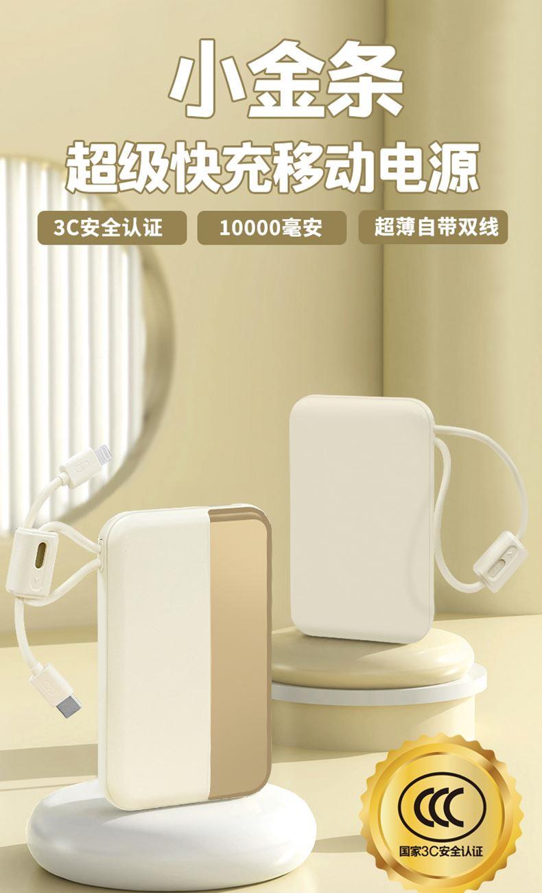 1、小金条22.5W自带线移动电源 10000毫安实标容量, 3C安全认证 22.5W超级快充,兼容PD20W 内置苹果/Type-C接口满足各种手机充电 超薄设计,携带方便 符合民航局标准,可随身携带 2、66W铝合金超级快充一拖三伸缩数据线 兼容苹果15系列 五档伸缩调节 1.2米长度设计 铝合金面盖 三种充电接口满足各种手机 备注:报价不含手提袋