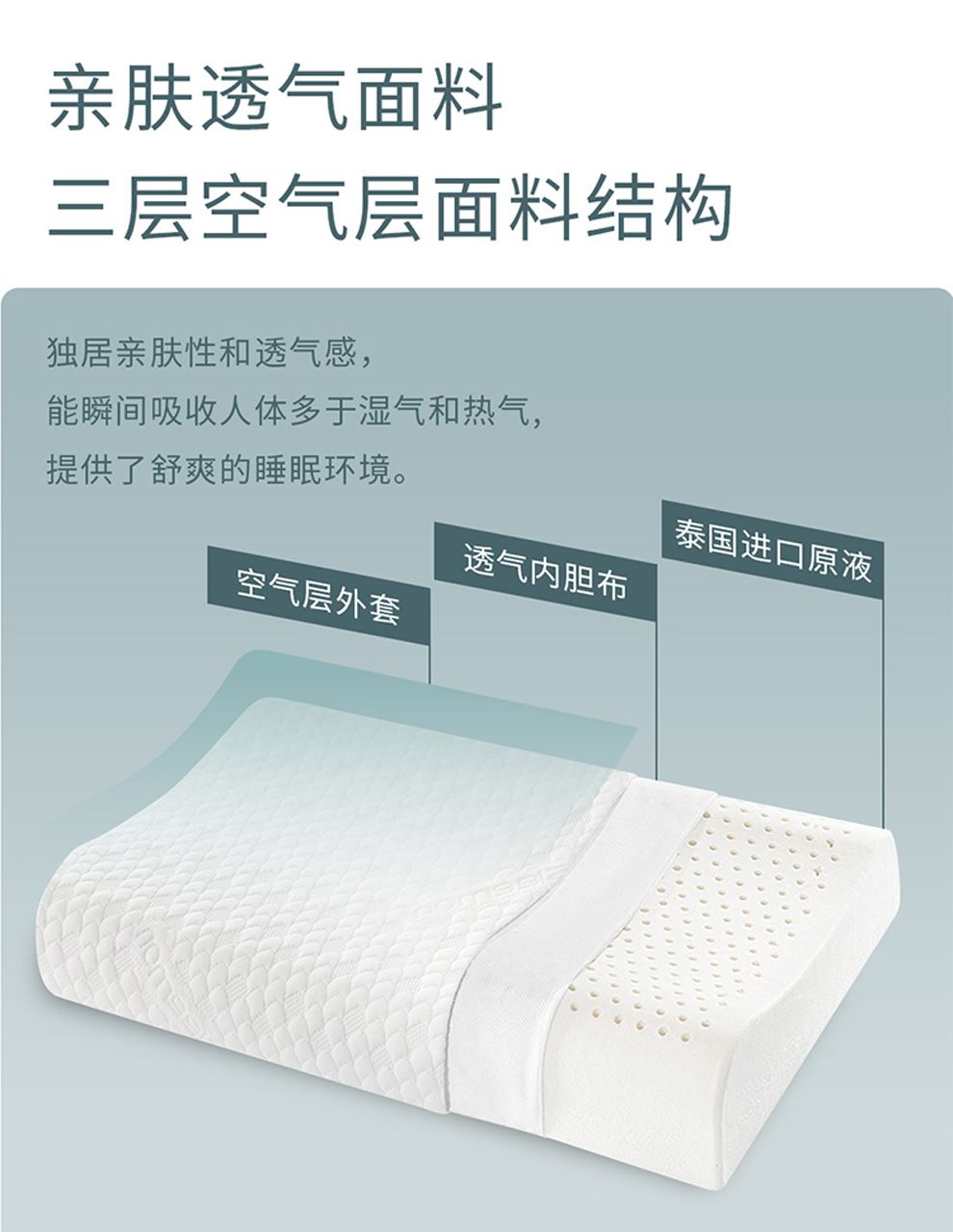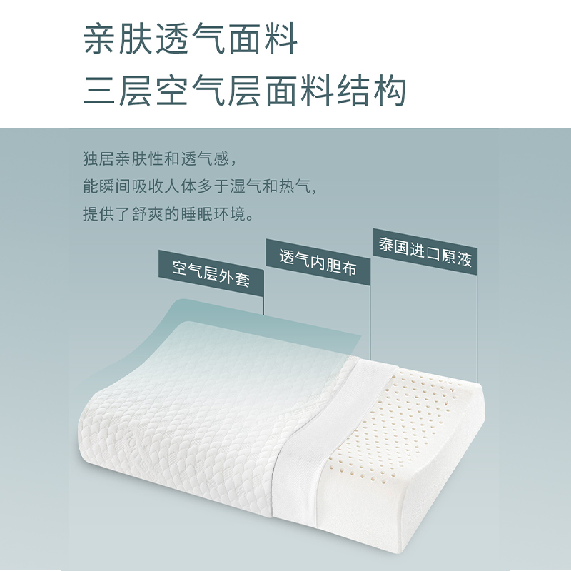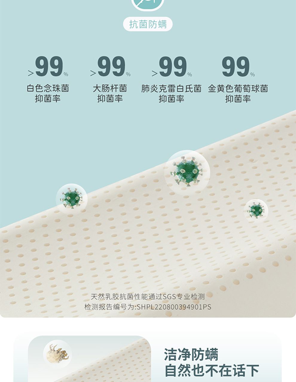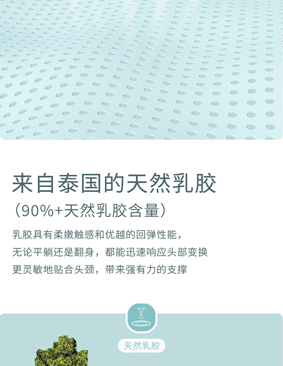 4.泰国天然乳胶:具有柔嫩触感和高效回弹性能,无论平躺还是翻身,都能迅速响应头部变换,更灵敏地贴合头颈。而且天然乳胶蛋白具有抑制细菌和防螨效果,守护身体健康