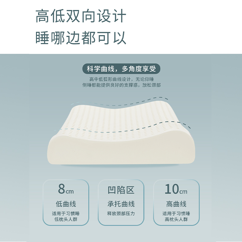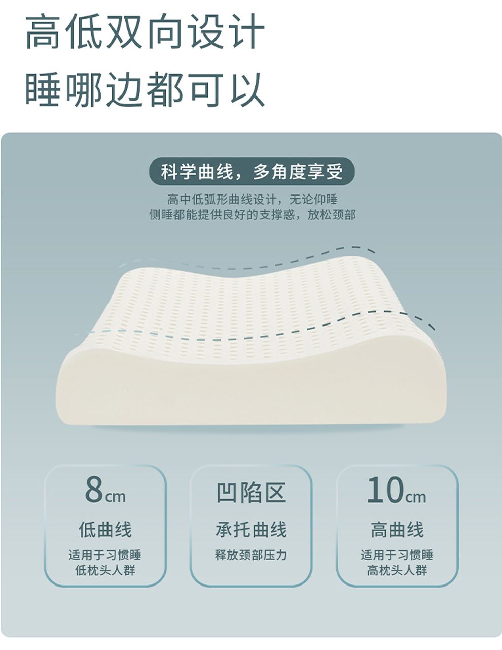 2.高低双向设计:高中低弧形曲线设计,无论仰睡侧睡都能提供良好的支撑惑,放松颈部