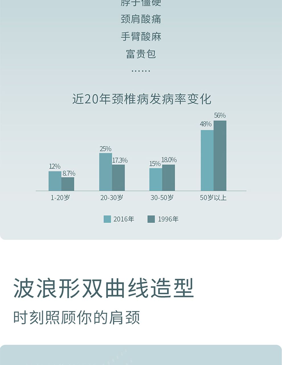 1.波浪形双曲线造型:深度考量人体工程学,任意角度都能贴合颈椎曲线,时刻照顾你的肩颈
