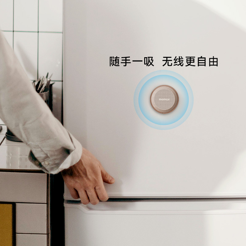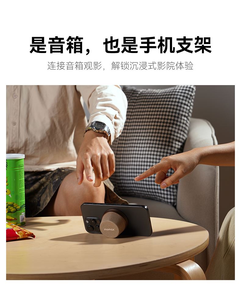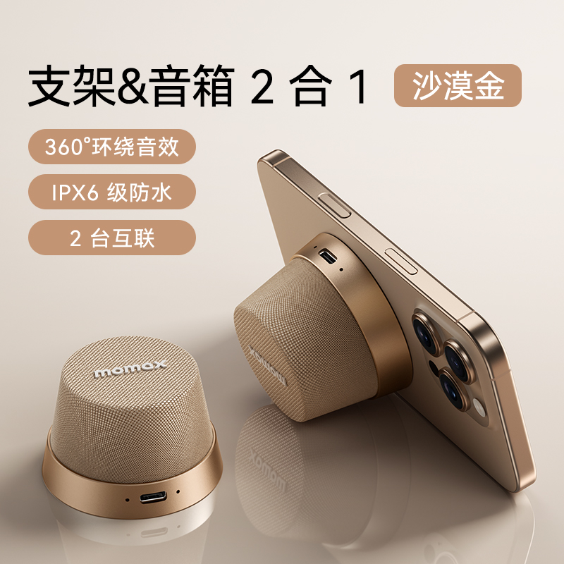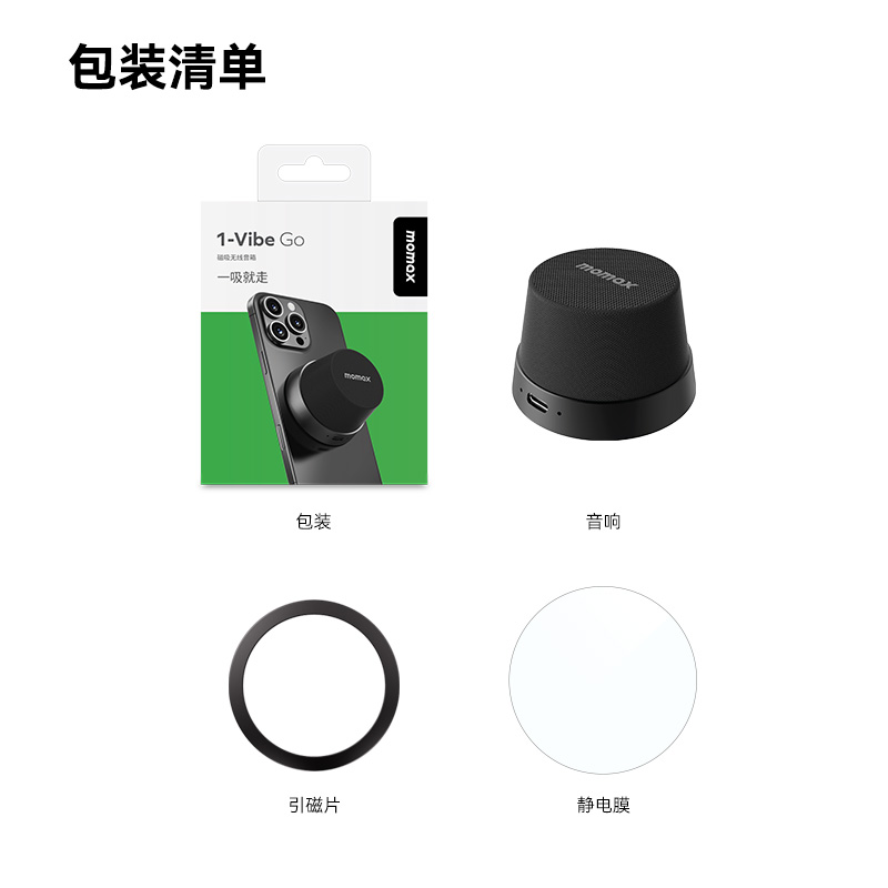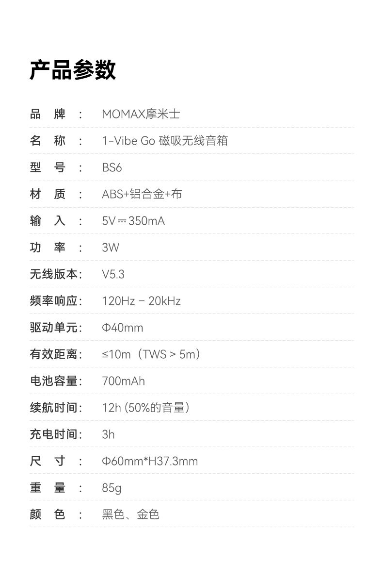 产品材质:ABS+PC 输入:5V⎓350mA 额定输出功率:3W 无线版本:V5.3 有效距离:≤10m(TWS > 5m) 电池容量:700mAh 续航时间:12h 充电时间:3h 尺寸:Φ60mm*37.3mm 重量:85g ± 5g 颜色:黑色,金色 超迷你磁吸,支架&音箱2合1 内置磁吸模块,随意吸附,是音箱,也是手机支架