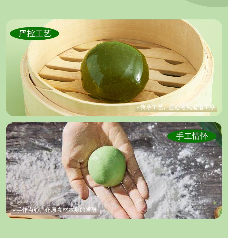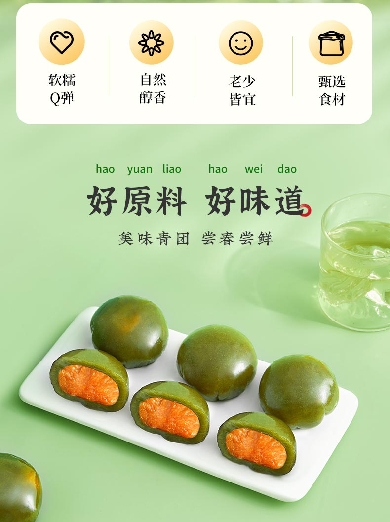 保质期:45天 产品明细:蛋黄肉松青团60g*6 产品介绍: 经典白月光口味!爆款中爆款 1.只用好料,专做好物:甄选优质糯米制成软糯外皮,软糯Q弹,自然醇香;甄选新鲜采摘艾草,制成鲜汁,融入青团,原滋原味 2.甄选海鸭蛋搭配咸香肉松,如丝如絮,咸甜皆有 3.手工制作,不添加防腐剂,新鲜短保,食用更放心