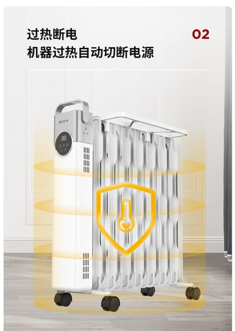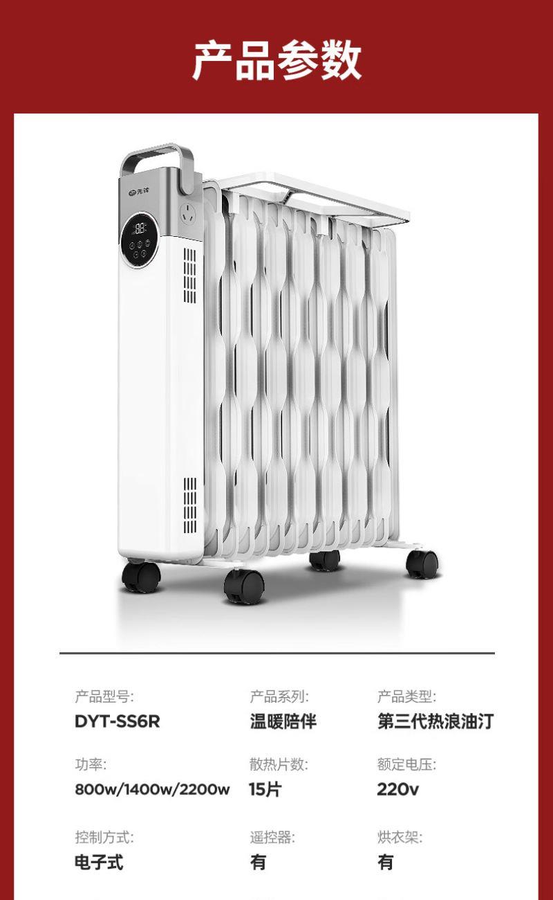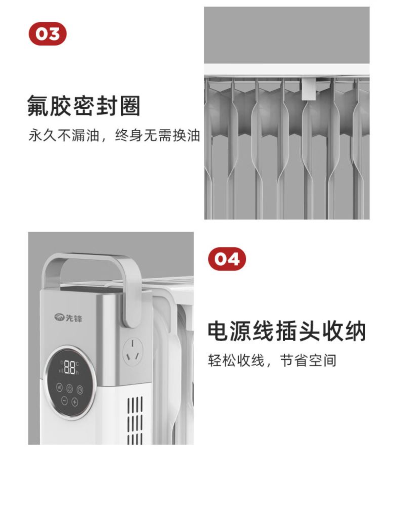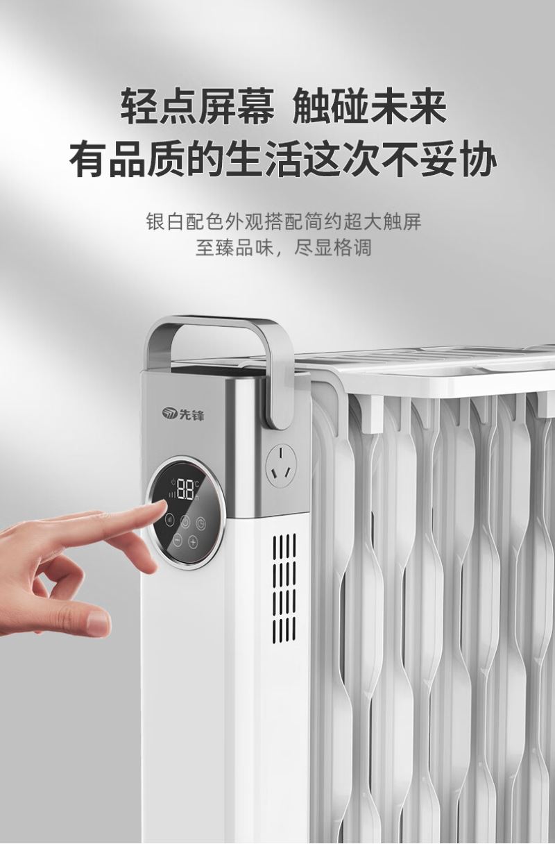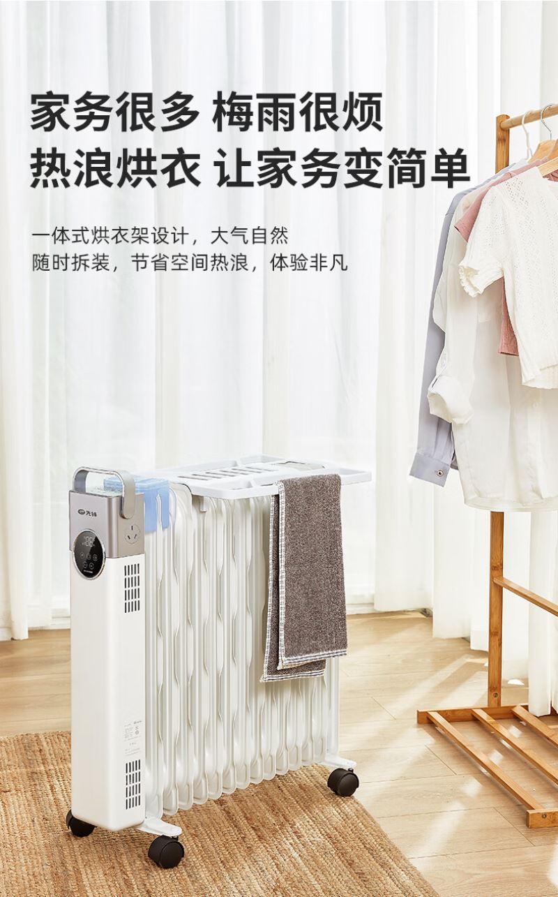 小热浪型油汀体,升温速度快,散热面积大 一体式烘衣架设计 顶部人性化可旋转式提手设计与整机融合一体,推拉移动更便捷 人性化内嵌式自然蒸发式水盒设计,加湿空气不干燥 超大显示屏设计,触屏操作,人机交互简单方便 24小时预约开关机, 6m远距离遥控