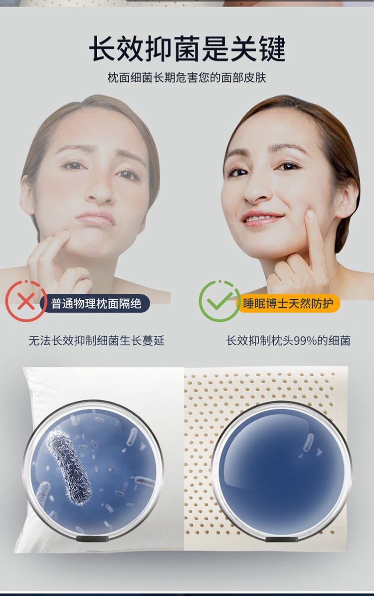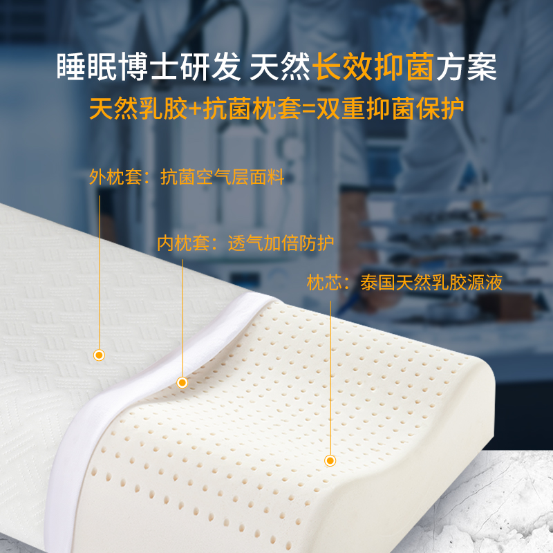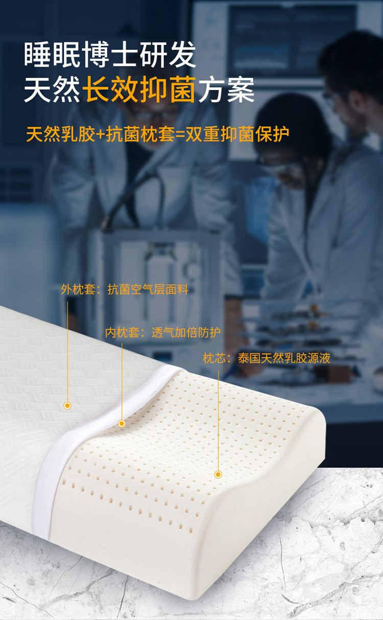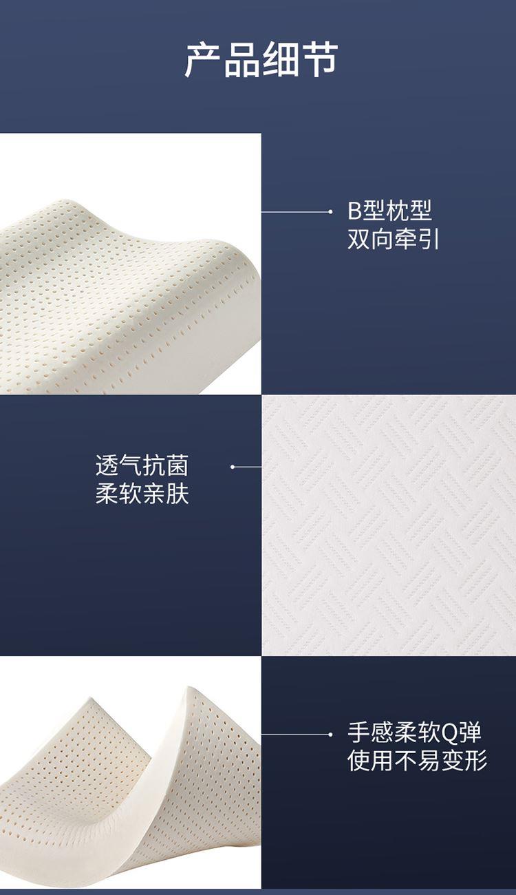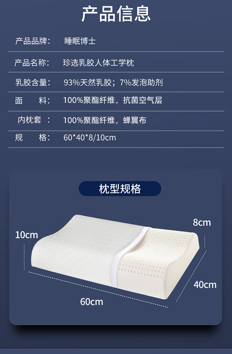 条码:6946592145993 规格:60*40*8/10cm(白色) 枕套:99.9%聚酯纤维 内枕套:99.9%聚酯纤维 内芯:93%乳胶,7%发泡助剂 设计:泰国进口乳胶原料,源自泰国,国内制造,锁定93%+乳胶,舒适清新;工学设计,释放压力,放松肩膀,乳胶独具的透气孔,打造空气微循环,保持睡眠干燥舒适。 适合人群:各类人群