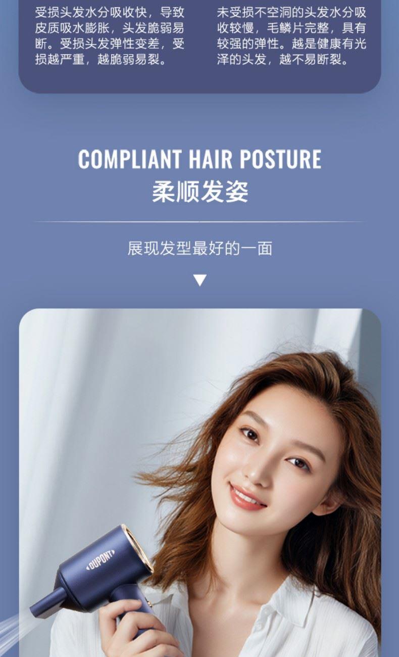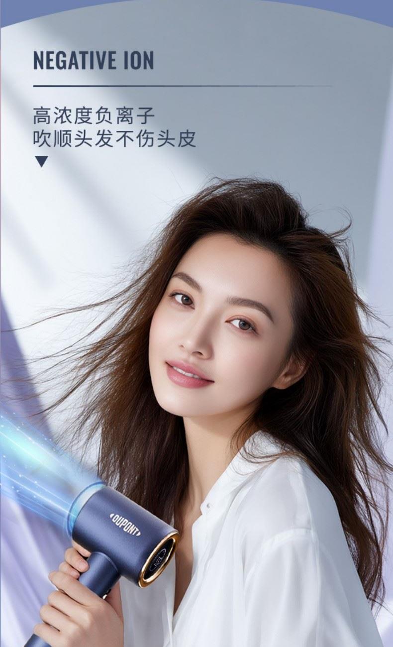 高浓度负离子,内置负离子发生器,持续中和静电,抚平毛躁。