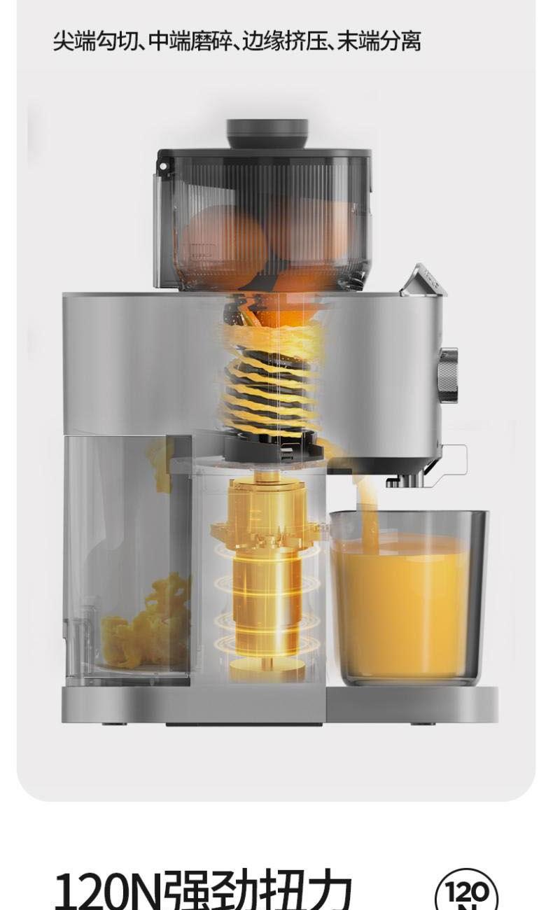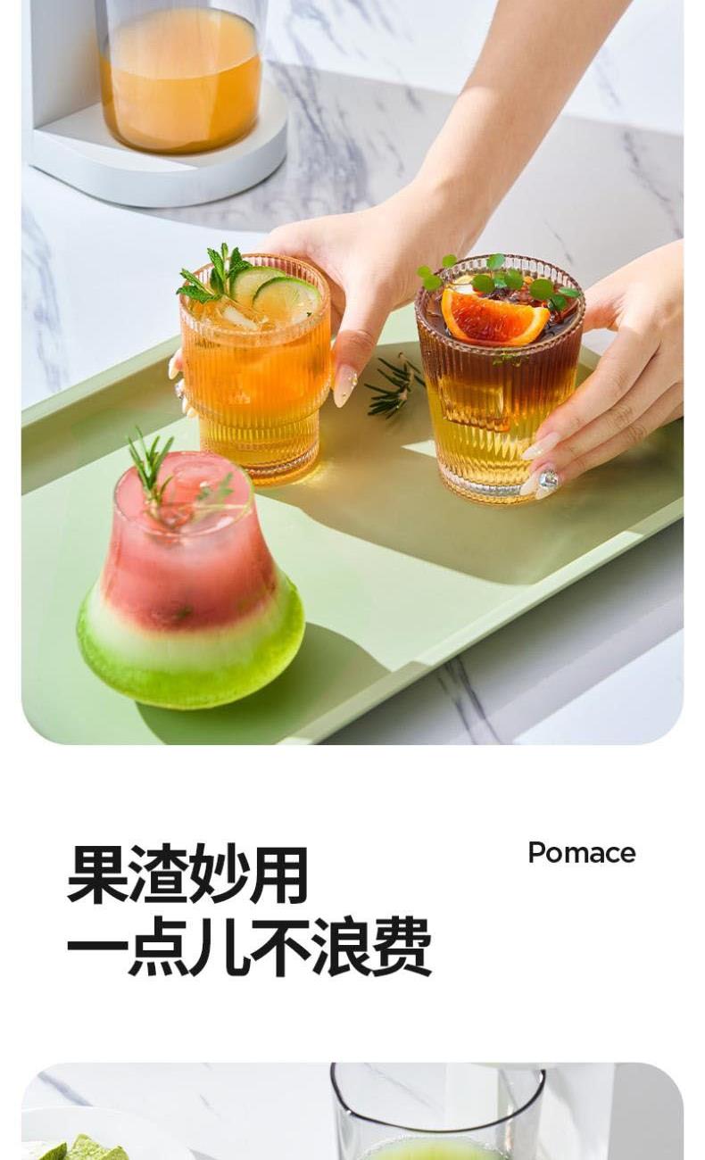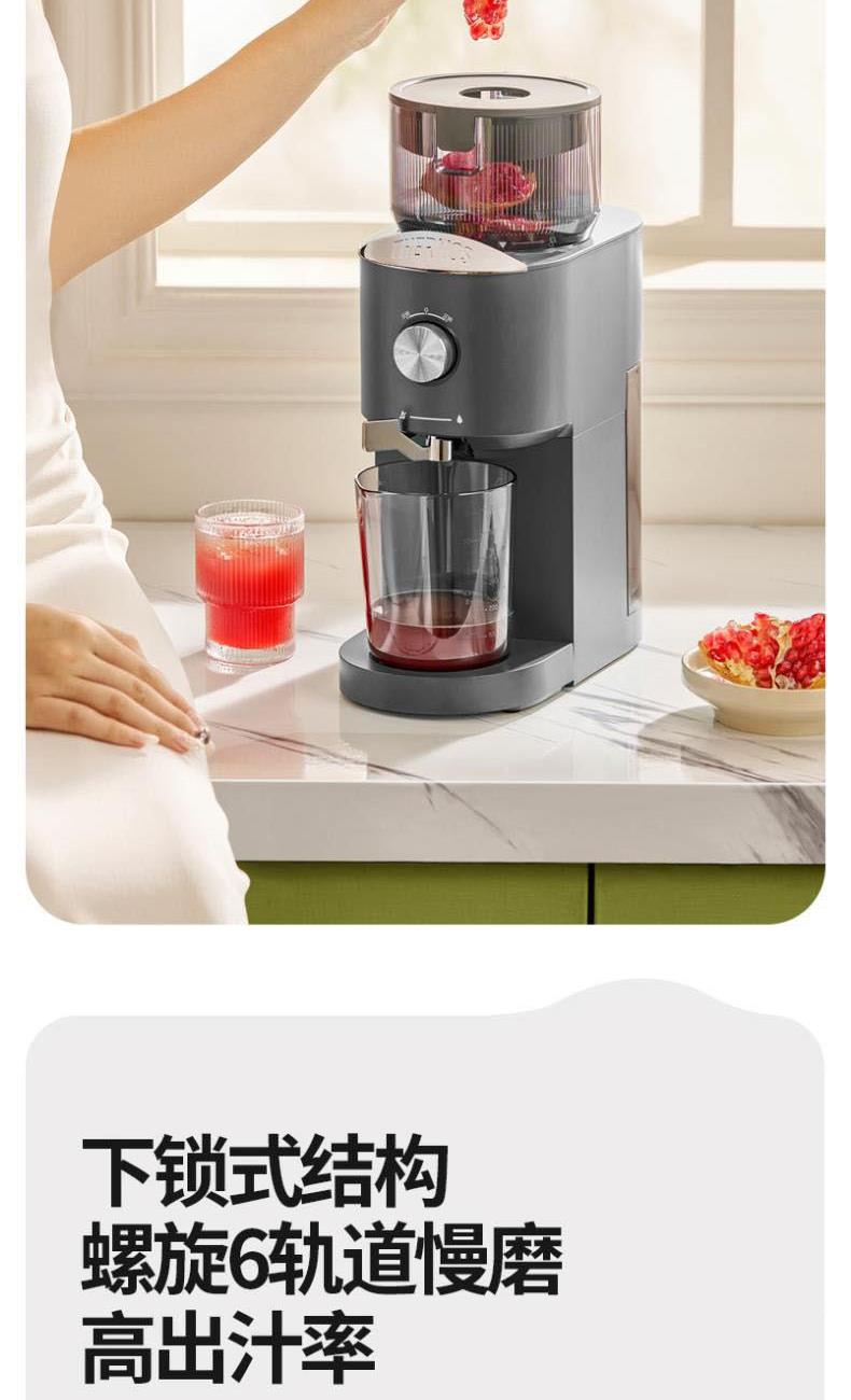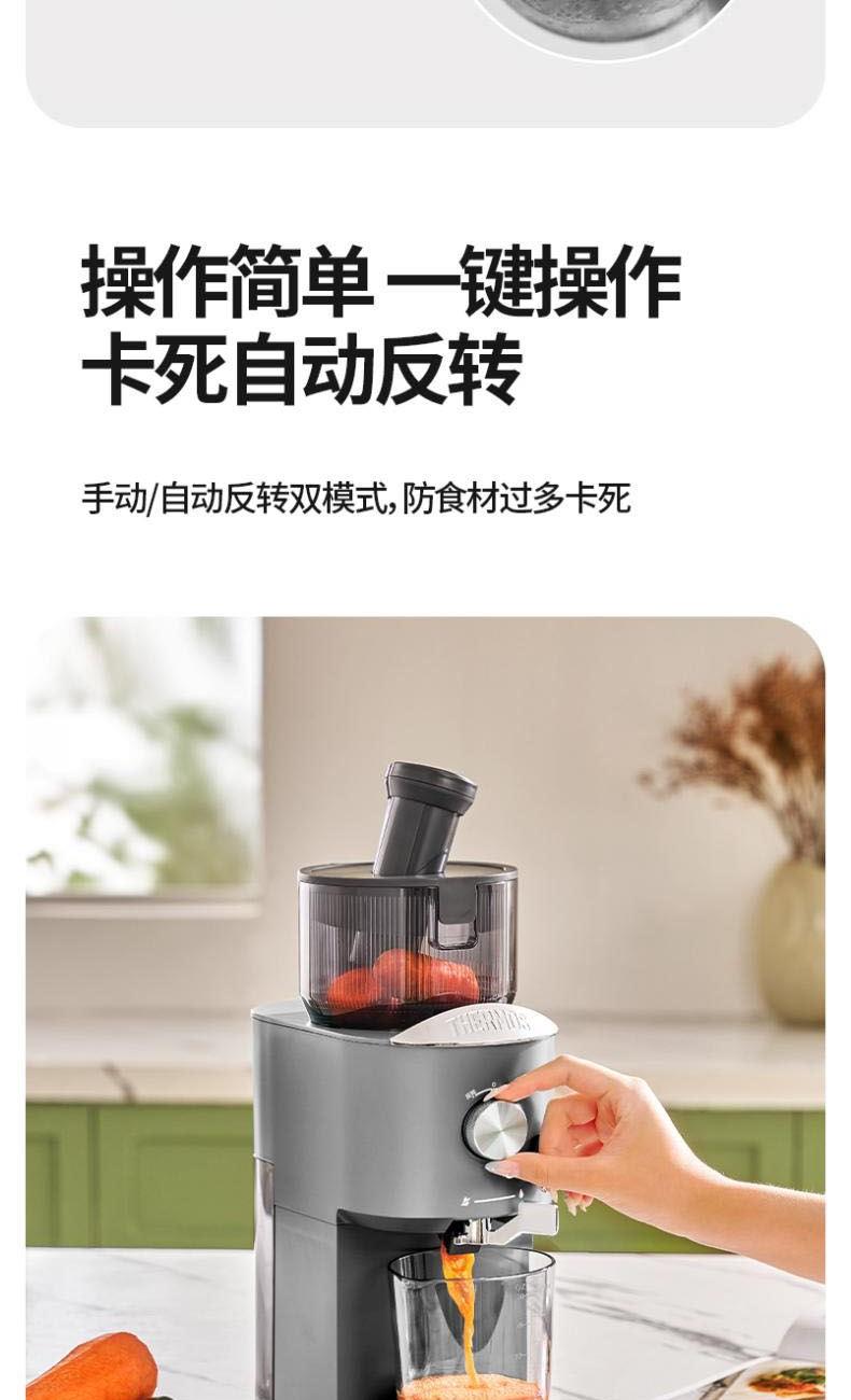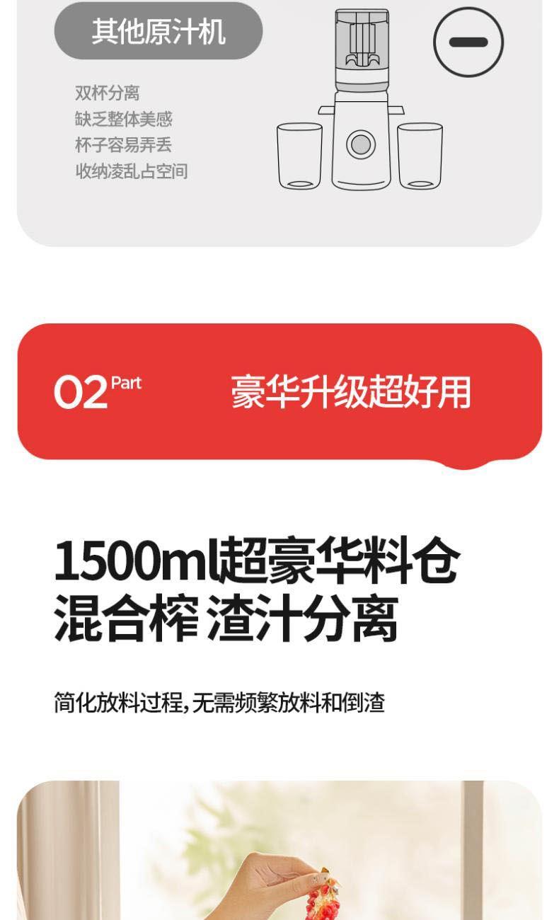 额定电源 :220V~50Hz 额定功率 : 100W 接汁杯容量:1.5L 接渣桶容量:0.9L 净 重 : 2.8kg 产品尺寸 :275mmx140mm x383mm (含推进杆)