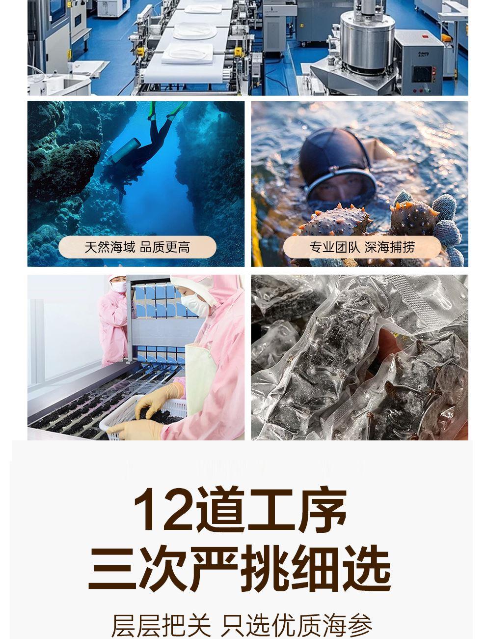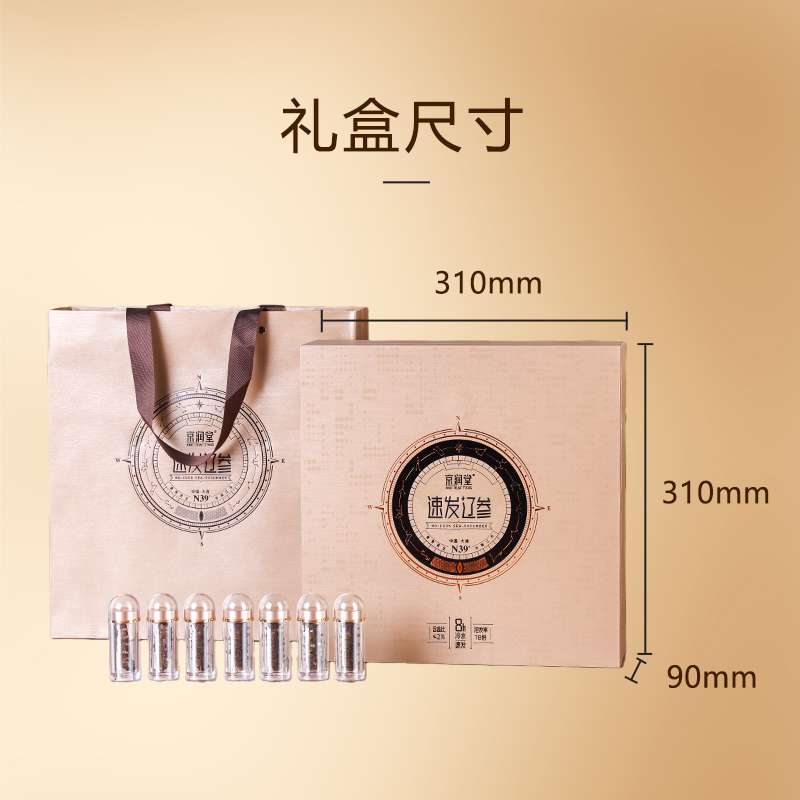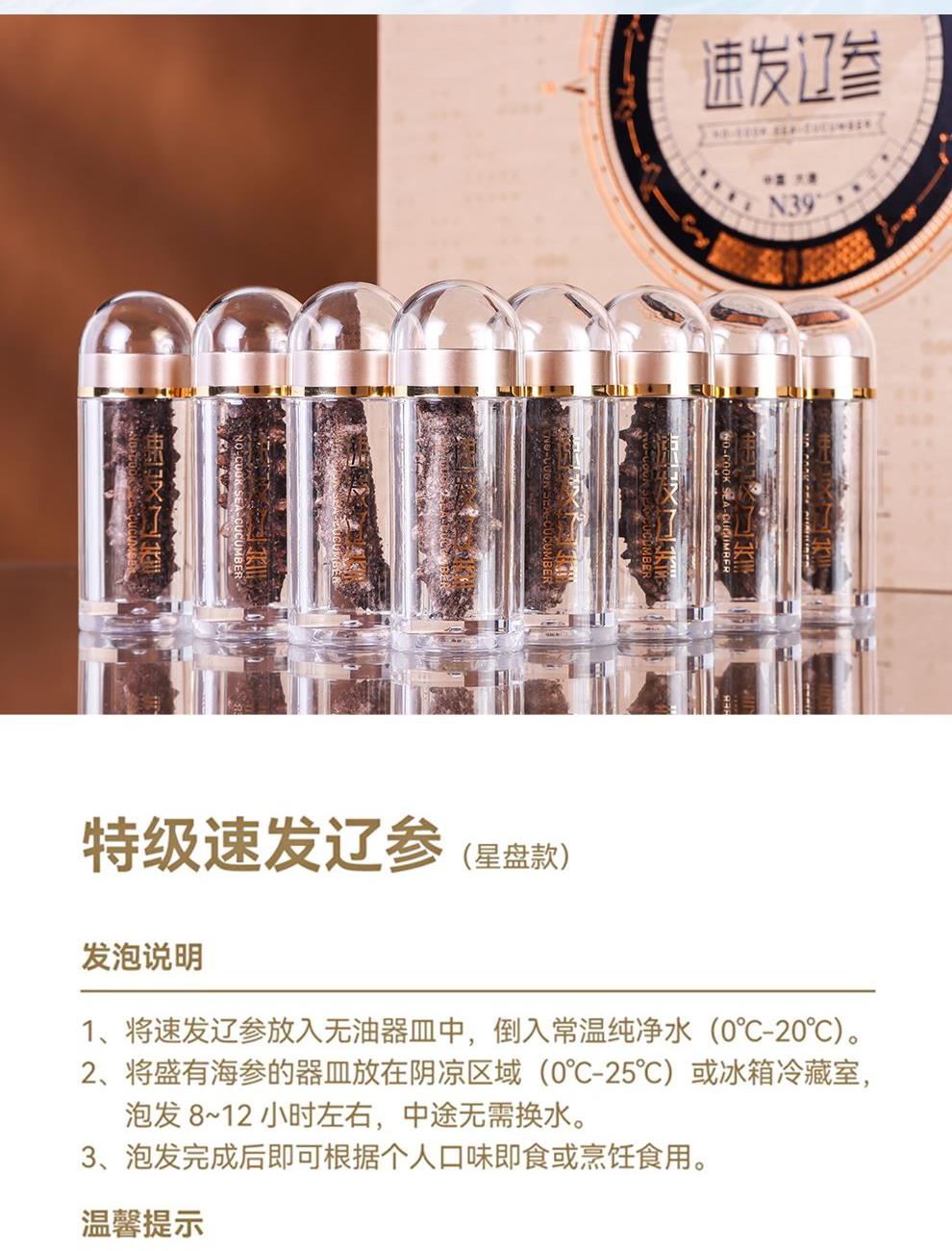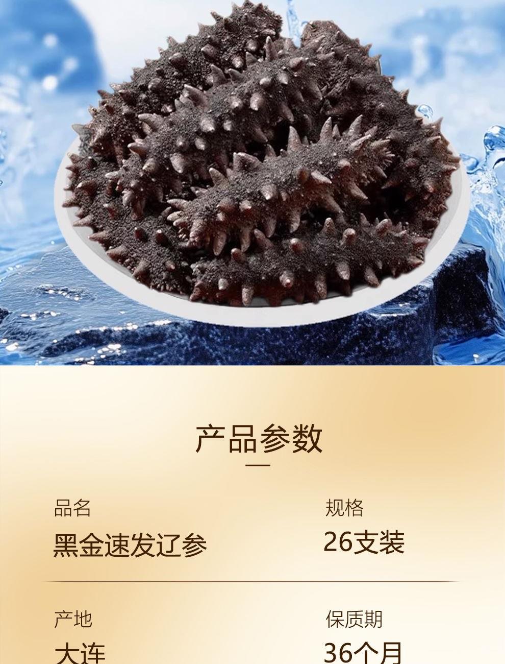 规格:26支/盒 卖点: 1、大连海参原产地,黄金海域北纬39° ,底播散养。 2、含盐量≤2% 优于干海参特级标准。 3、冷水速发工艺,保留海参营养。 4、方便快捷,支持8小时冷水速发 。 5、独立小瓶装 随身携带 滋补更简单。