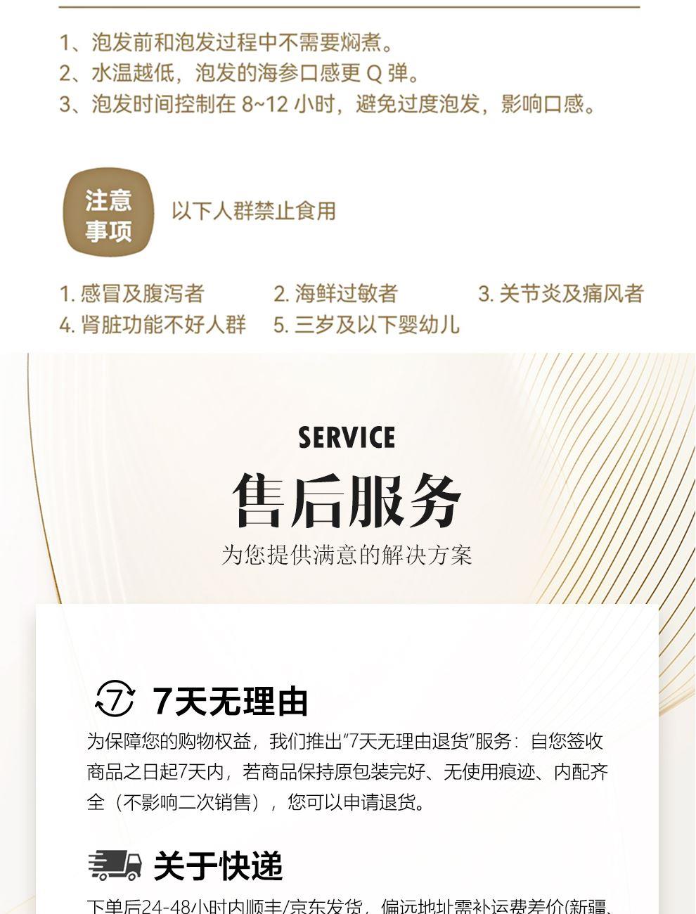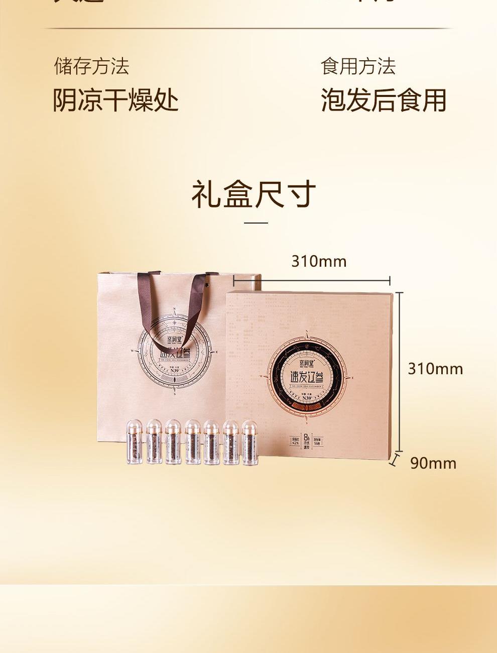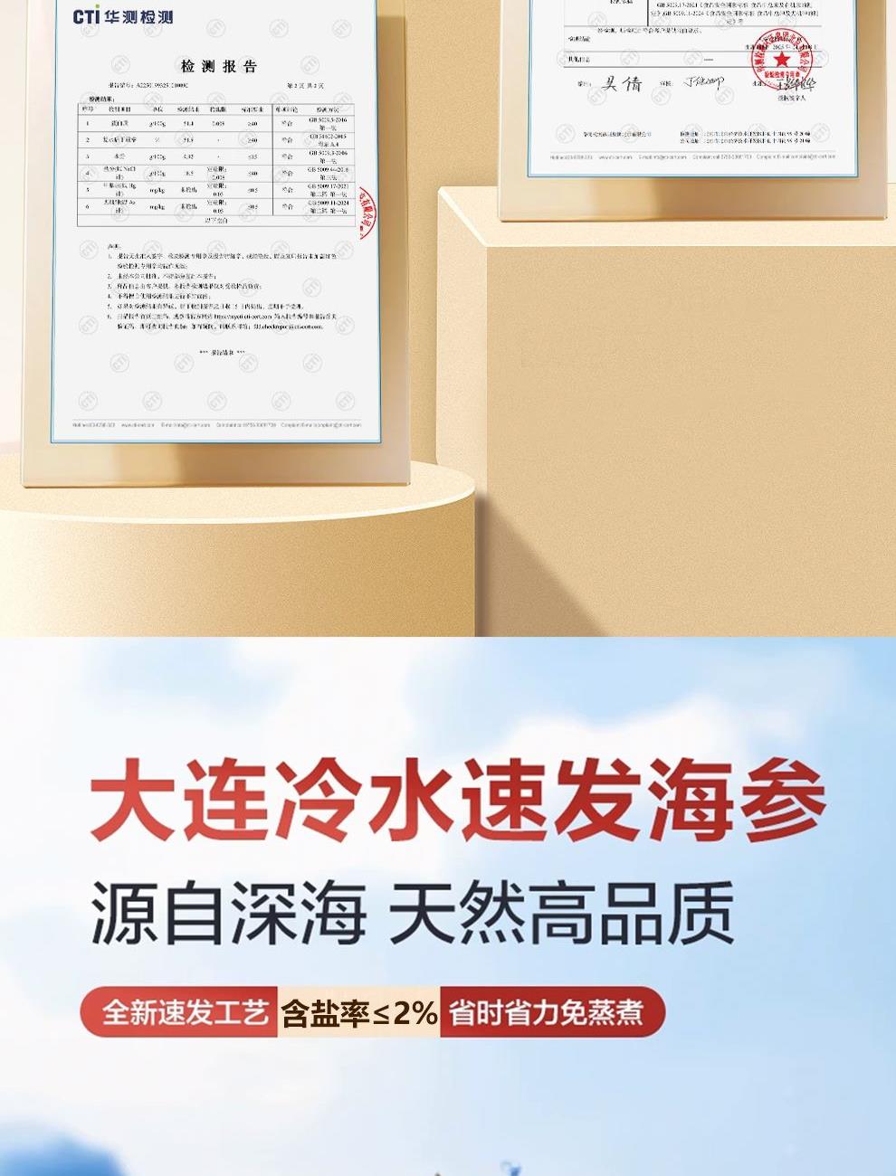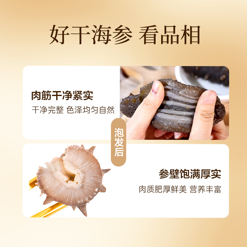 规格:26支/盒 卖点: 1、大连海参原产地,黄金海域北纬39° ,底播散养。 2、含盐量≤2% 优于干海参特级标准。 3、冷水速发工艺,保留海参营养。 4、方便快捷,支持8小时冷水速发 。 5、独立小瓶装 随身携带 滋补更简单。