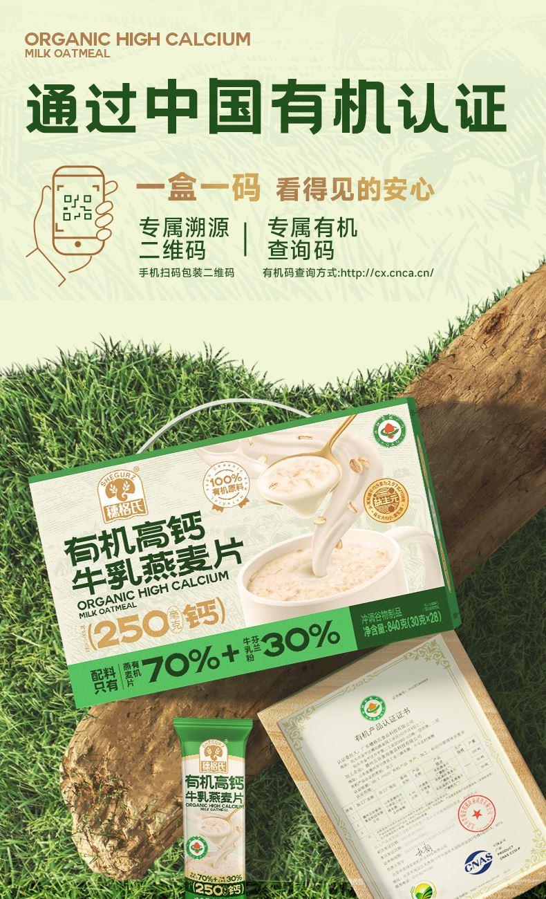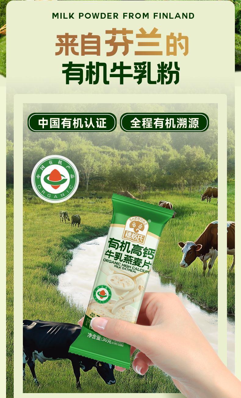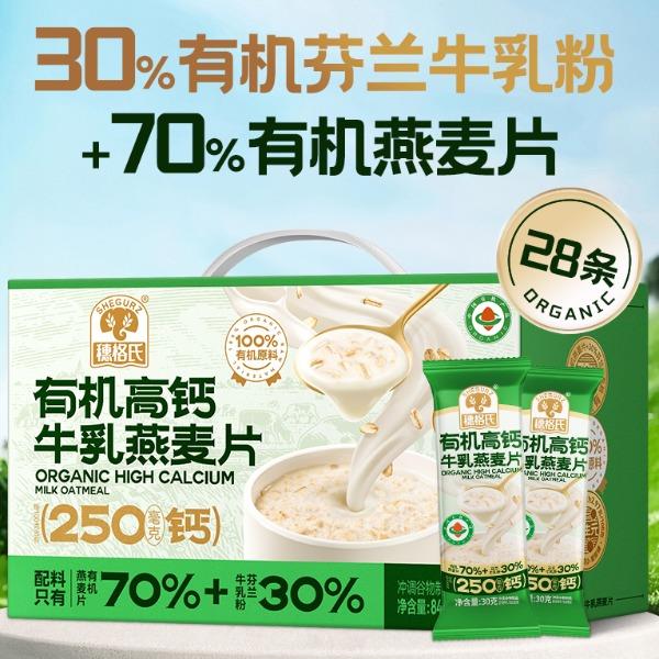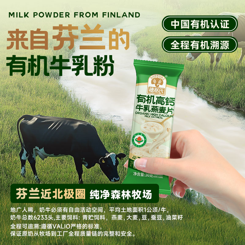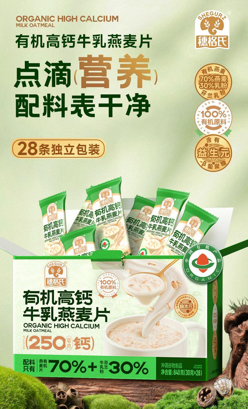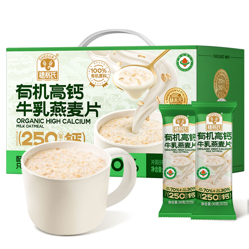 穗格氏有机高钙牛乳燕麦片礼盒840g(30g*28条) 配料表:有机燕麦片(70%),有机牛乳粉(30%) 卖点: 1,配料表干净,仅有燕麦片和牛乳粉; 2,甄选芬兰进口有机奶粉; 3,穗格氏专属有机种植基地,张家口市农业科学院育成品种“坝莜一号”; 4,奶香浓郁,健康高钙; 5,每100g有机高钙牛乳燕麦片的蛋白质含量约等于全脂牛奶的4.7倍; 6,通过中国有机认证,专属朔源二维码,专属有机查询码,一盒一码; 7,上班族,宝爸宝妈,长辈皆可安心食用。