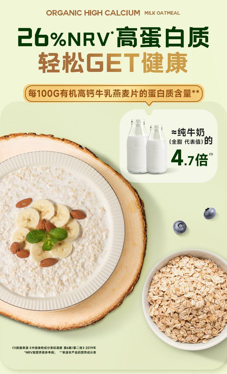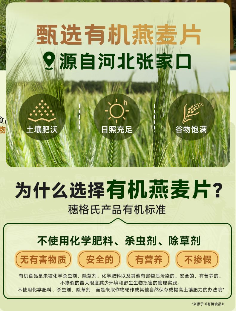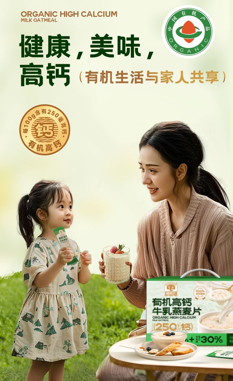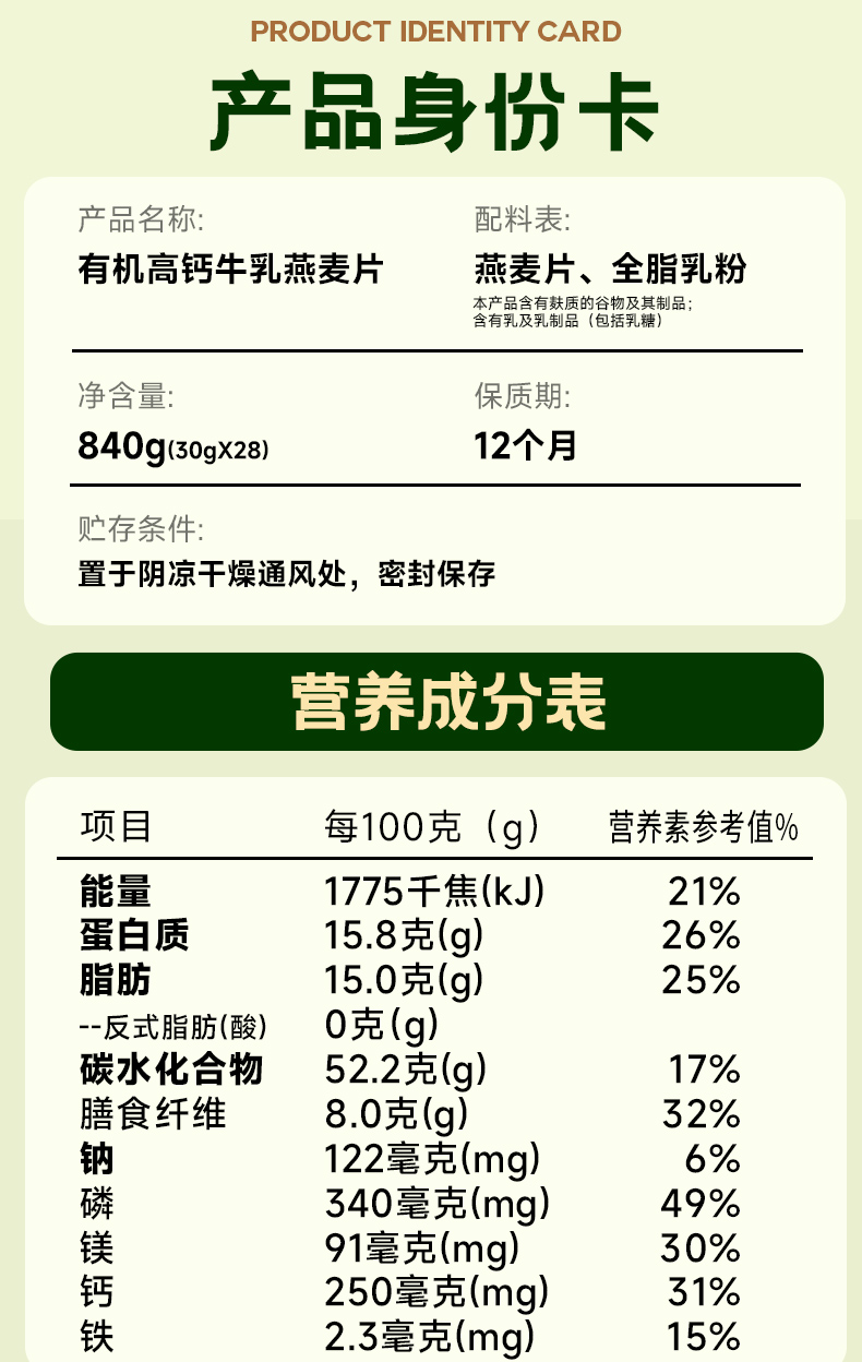 穗格氏有机高钙牛乳燕麦片礼盒840g(30g*28条) 配料表:有机燕麦片(70%),有机牛乳粉(30%) 卖点: 1,配料表干净,仅有燕麦片和牛乳粉; 2,甄选芬兰进口有机奶粉; 3,穗格氏专属有机种植基地,张家口市农业科学院育成品种“坝莜一号”; 4,奶香浓郁,健康高钙; 5,每100g有机高钙牛乳燕麦片的蛋白质含量约等于全脂牛奶的4.7倍; 6,通过中国有机认证,专属朔源二维码,专属有机查询码,一盒一码; 7,上班族,宝爸宝妈,长辈皆可安心食用。